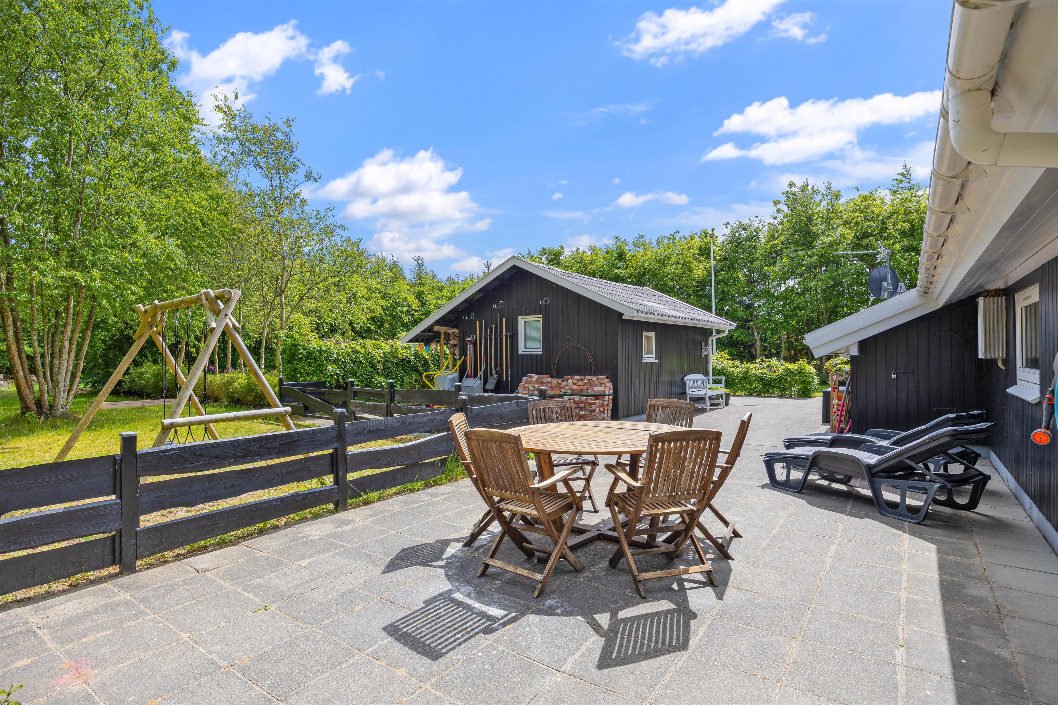 De solrige feriedage kan nydes på sommerhusets imponerende 2.457 m² store naturgrund – perfekt til afslapning og leg i det fri.Noget af haven er yderligere lukket af, med et 80cm højt hegn, og yderligere er der skjulte trådnette i hækken. Slå jer ned på den hyggelige terrasse, hvor komfortable havemøbler og liggestole står klar, så I kan læne jer tilbage og nyde feriestemningen i fulde drag. Når aftenen falder på, kan I tænde op i elgrillen og tilberede et lækkert måltid til hele familien – en skøn måde at runde dagen af på under åben himmel.