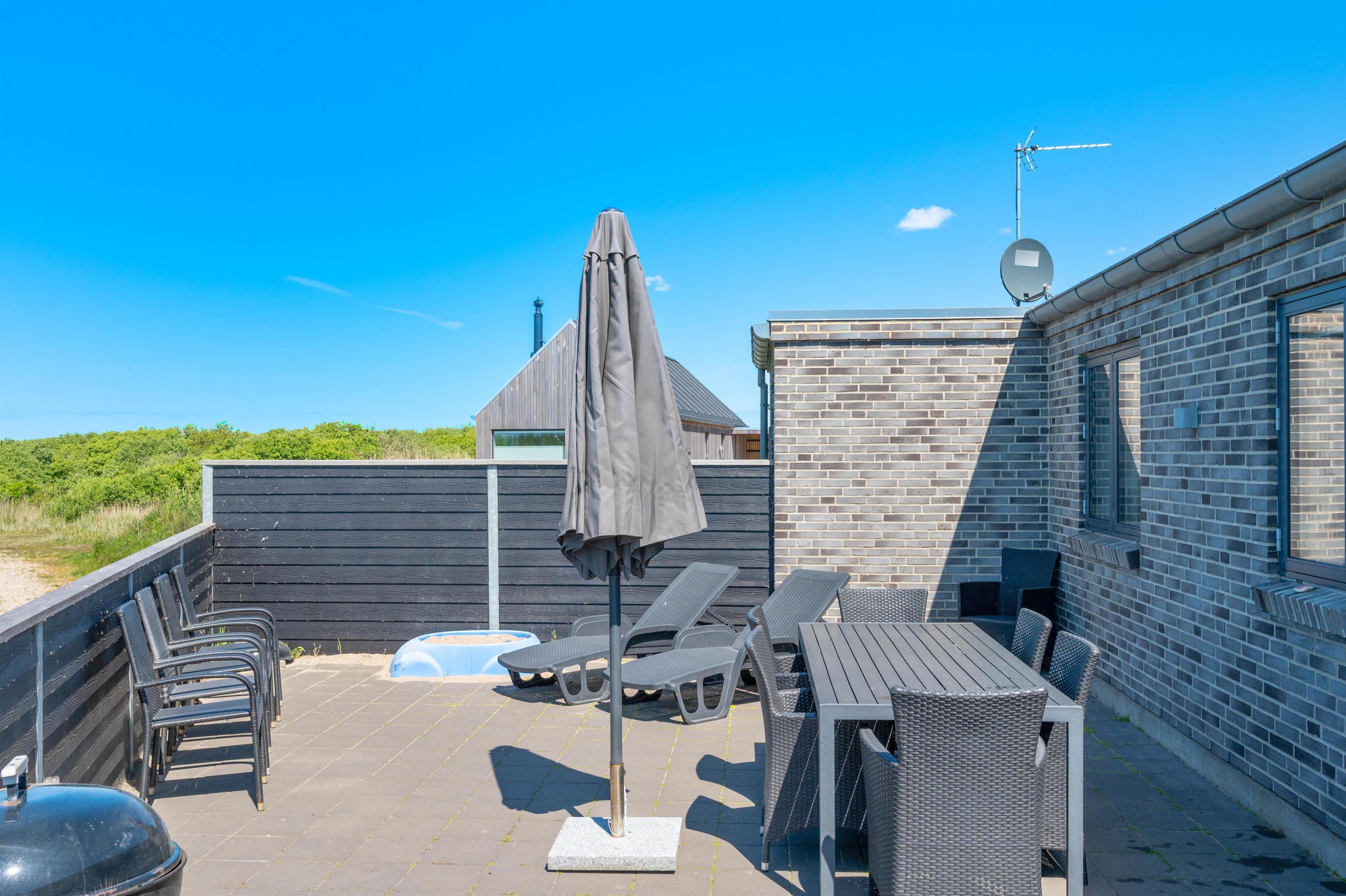 Ferielivet og den flotte natur kan også nydes ude på terrasserne. Her vil du sikkert rykke ud, så snart vejret tillader det. Og skulle der alligevel komme en byge, kan du sætte dig på den overdækkede terrasse og fortsætte den hyggelige grillaften.