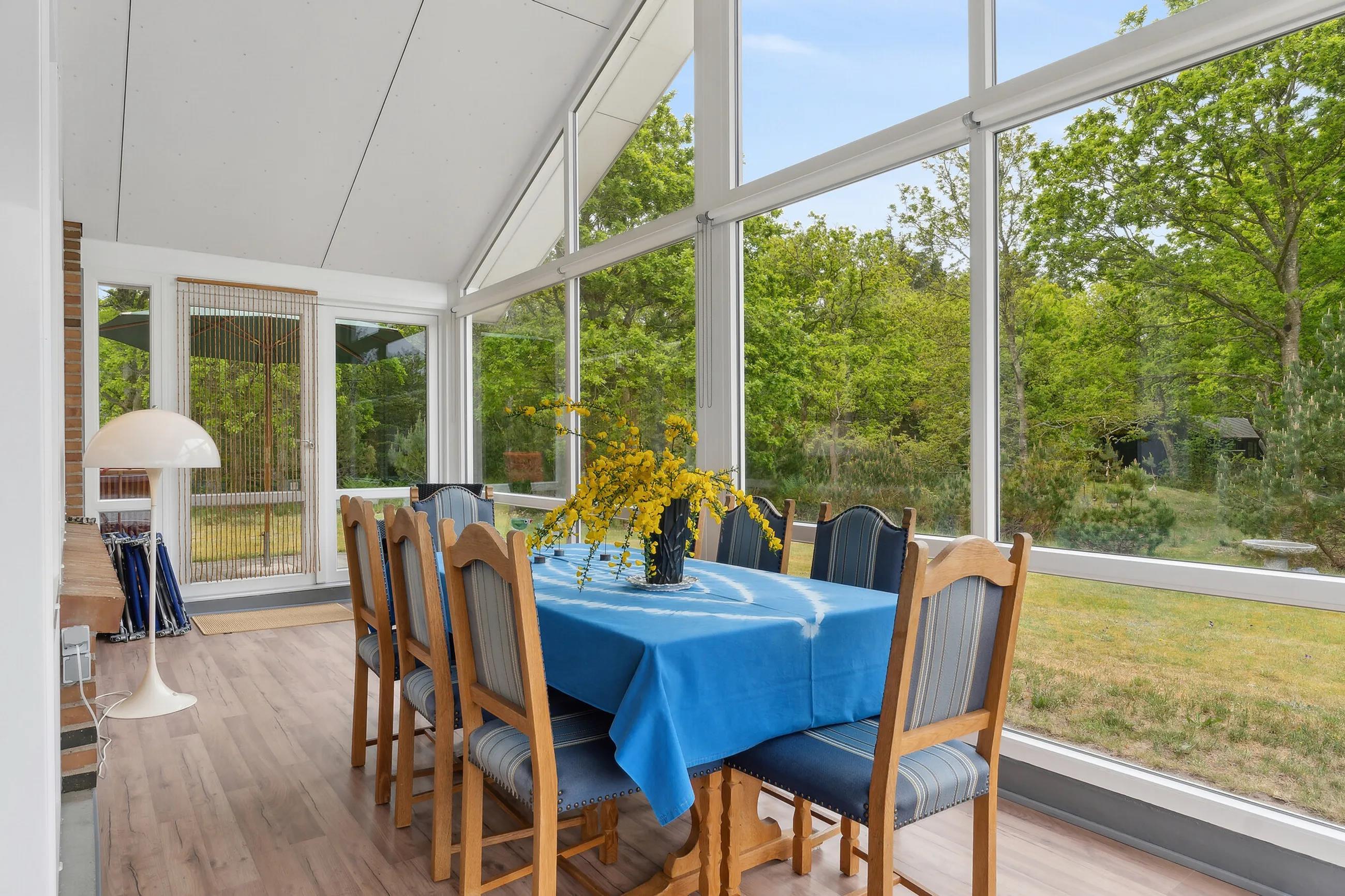 Hvis vejret er imod jer, kan I tilbringe tid i udestuen, der har et behageligt lysindfald og en flot udsigt over den naturrige have.