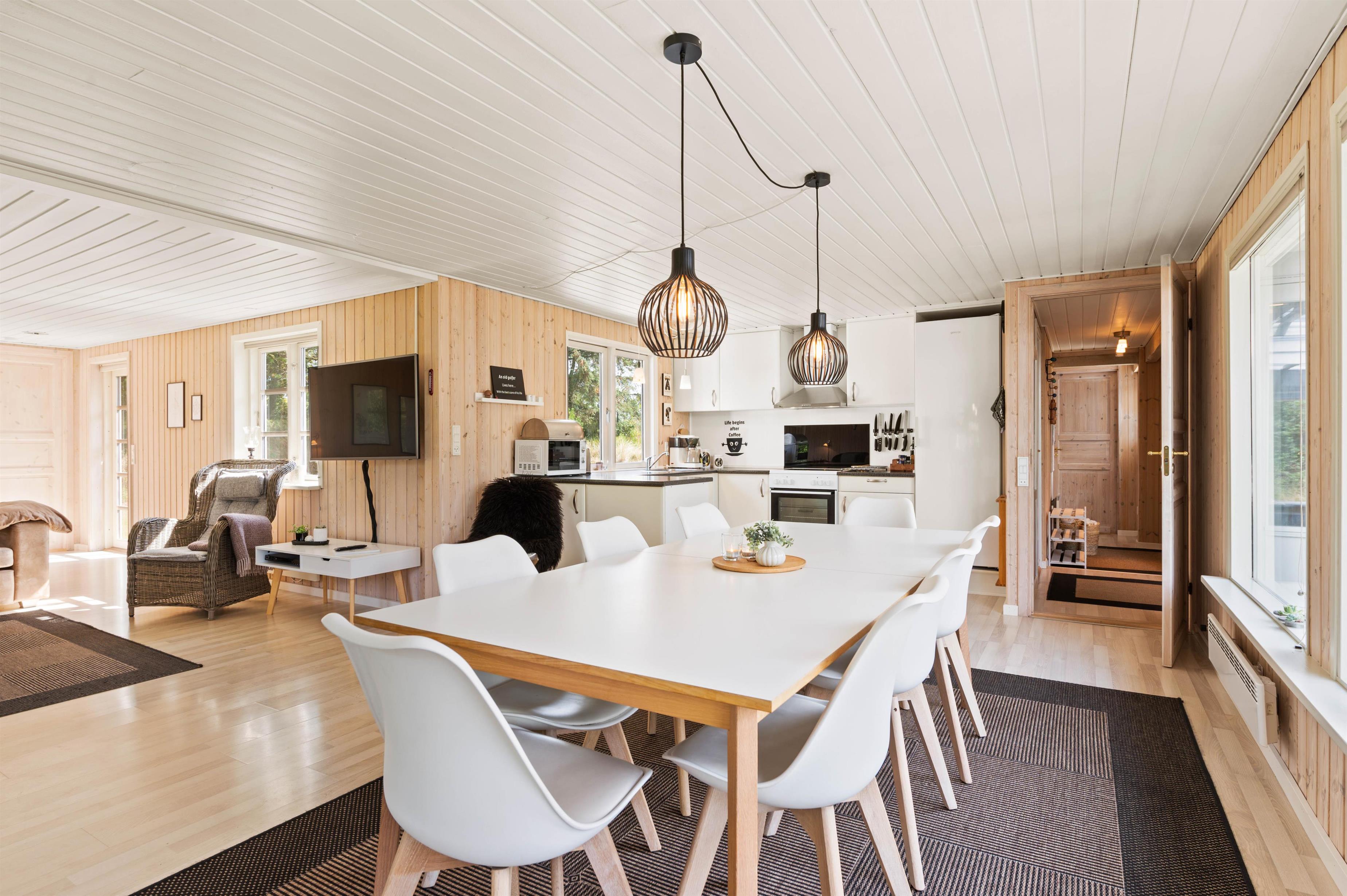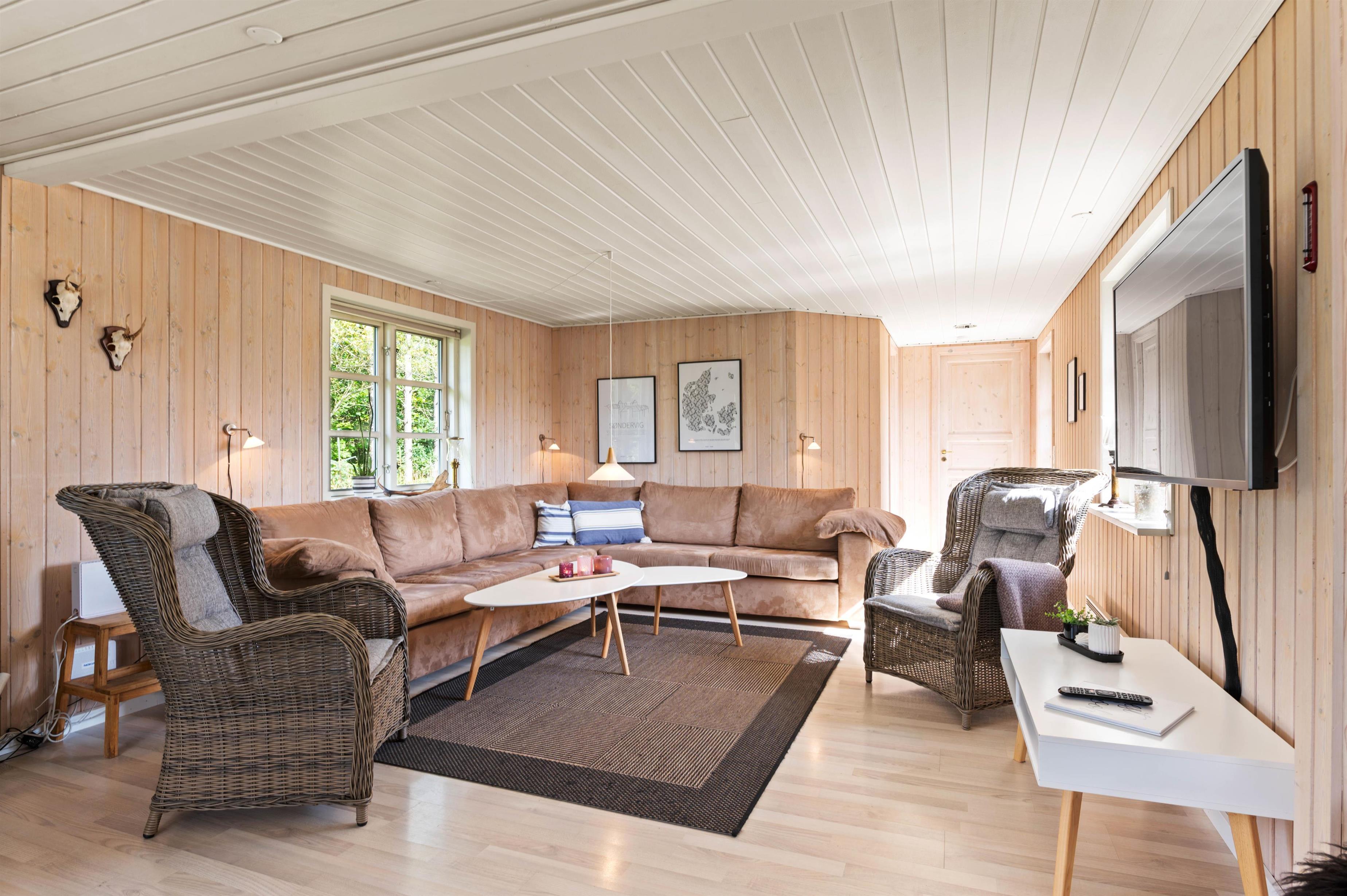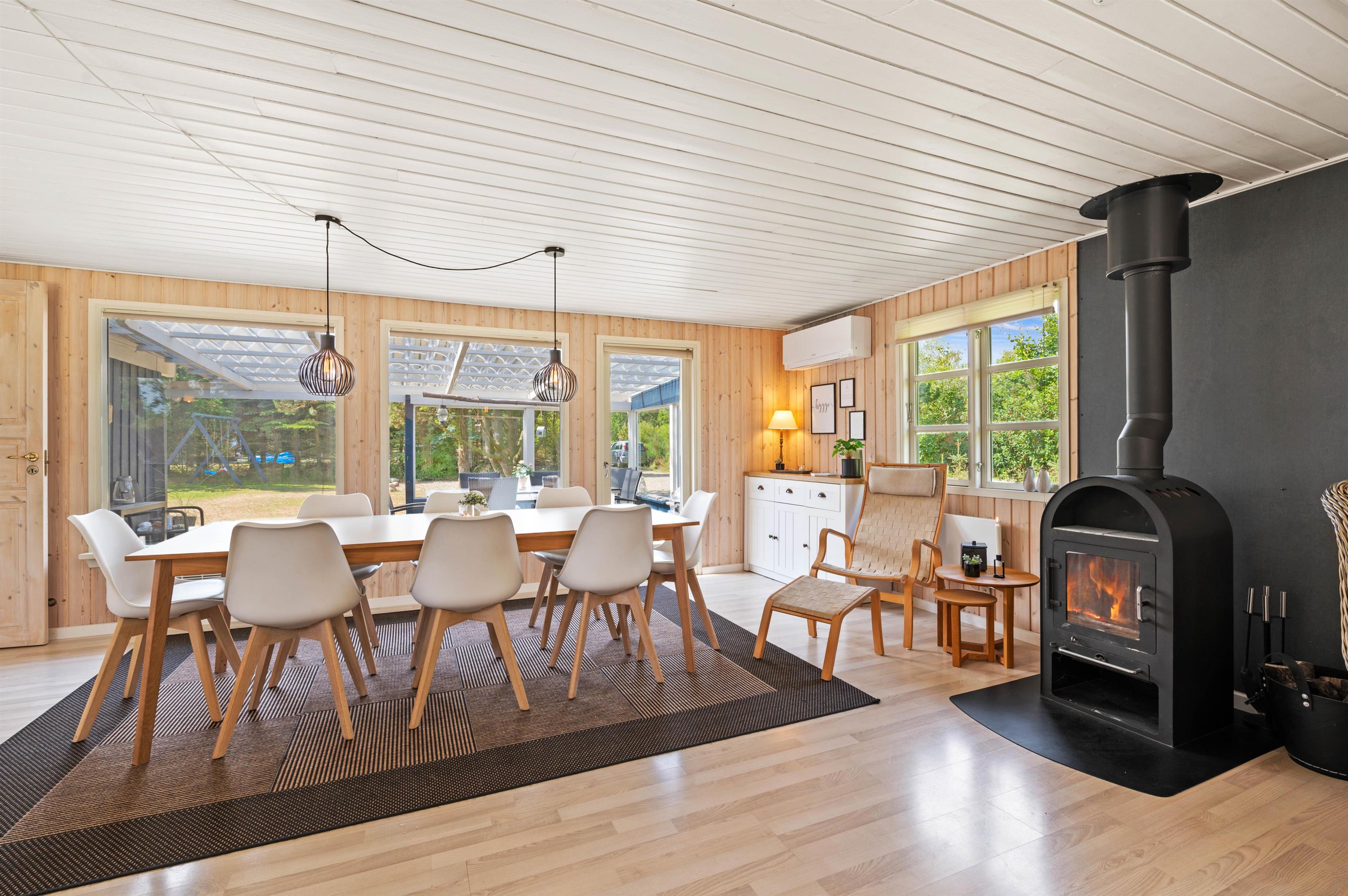 På Risbjergvej 21 er der lagt stor vægt på, at I skal føle jer hjemme. Indretningen er både lys og indbydende med masser af træelementer og en afbalanceret kombination af moderne møbler og klassisk sommerhuscharme med et hav af små, fine detaljer. Her kan I give jer selv lov til at koble helt fra og komme ned i gear. Tænd op i brændeovnen og lyt til de knitrende flammer, mens I slapper af på sofaen, eller sæt jer til rette i det boblende spabad eller den varme sauna og drøm jer langt væk fra den travle hverdag.