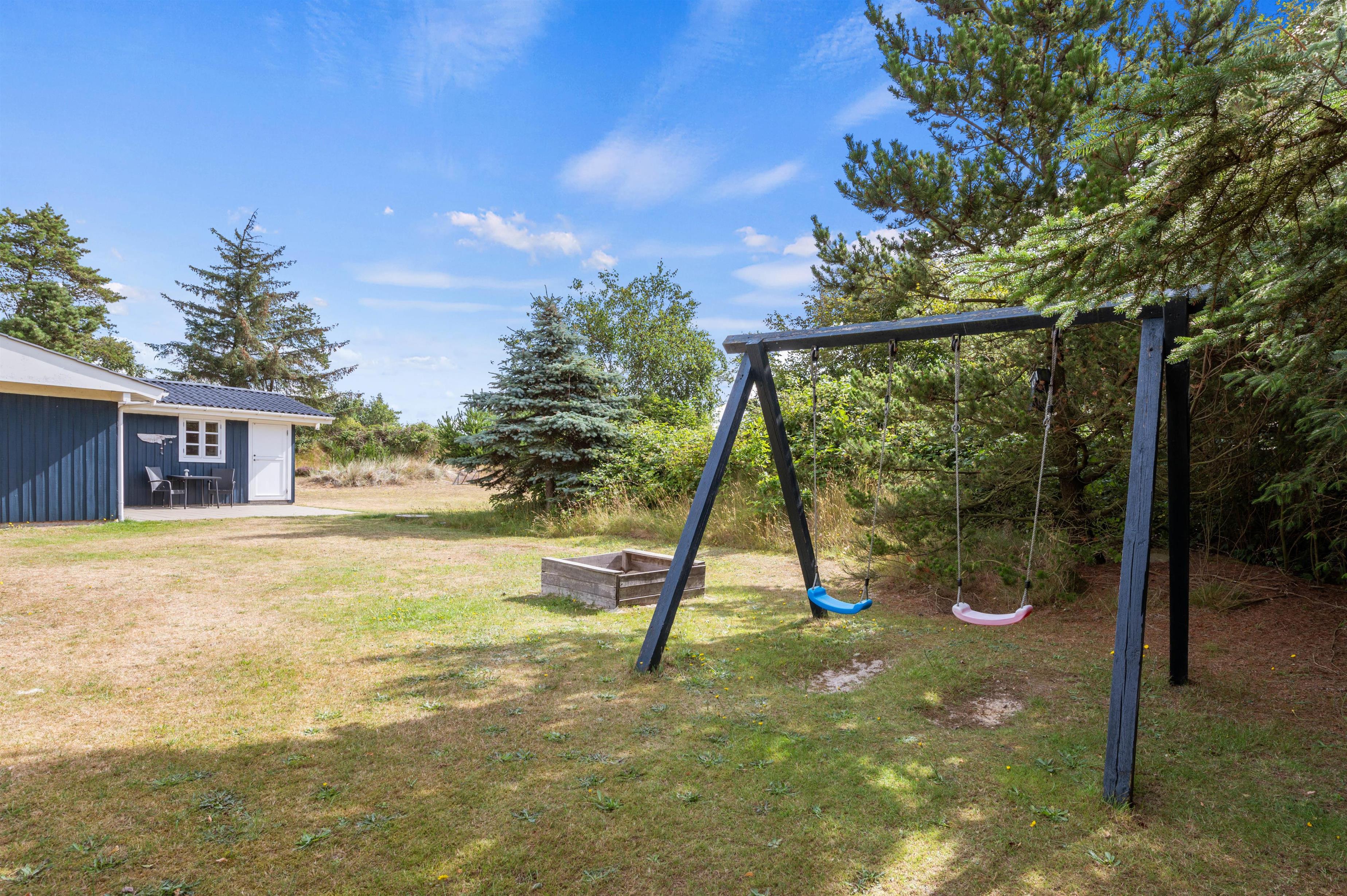 Feriehuset ligger på en stor naturgrund for enden af en rolig stikvej, og rundt om huset finder I 3 skønne terrasser, hvorfra I kan nyde de smukke omgivelser og den friske luft dagen lang. Den overdækkede og afskærmede terrasse fungerer næsten som udestue og giver jer både ly og læ i alle årets måneder. Rundt om havebordet kan I drikke en nybrygget kop kaffe, mens I holder øje med børnene, som leger på den store græsplæne med gyngestativ, sandkasse og fodboldmål.