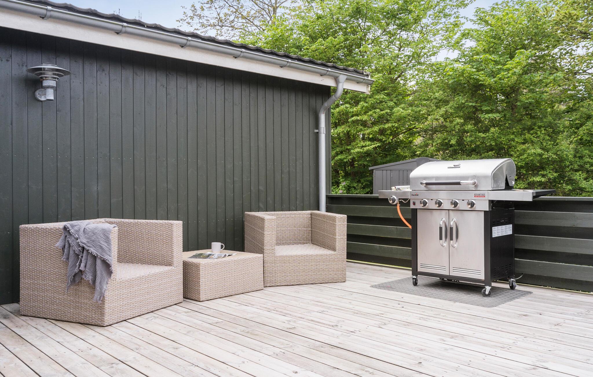Husets perle er den store, solrige terrasse, som bliver jeres anden stue, når vejret er godt. Begynd dagen med en friskbrygget kop kaffe, tag morgenmaden med udenfor og lad børnene gå fra bordet, så de kan gå på opdagelse i haven og brænde energi af på trampolinen. Hvis vejret holder hele dagen, kan I fyre op i grillen og runde en smuk sommerdag af med saftige bøffer under den lune aftensol.