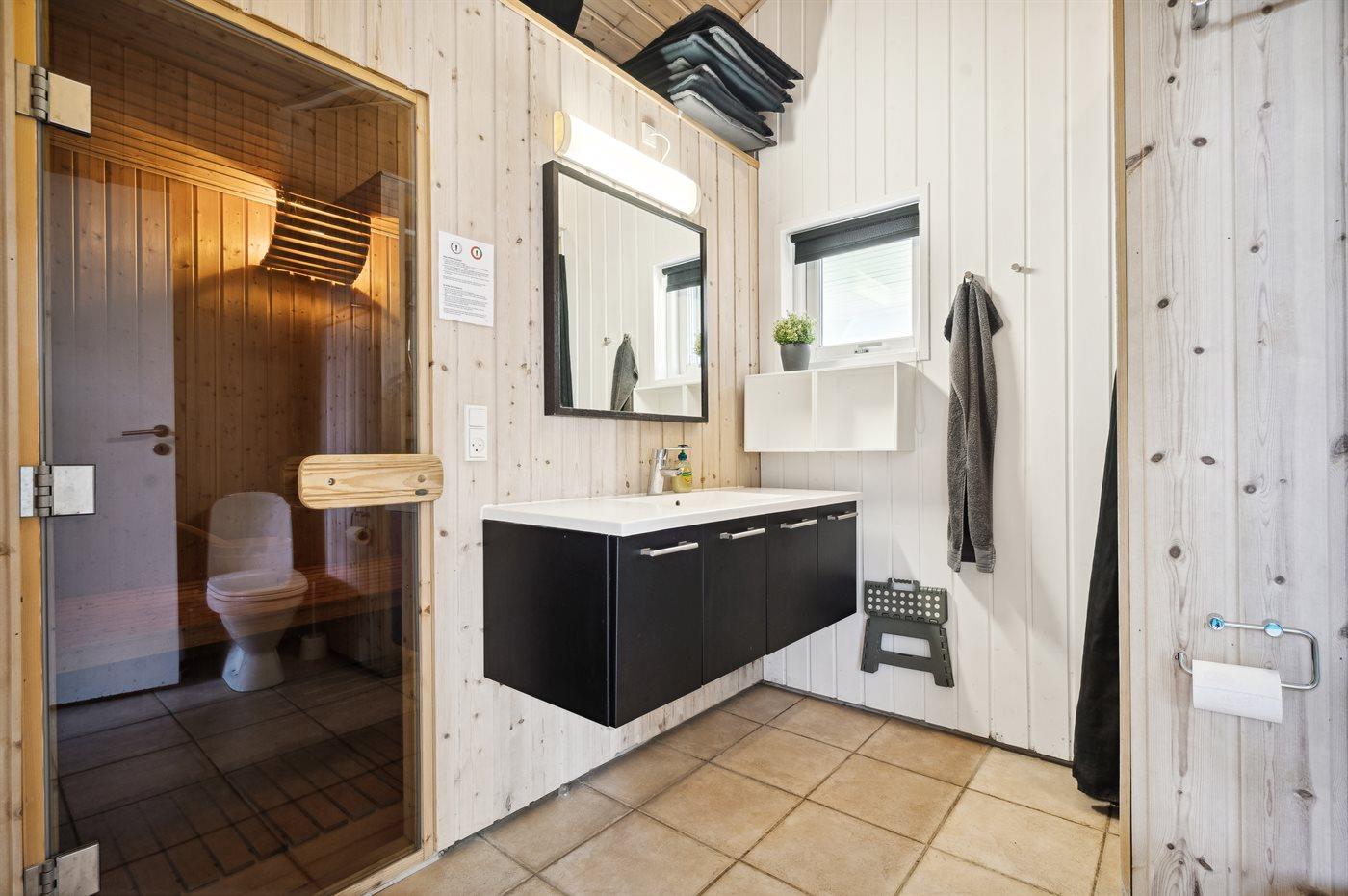 Der er 2 badeværelser med bruseniche og 2 toiletter. Der er gulvvarme på 2 badeværelser. I saunaen er der mulighed for afslapning.