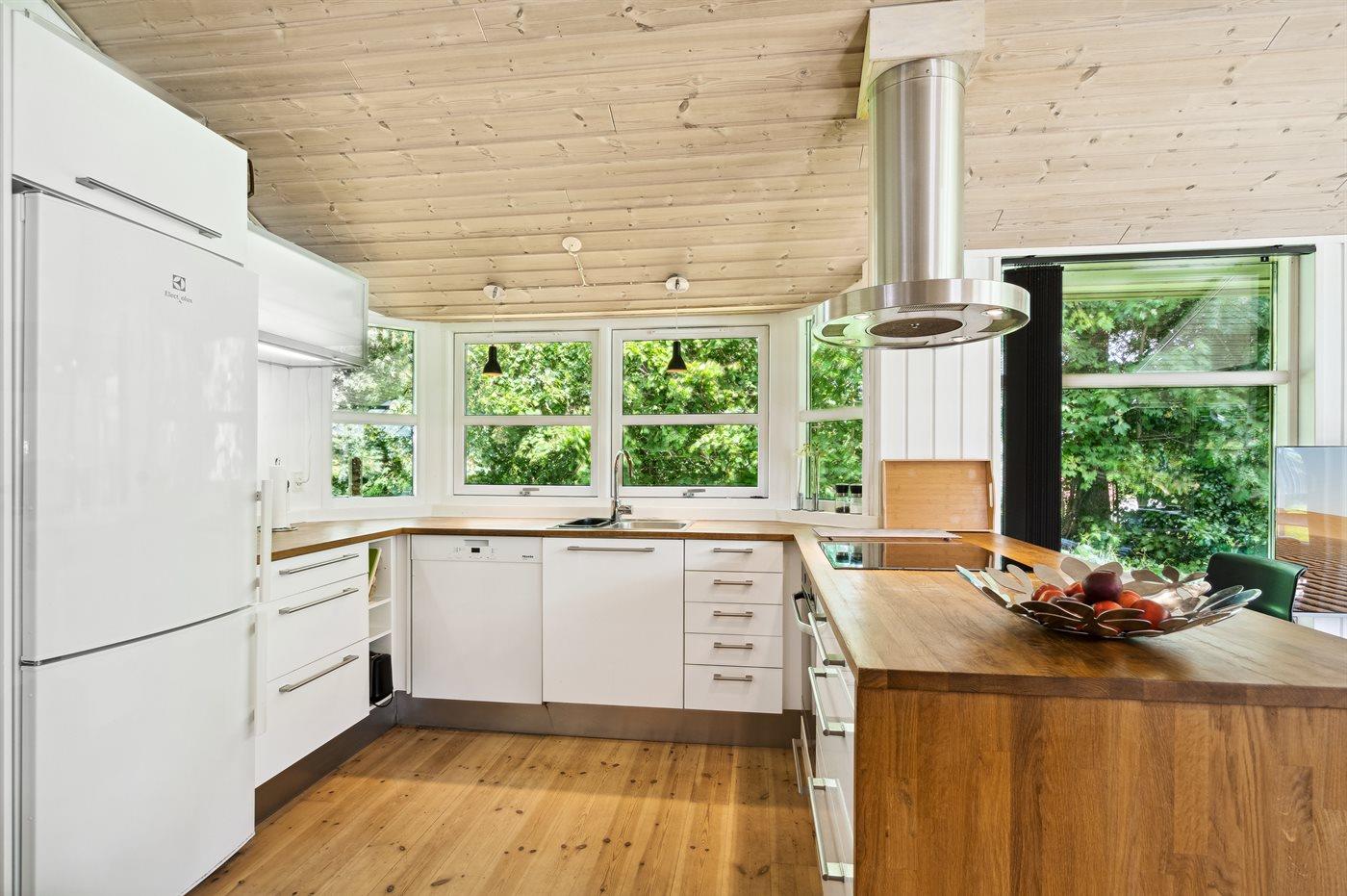 Køkkenet er udstyret med 1 køleskab. Der er 4 induktionskogeplader, varmluftovn, mikrobølgeovn samt opvaskemaskine.