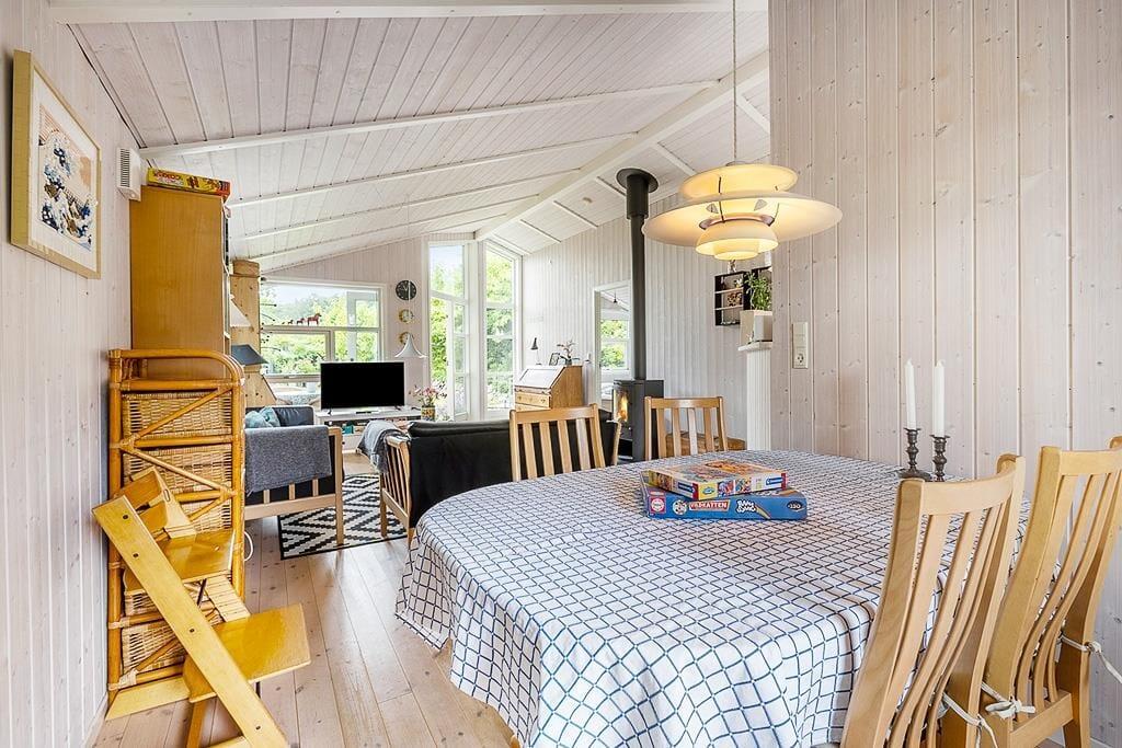 Indenfor mødes du af en varm og indbydende stemning, hvor indretningen emmer af klassisk sommerhushygge. Her er der plads til at trække stikket og nyde hinandens selskab, uanset om ferien byder på stille dage eller aktive udflugter. Stuen indbyder til afslappede stunder med en god bog, brætspil og lange snakke, mens lyset strømmer ind og skaber en rolig atmosfære. Efter en dag i den friske luft kan du forkæle dig selv med ren velvære i husets spabad og sauna – perfekt til at løsne musklerne og lade feriestemningen brede sig i kroppen. Det er nemt at forestille sig, hvordan skuldrene sænker sig, mens varmen omslutter dig, og hverdagen for alvor slipper sit tag.
