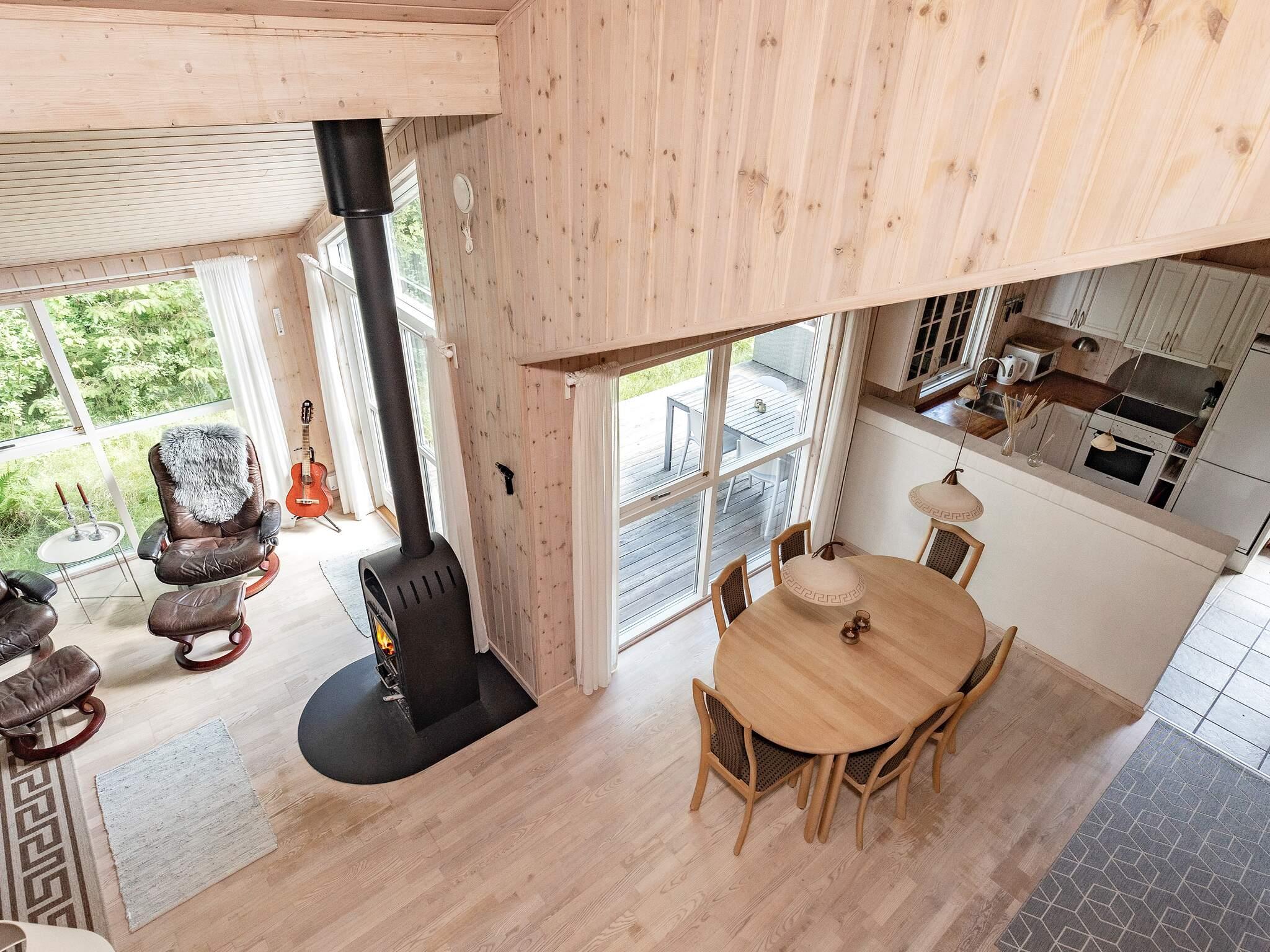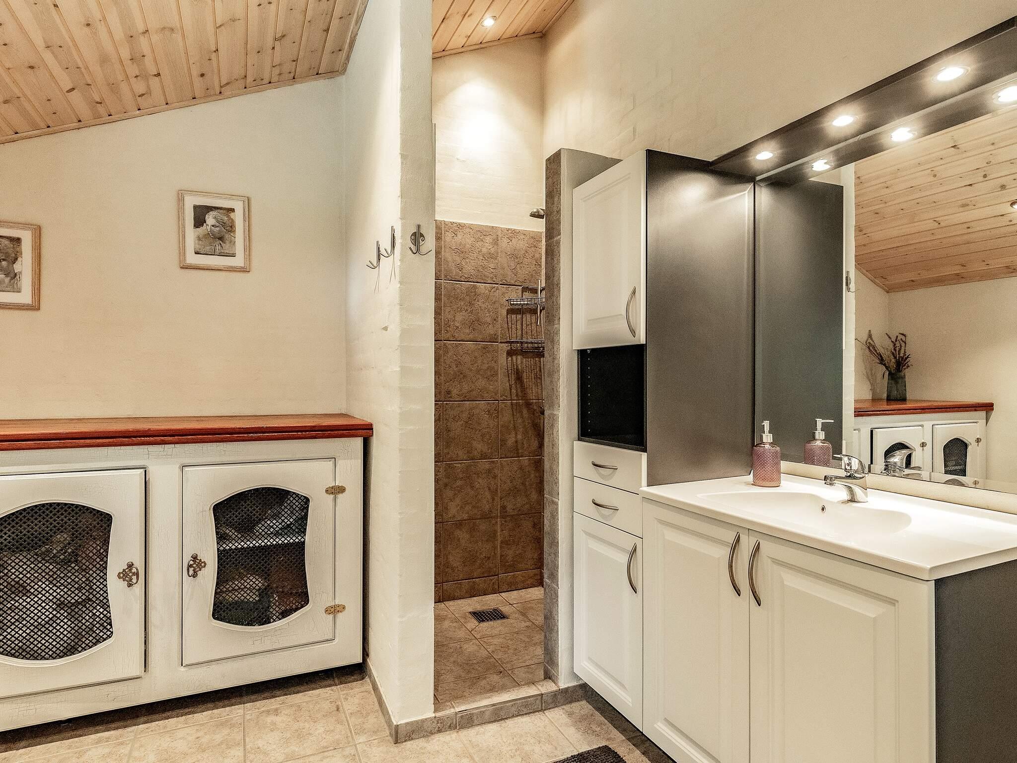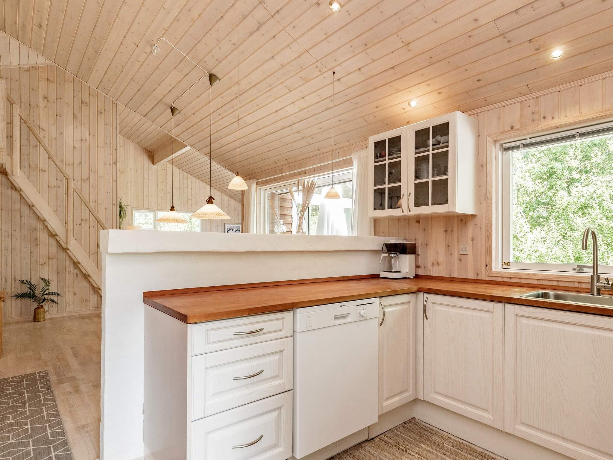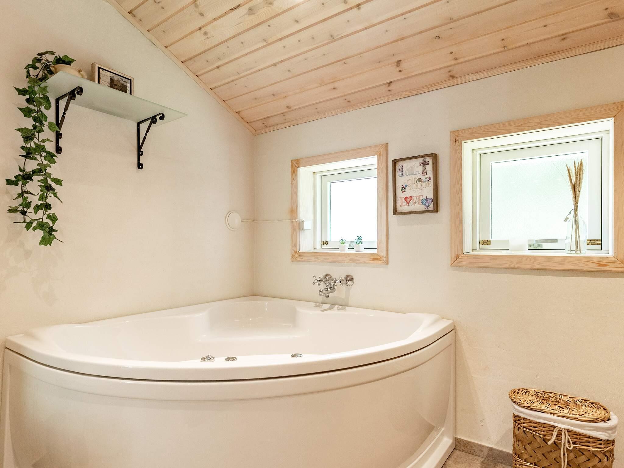 Sommerhuset er velindrettet og funktionelt med både gæstetoilet og stort badeværelse med spabad. Gæsterne kan nyde wellness og afslapning direkte i huset uden at skulle køre nogen steder. Det praktiske køkkenområde er åbent til stuen, hvilket gør det til det ideelle sted for familieliv, måltider sammen eller afslapning ved bålet.