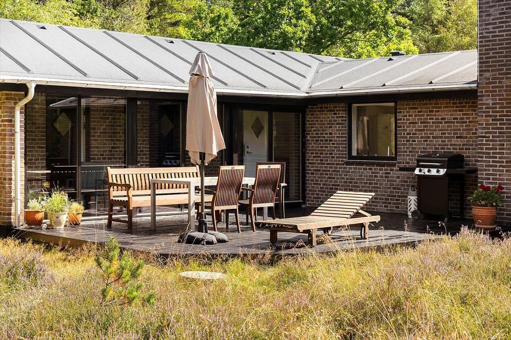 Sommerhusets terrasse indbyder til afslappede feriestunder fra morgen til aften. Her kan du nyde din morgenkaffe i solen, samle familien til frokost under åben himmel eller grille aftensmaden på de lange lyse sommeraftener. Udeområdet er omkranset af smuk natur og giver mulighed for både afslapning og leg – uanset om det er børnene, der boltrer sig, eller de voksne, der ønsker en fredelig stund med udsigt til de grønne omgivelser.