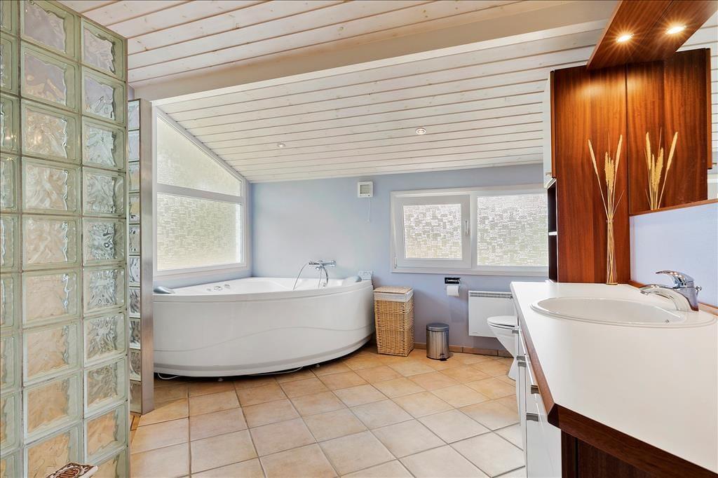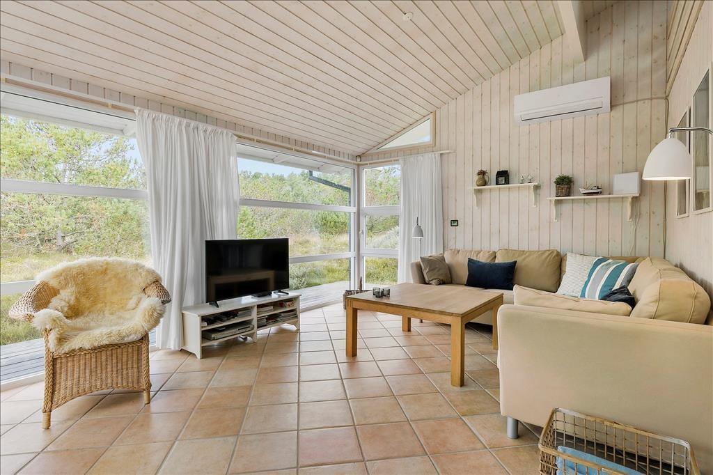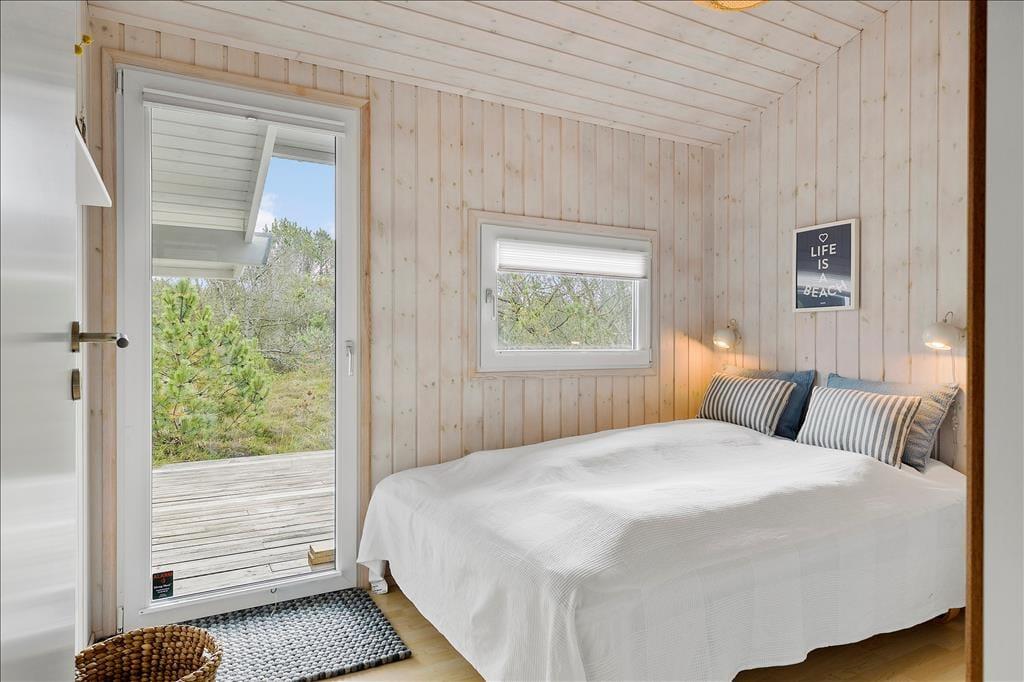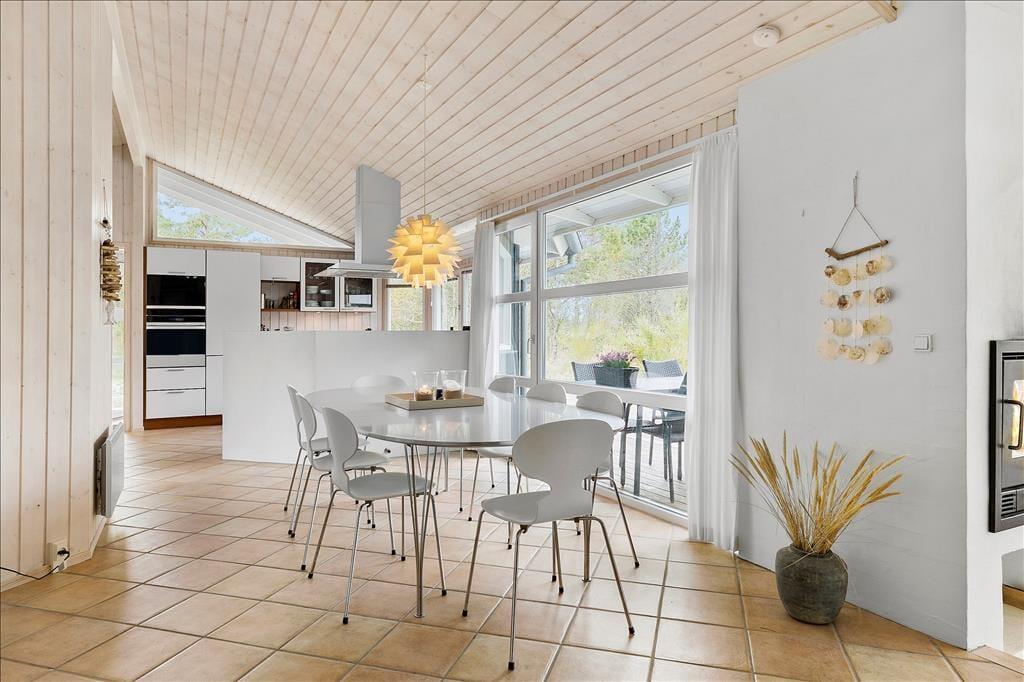 Så snart du træder ind i sommerhuset, mærker du, hvordan roen sænker sig. Det store vinduesparti i opholdsrummet trækker naturen med helt ind i stuen, og de lyse lofter til kip skaber luft og rummelighed, mens den varme glød fra brændeovnen indbyder til hyggelige timer med spil, snak og nærvær. Indretningen er enkel og venlig, med et åbent køkken-alrum, hvor du nemt kan kokkerere feriens måltider uden at gå glip af selskabet. På hemsen kan børn eller teenagere trække sig tilbage med en film, og to badeværelser – det ene med både spa og sauna – sikrer, at hele familien kan forkæles efter en lang dag ude i det fri. Her får du en feriebolig, hvor det er nemt at føle sig hjemme.