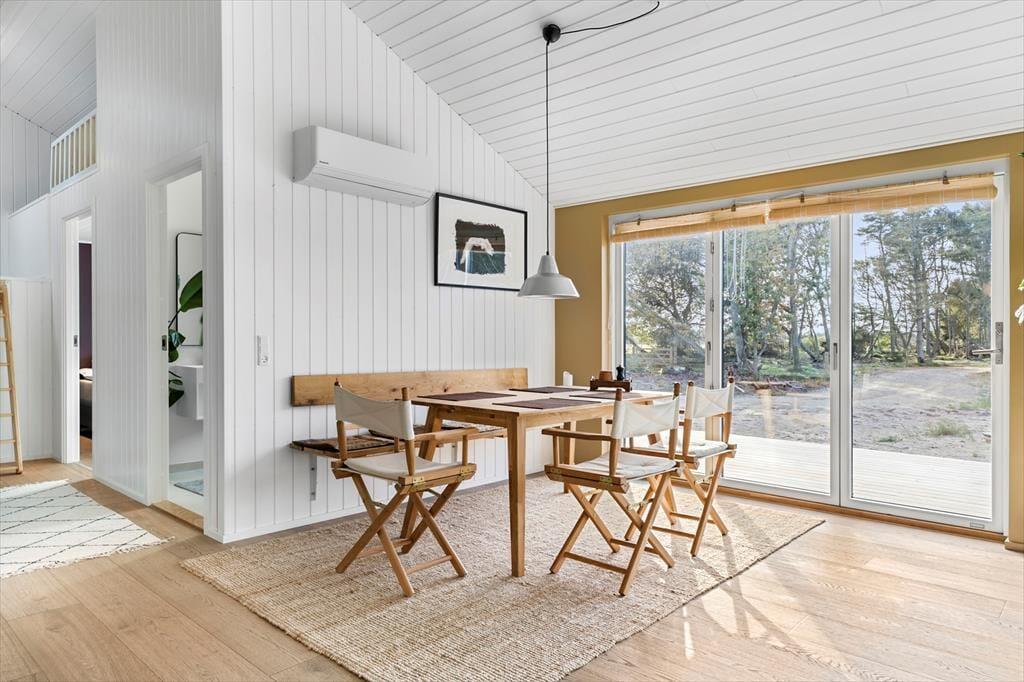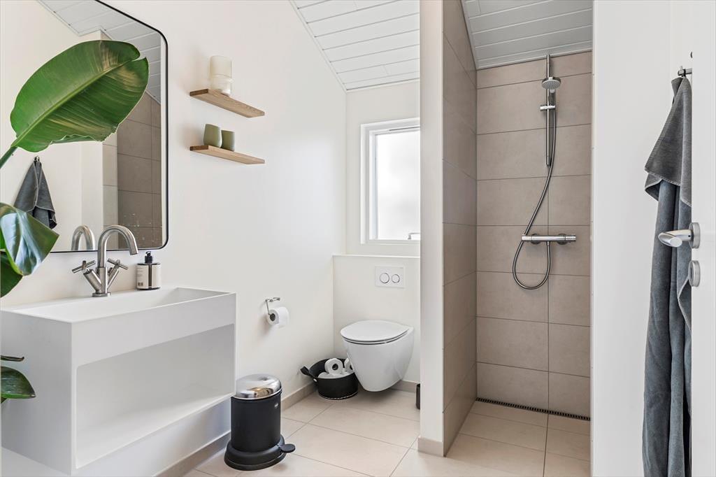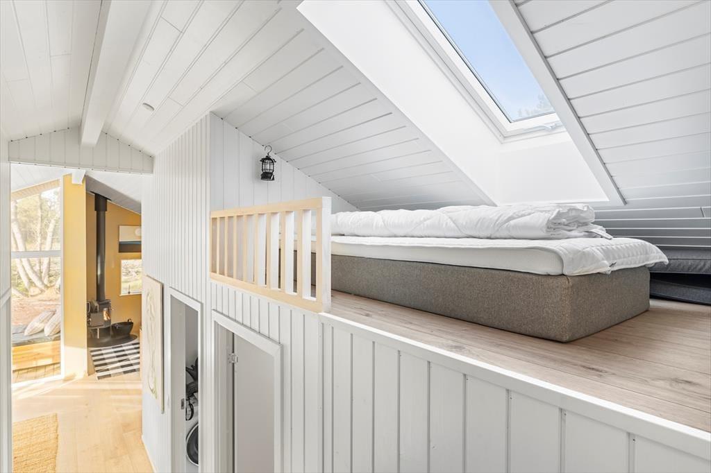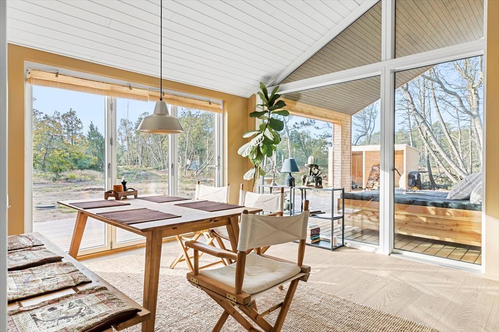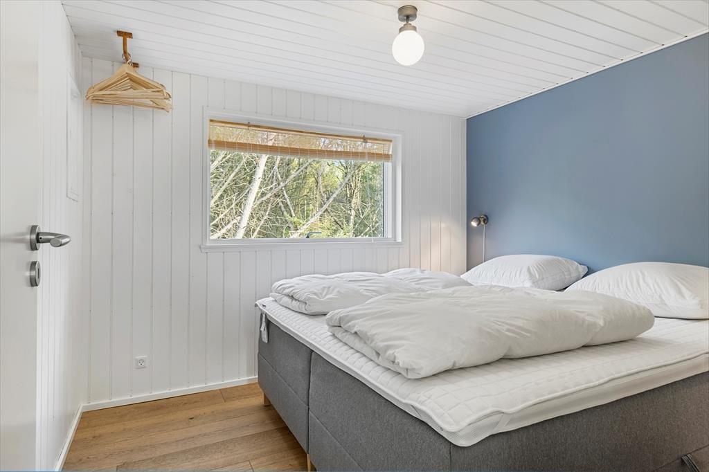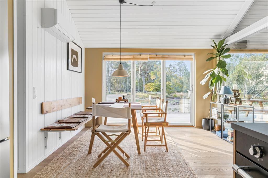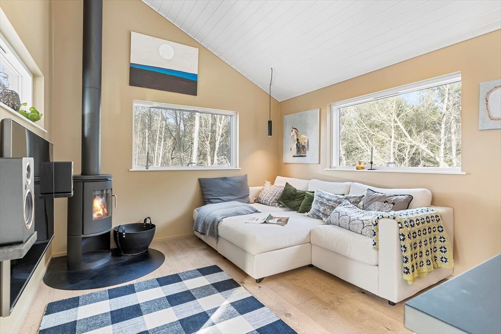Når du træder ind i sommerhuset, bliver du straks mødt af en varm og indbydende stemning. Loftet til kip og det store vinduesparti i stuen giver masser af lys og luft, så du næsten føler, at naturen inviterer sig selv med indenfor. Indretningen er enkel og hyggelig, hvilket giver plads til, at feriedagene kan fyldes med nærvær, afslapning og samvær. Her kan I samles omkring middagsbordet, mens solen falder ind gennem vinduerne, eller finde ro i sofahjørnet med en bog, når dagens oplevelser skal fordøjes. Badeværelset er rummeligt og praktisk indrettet, så hele familien kan starte dagen med en frisk omgang morgenbad, inden turen går ud i det blå.
