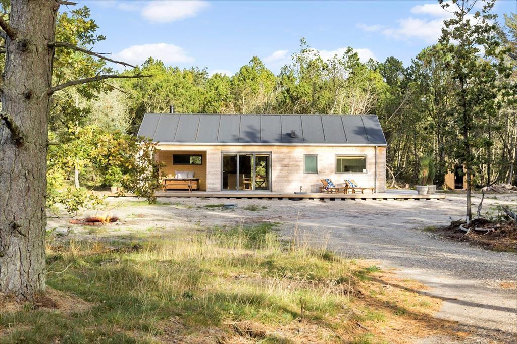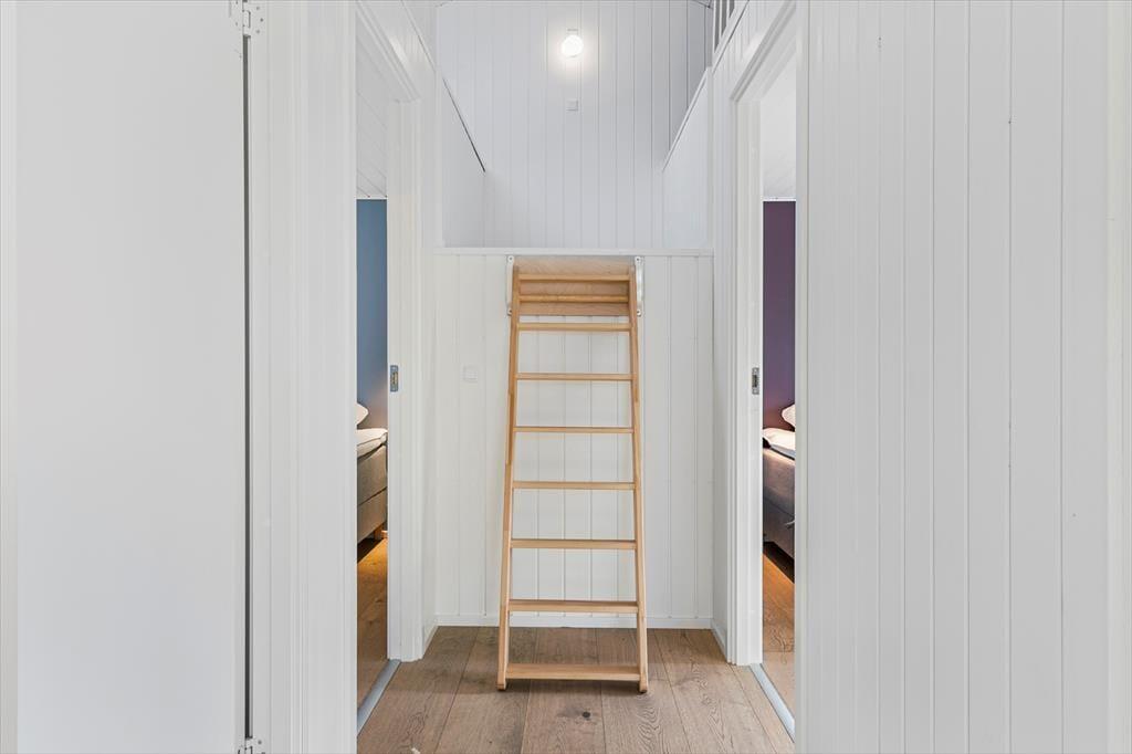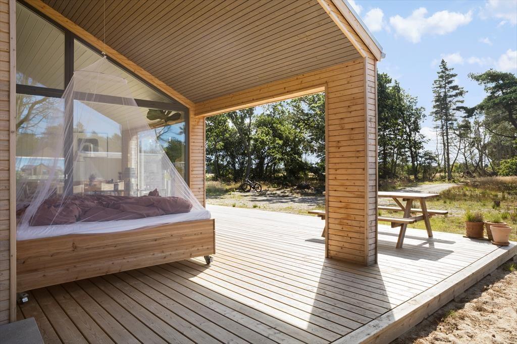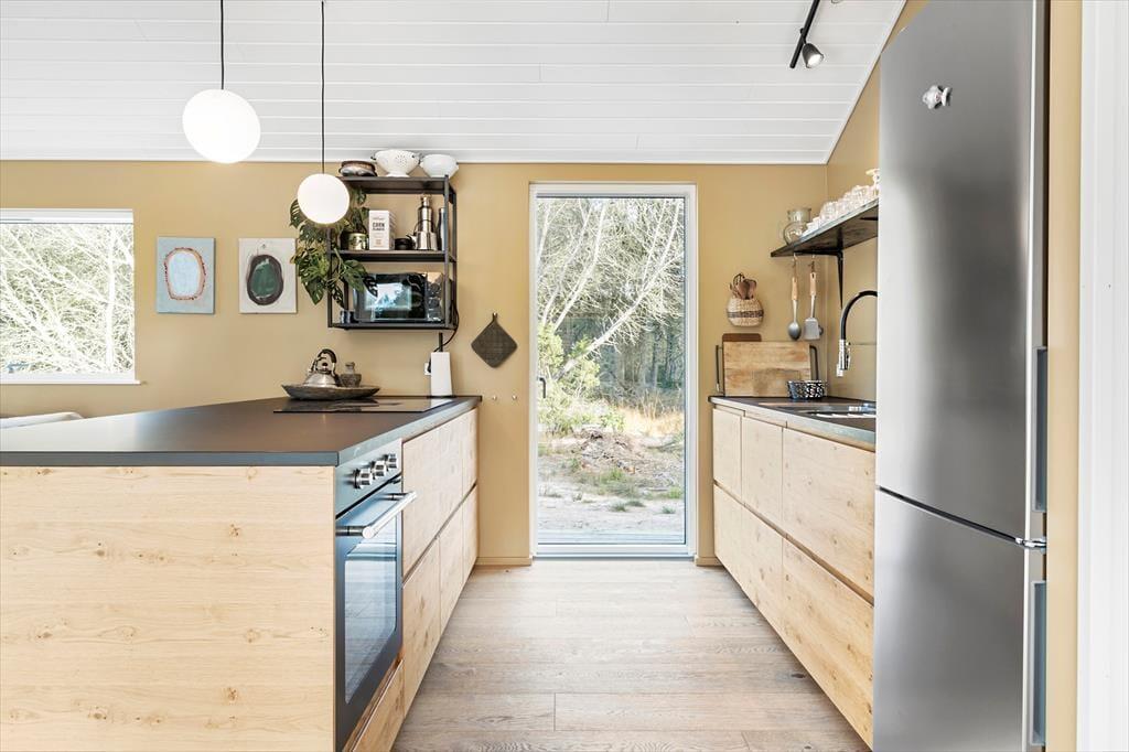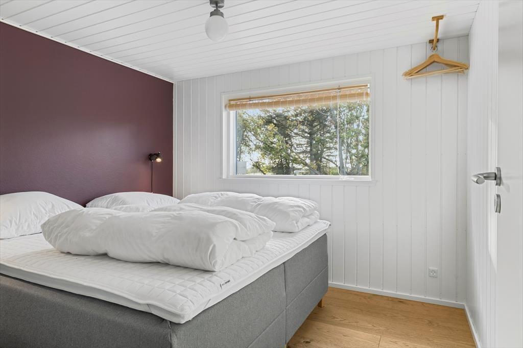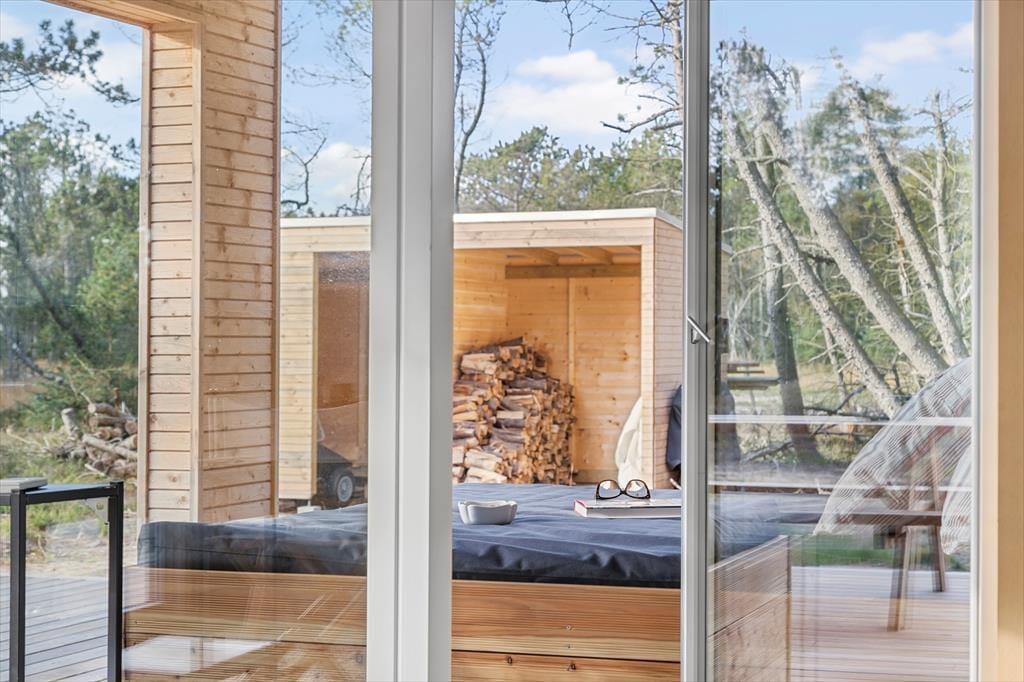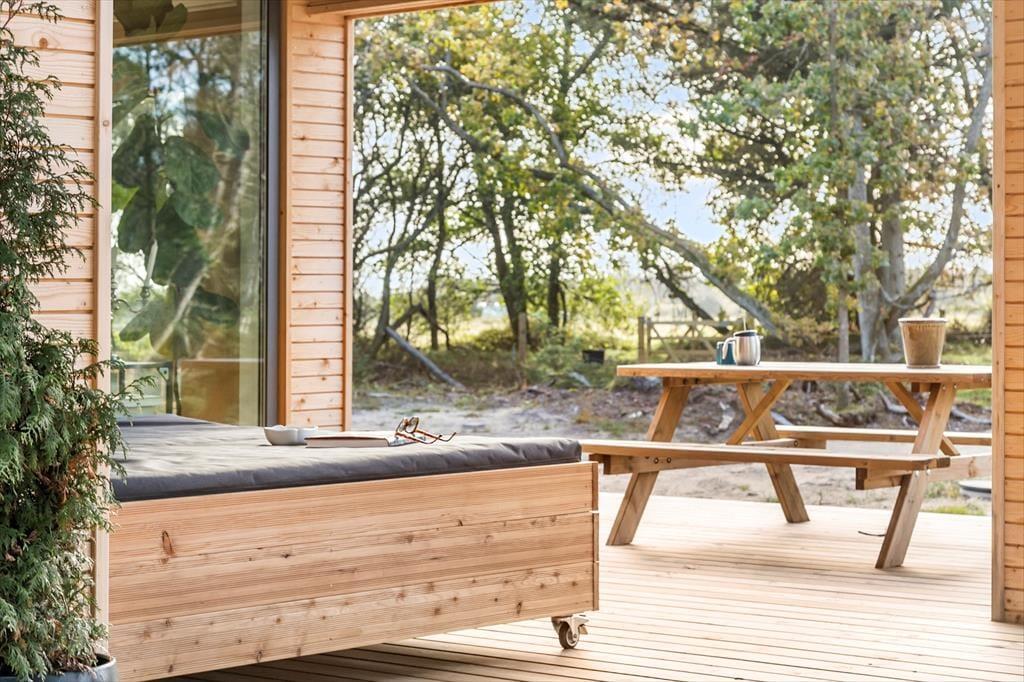 Når du træder ind i sommerhuset, bliver du straks mødt af en varm og indbydende stemning. Loftet til kip og det store vinduesparti i stuen giver masser af lys og luft, så du næsten føler, at naturen inviterer sig selv med indenfor. Indretningen er enkel og hyggelig, hvilket giver plads til, at feriedagene kan fyldes med nærvær, afslapning og samvær. Her kan I samles omkring middagsbordet, mens solen falder ind gennem vinduerne, eller finde ro i sofahjørnet med en bog, når dagens oplevelser skal fordøjes. Badeværelset er rummeligt og praktisk indrettet, så hele familien kan starte dagen med en frisk omgang morgenbad, inden turen går ud i det blå.