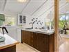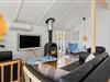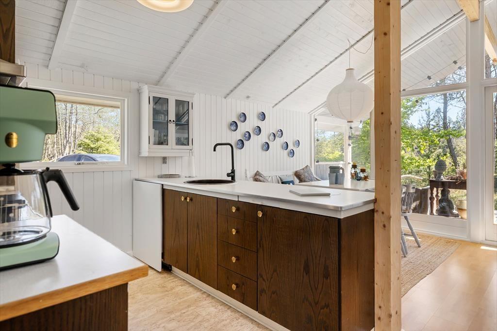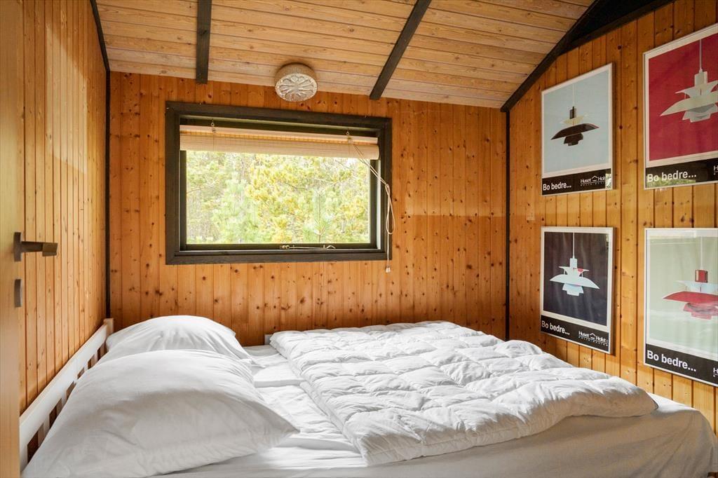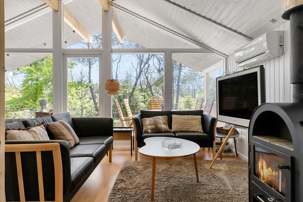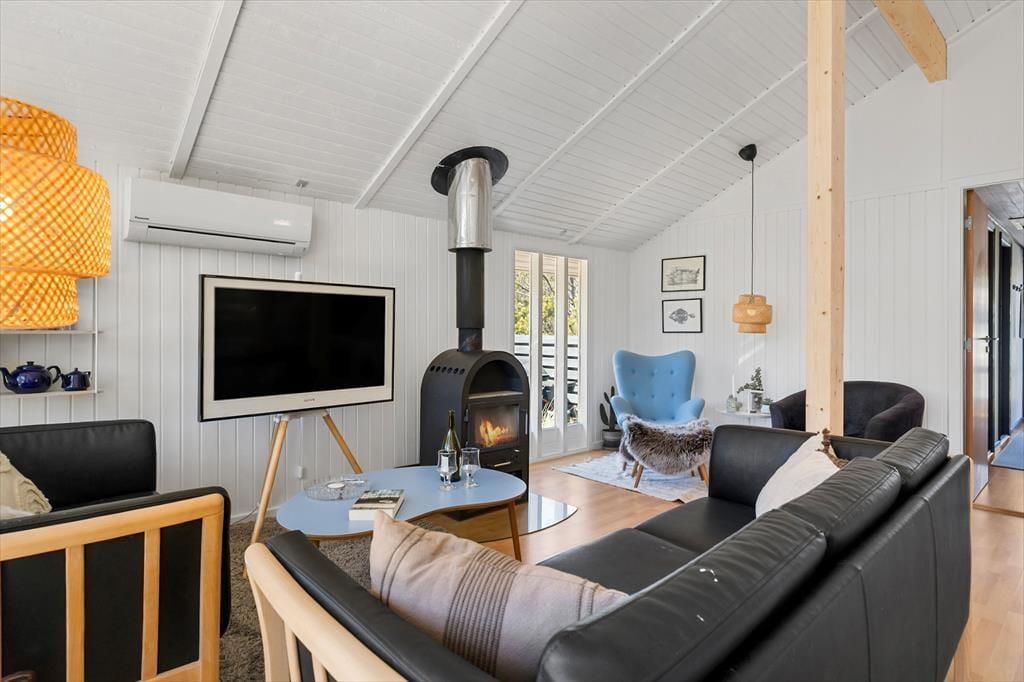 Allerede ved første skridt ind i sommerhuset bliver du mødt af en varm og rolig atmosfære. Her er det lette og lyse interiør i fokus, og det store vinduesparti samt loft til kip skaber en dejlig rumfornemmelse, hvor dagslyset strømmer ind og naturen udenfor bliver en del af oplevelsen indenfor. Den åbne stue gør det nemt at være sammen – uanset om der skal laves mad, hygges med kortspil eller nydes en god film i sofaen. Brændeovnen i stuen sørger for varme og ekstra hygge, når mørket falder på, og det knitrende ildsted samler hele familien om aftenerne. Sommerhuset egner sig perfekt til en familie eller en gruppe på op til seks personer – og din hund er naturligvis også velkommen, så hele flokken kan tage på ferie sammen.