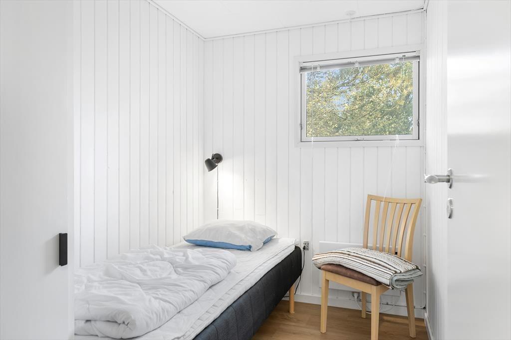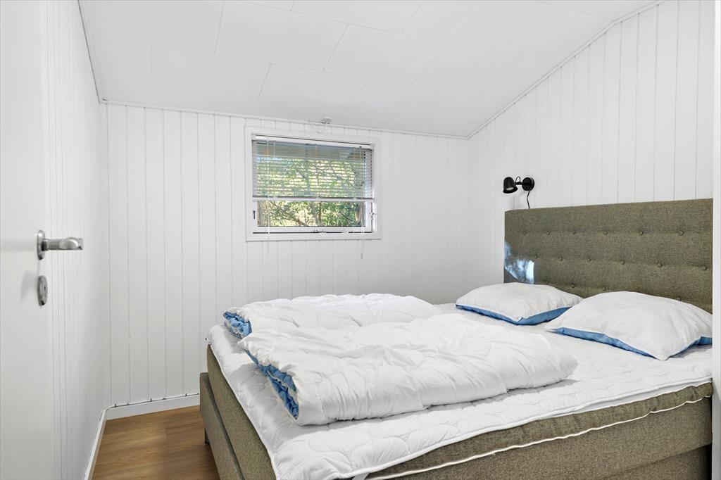 Det første, du lægger mærke til, når du træder ind, er det store vinduesparti i stuen, som lukker dagslyset ind og giver et skønt kig ud i den grønne natur. Sommerhusets indretning er enkel og indbydende – med lyse vægge, åbne rum og en rolig atmosfære, der gør det let at finde sig til rette. Stuen og køkkenet ligger i åben forbindelse, så I kan snakke og lave mad sammen, mens børnene leger eller nogen slapper af med en bog i hjørnet. De tre soveværelser er fordelt, så der både er plads til forældrene, børnene og en ekstra gæst – og med naturen lige udenfor døren er det oplagt at lade vinduerne stå på klem og falde i søvn til lyden af stilhed.