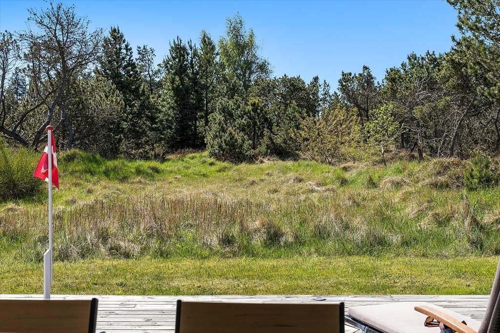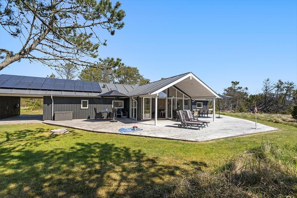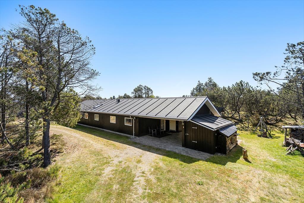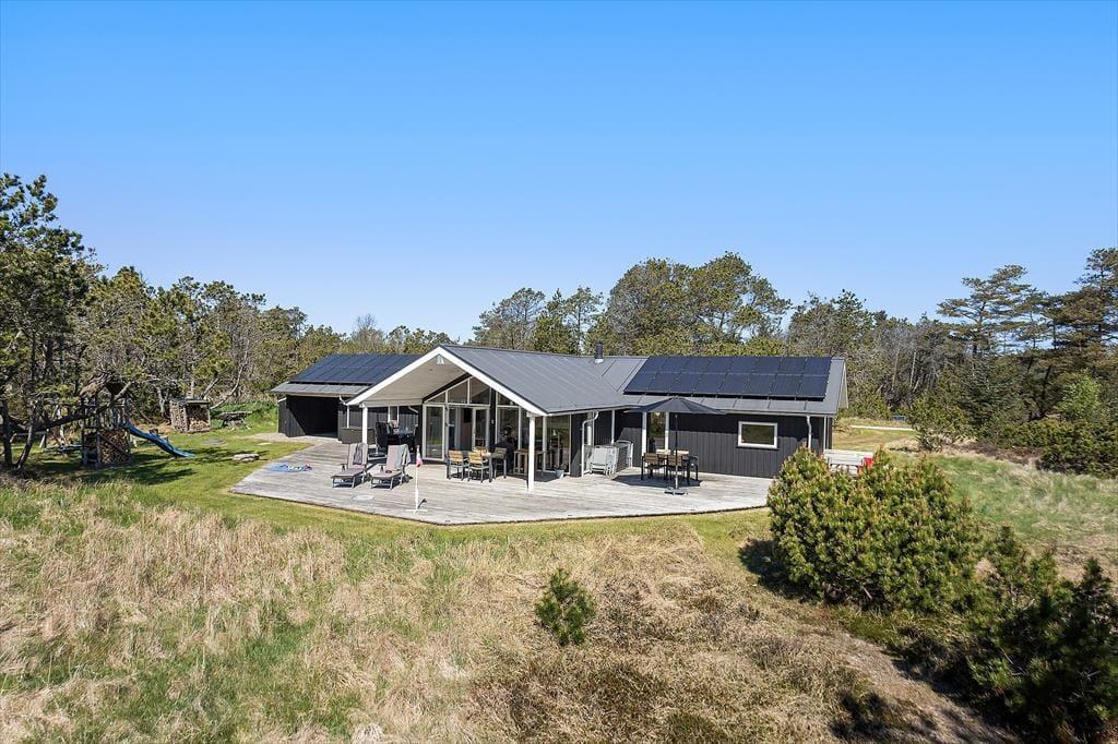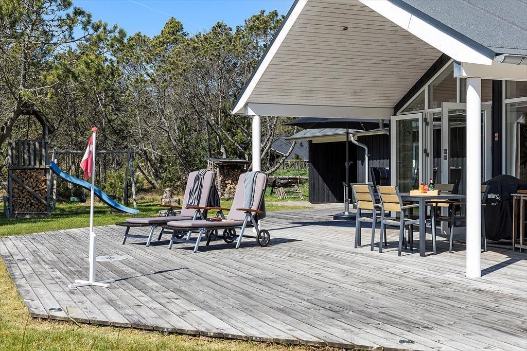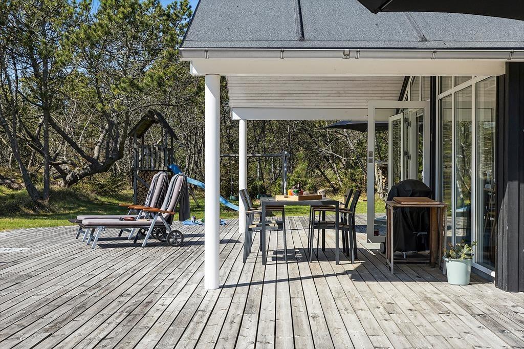 Udendørslivet er i fokus, og det mærker man tydeligt på de dejlige terrasseområder, der omkranser huset og skaber gode rammer for udelivet fra morgen til aften. Her kan du drikke morgenkaffe med udsigt til naturen, tage middagsluren i liggestolen eller tilberede aftensmaden på grillen, mens børnene leger frit på den store græsplæne. Der er gynger, masser af plads til boldspil og rig mulighed for at finde en solrig eller skyggefuld plet, alt efter hvad dagen kalder på. De grønne omgivelser skaber en særlig ro, og med skov, klitlandskab og fuglefløjt i baggrunden føles det helt naturligt at sætte tempoet ned og nyde nuet. De store terrassearealer gør det let at opholde sig udenfor i al slags vejr – og måske frister det endda med et glas vin under åben himmel, mens aftensolen går ned over landskabet.
