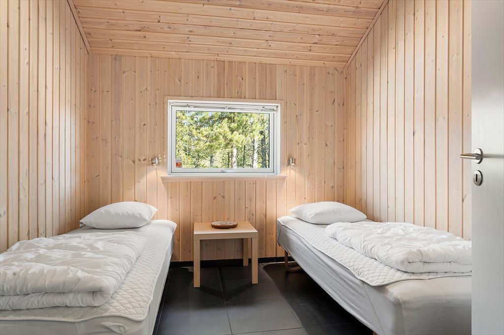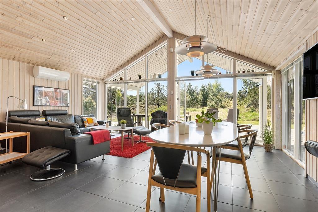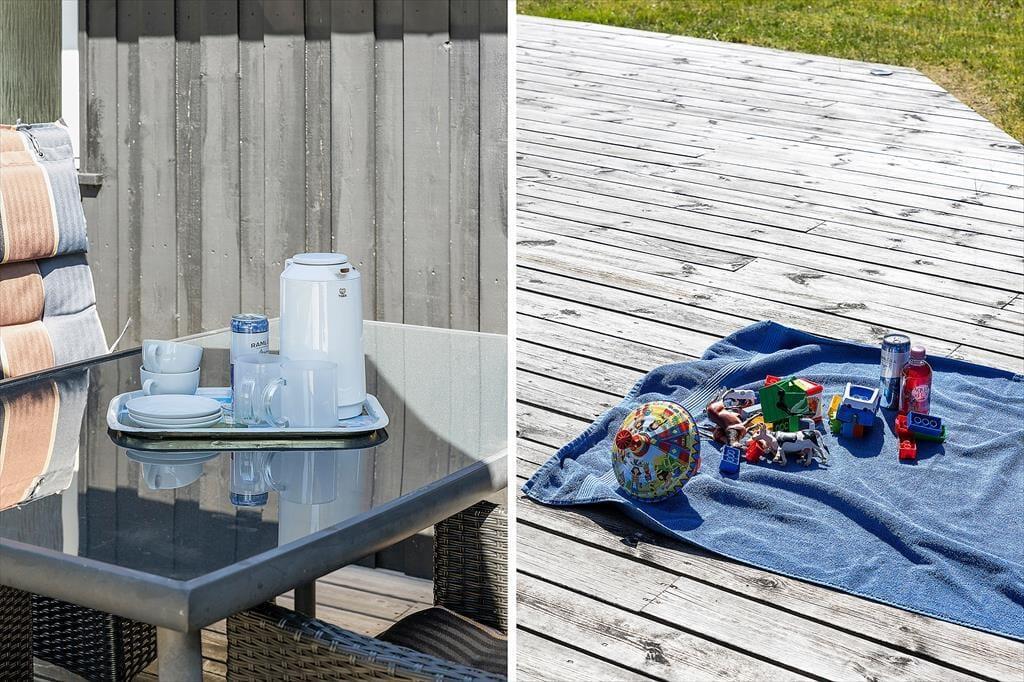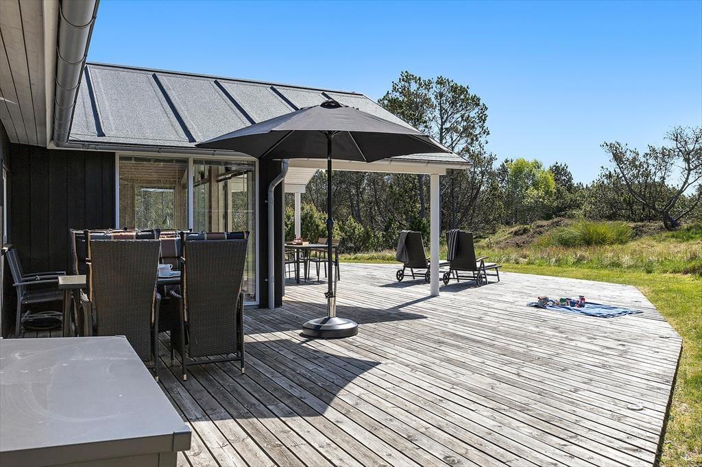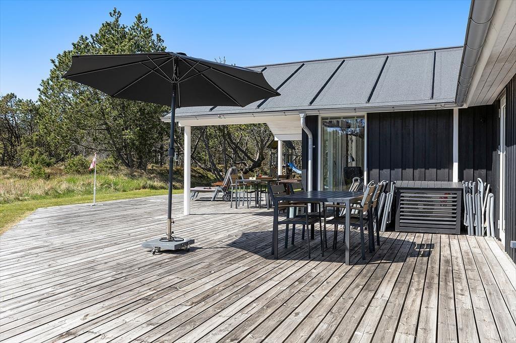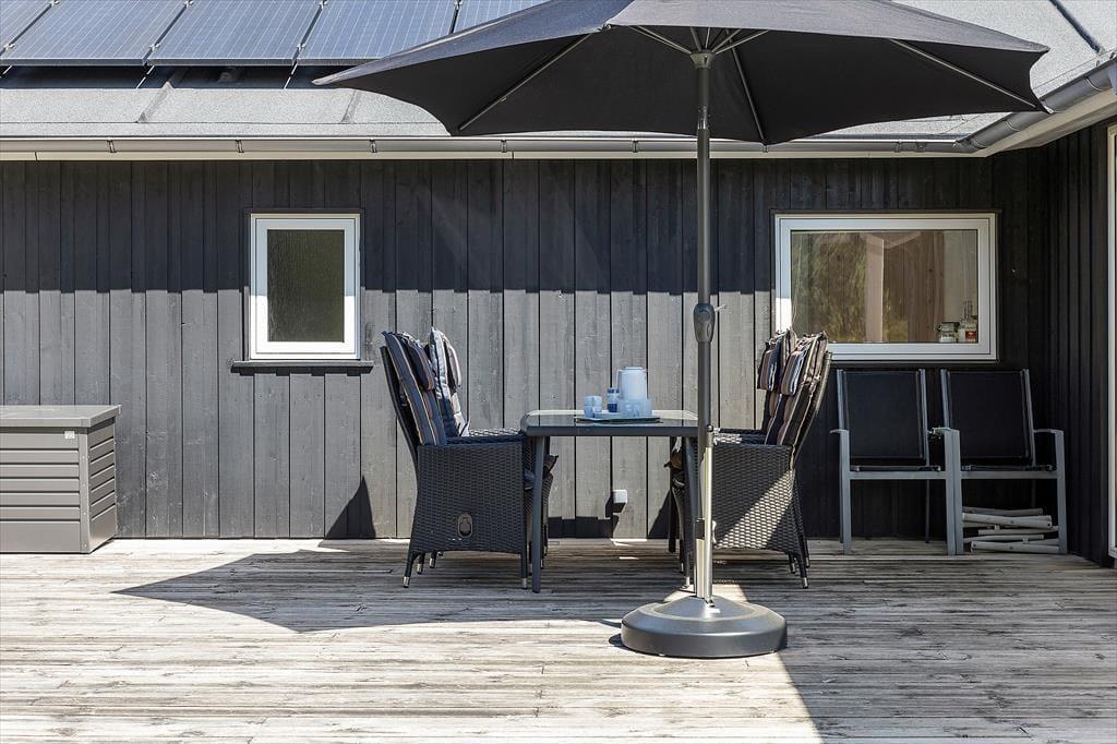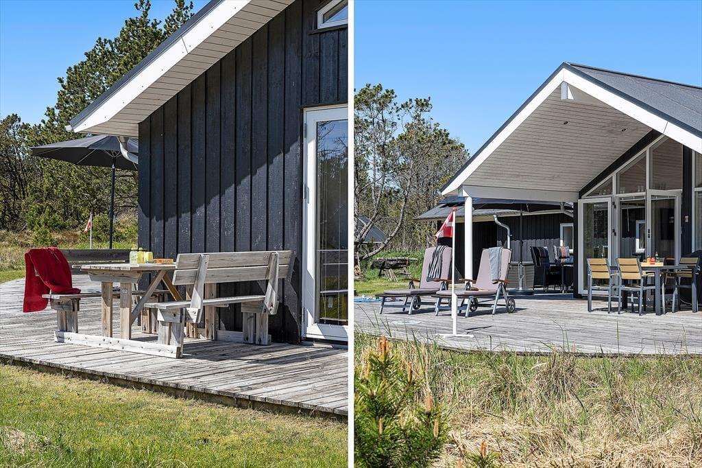 Udendørslivet er i fokus, og det mærker man tydeligt på de dejlige terrasseområder, der omkranser huset og skaber gode rammer for udelivet fra morgen til aften. Her kan du drikke morgenkaffe med udsigt til naturen, tage middagsluren i liggestolen eller tilberede aftensmaden på grillen, mens børnene leger frit på den store græsplæne. Der er gynger, masser af plads til boldspil og rig mulighed for at finde en solrig eller skyggefuld plet, alt efter hvad dagen kalder på. De grønne omgivelser skaber en særlig ro, og med skov, klitlandskab og fuglefløjt i baggrunden føles det helt naturligt at sætte tempoet ned og nyde nuet. De store terrassearealer gør det let at opholde sig udenfor i al slags vejr – og måske frister det endda med et glas vin under åben himmel, mens aftensolen går ned over landskabet.