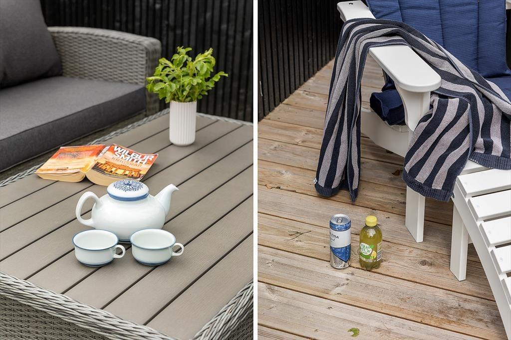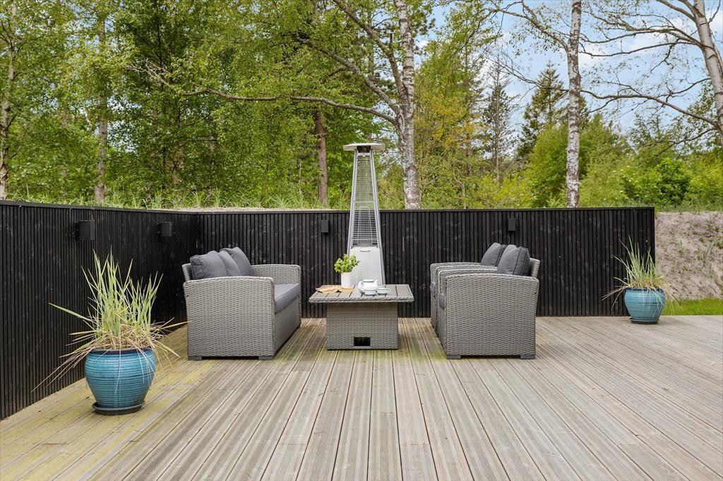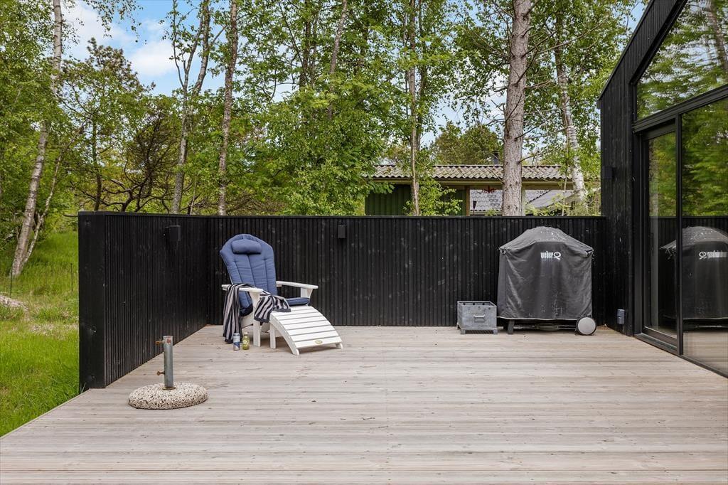 De skønne udearealer omkring sommerhuset giver dig rig mulighed for at nyde udelivet fra morgen til aften. Den store træterrasse er anlagt, så du både kan finde solrige og vindstille kroge, hvilket gør den ideel til alt fra formiddagskaffe og solbadning til grillmiddage og lune sommeraftener med tæpper over skuldrene og stjerner over hovederne. Den grønne grund er idyllisk og roligt placeret nær skoven, og giver dig følelsen af at være helt tæt på naturen – samtidig med at du har god afskærmning og privatliv. Børnene kan boltre sig i det fri, mens de voksne nyder udsigten til trækroner og fuglefløjt.