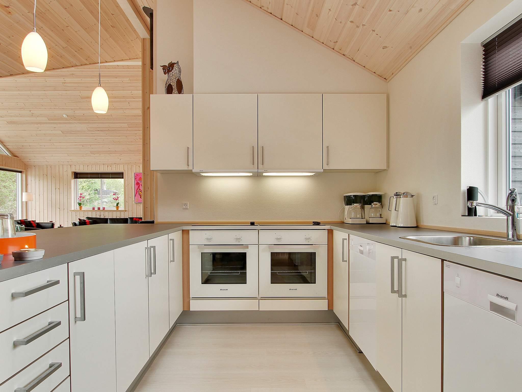 Spise/opholdsrum er smagfuldt indrettet med stereoanlæg med cd-afspiller, fladskærms-tv, sofaafdeling og brændeovn. Der er to højstole.
