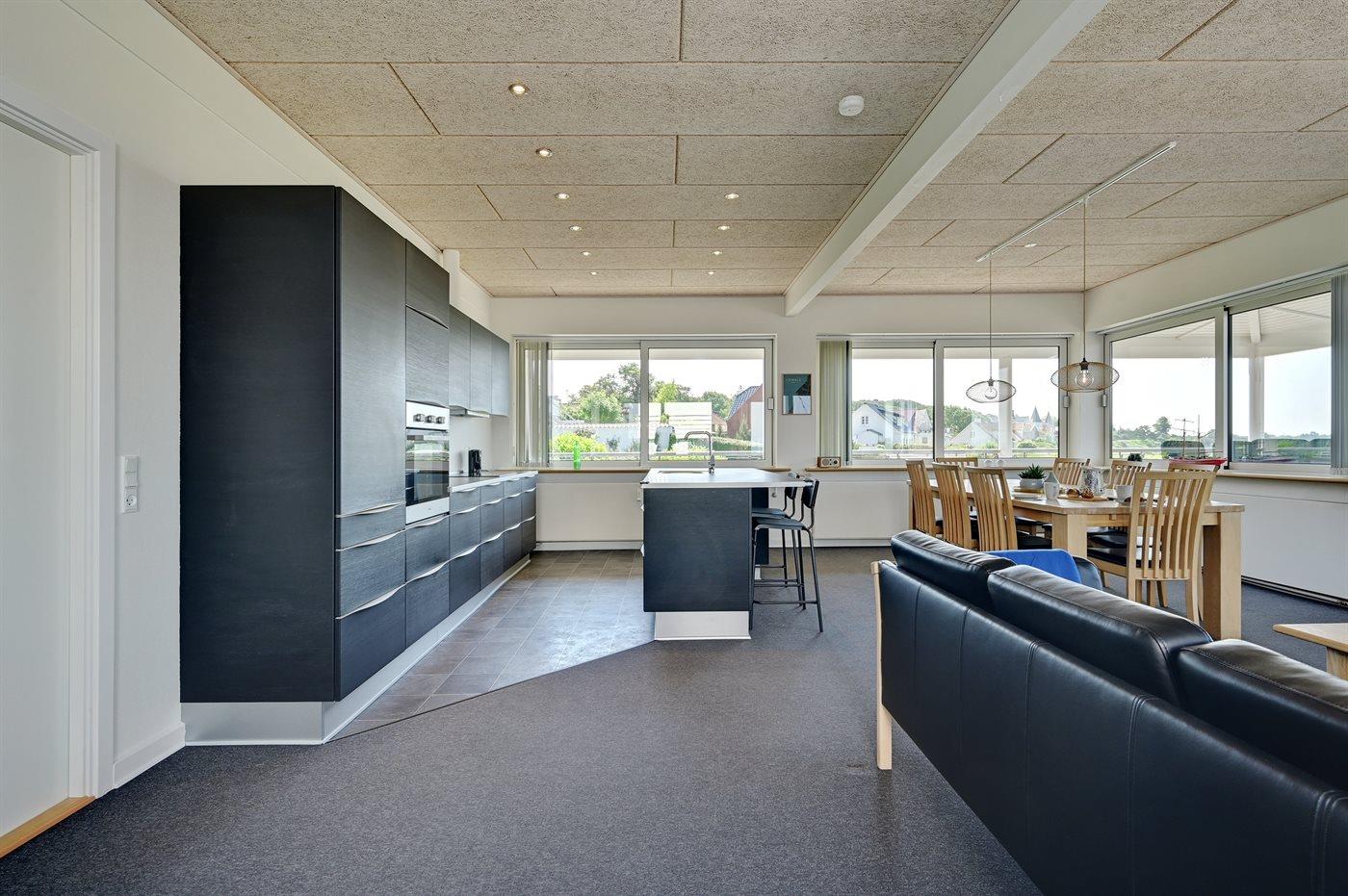 Køkkenet er udstyret med 1 køleskab. Der er 4 induktionskogeplader, varmluftovn, mikrobølgeovn samt opvaskemaskine.