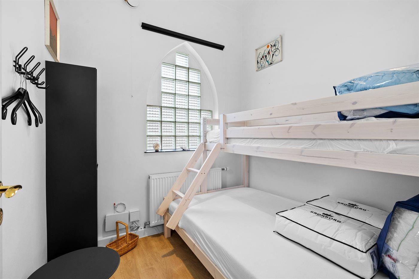 Der er i alt 2 soveværelser. Sovepladserne fordeler sig på: 2 sovepladser i dobbeltseng. 2 sovepladser i enkeltsenge.1 soveplads i køjeseng. 2 sovepladser i sovesofa (dobbelt). 2 af disse sovepladser befinder sig i stuen. Derudover er der 1 stk. barneseng.