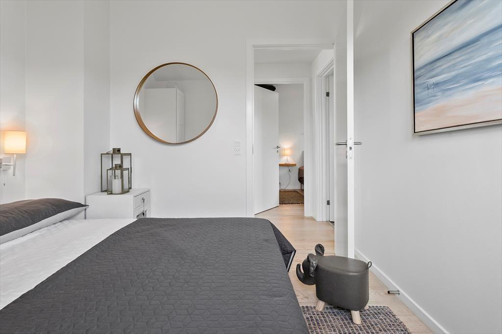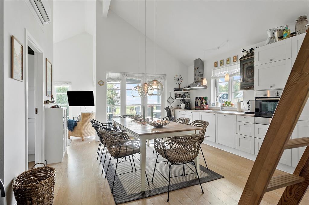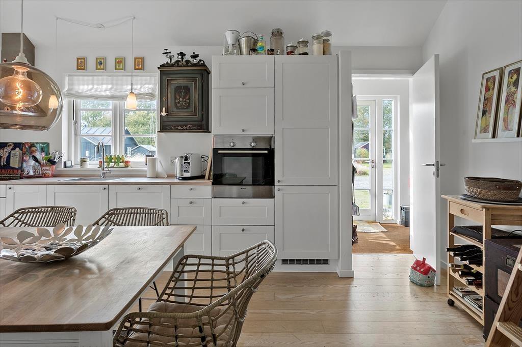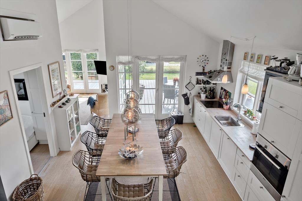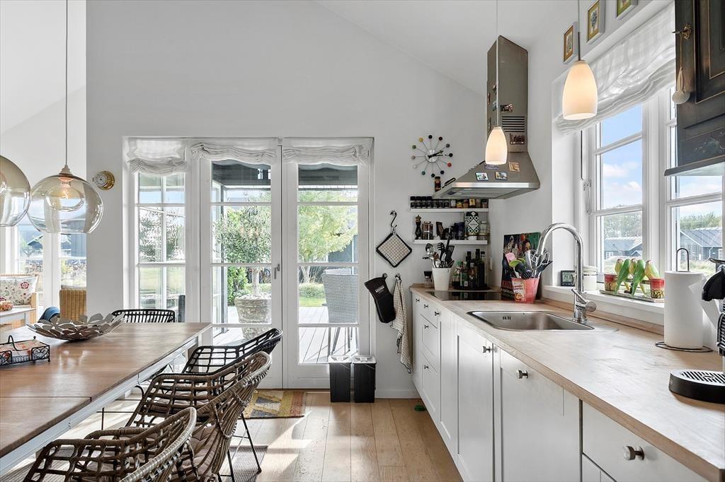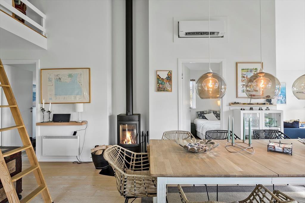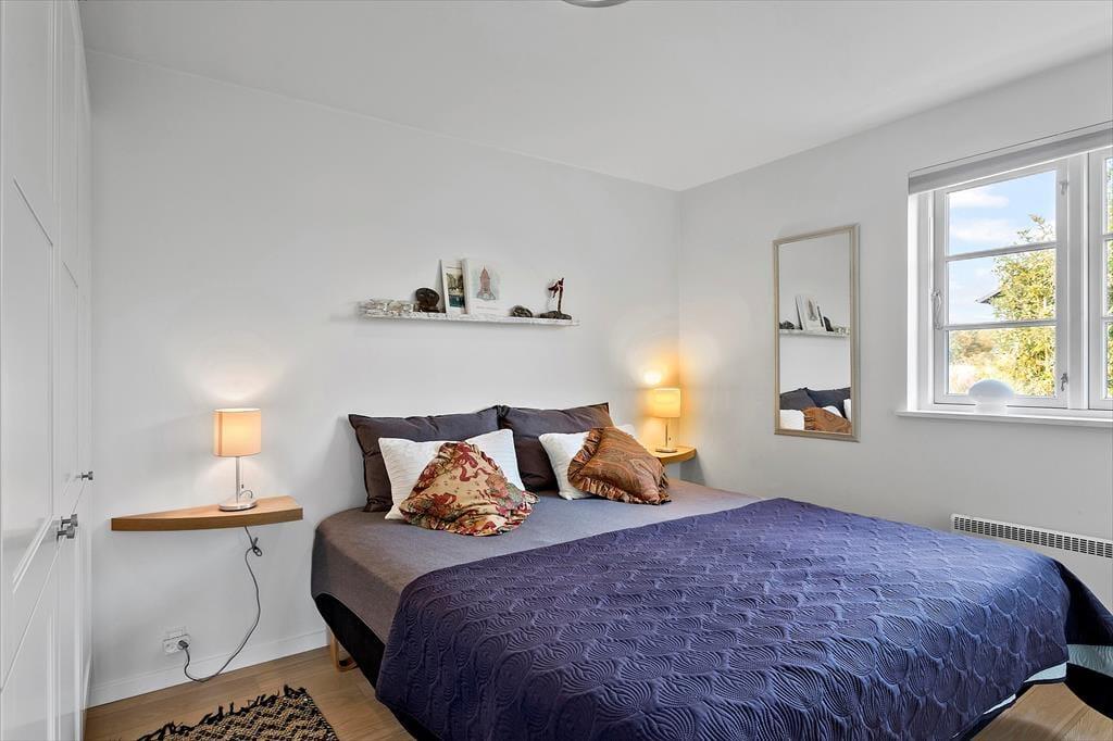 Sommerhuset indeholder en entre, med indgang til sommerhuset skønne køkken-alrum. Her er der spiseområde og sofaområde, samt udgang til sommerhuset skønne terrasse. I spisestuen er en hyggelig brændeovn, samt opgang til husets hems. Derudover har huset et stort badeværelse med wc, bruser, spabad, sauna og vaskemaskine. Dernæst har huset 3 gode soverum, med dobbeltseng i to af soveværelserne og 2 enkeltmandssenge i det sidste soveværelse.