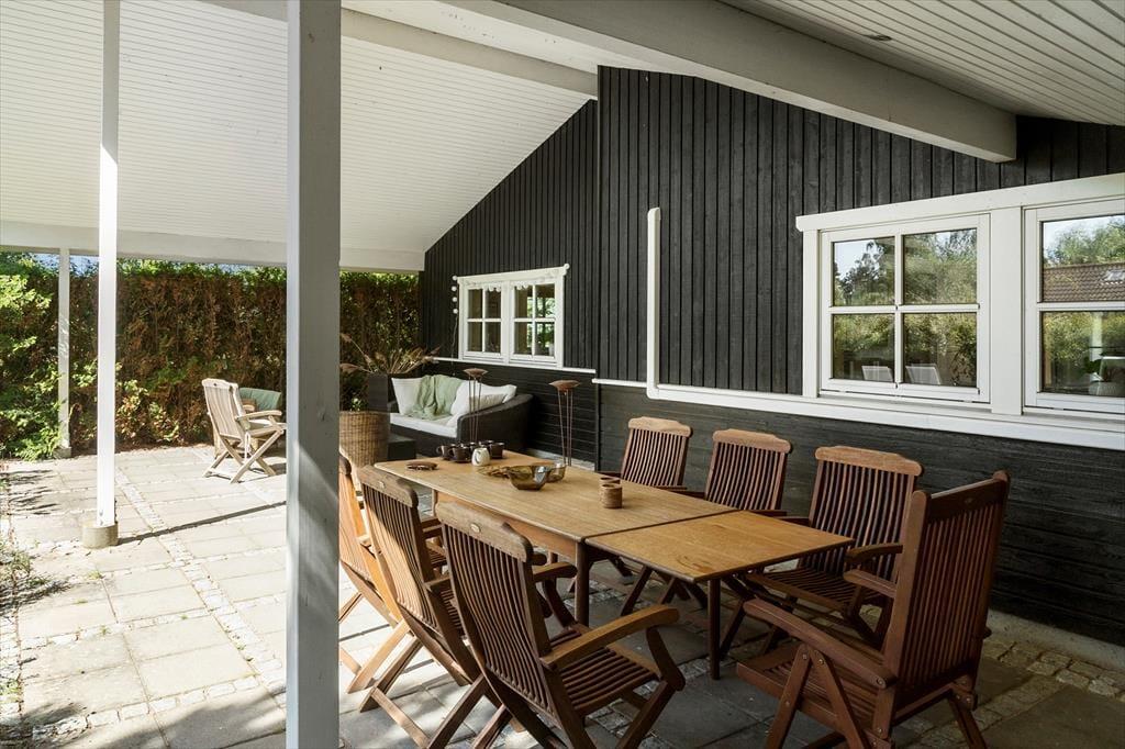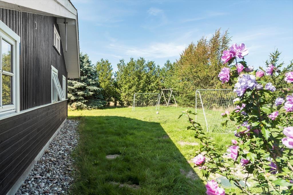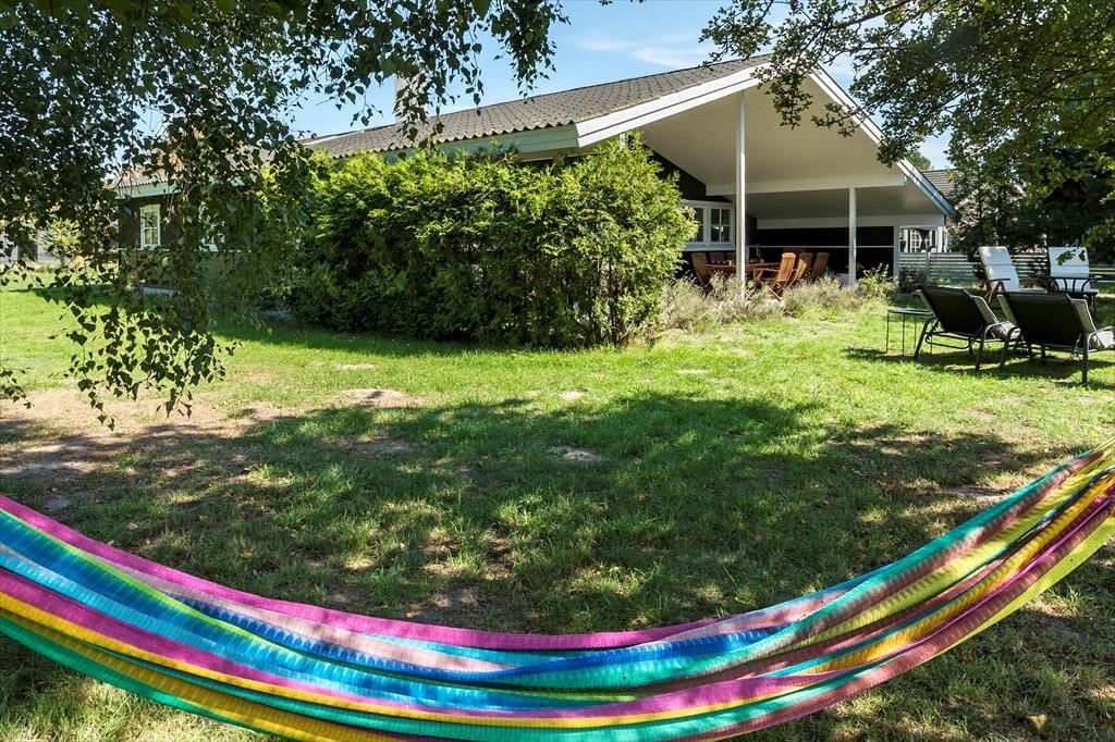 Fritidshuset er beliggende på en 1127 kvm stor grund med masser af plads til udendørs aktiviteter på græsplænen. Til huset er en skøn terrasse der er overdækket, hvor der er havemøbler.