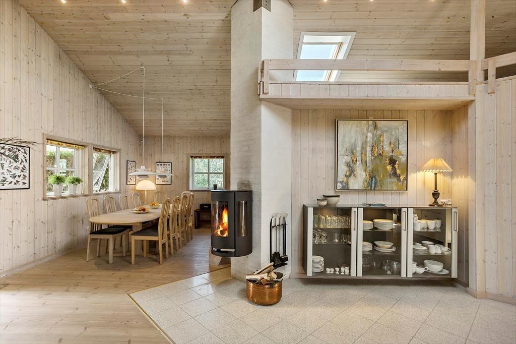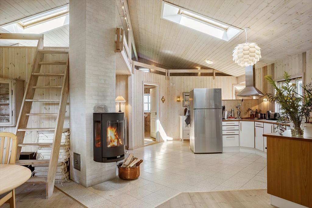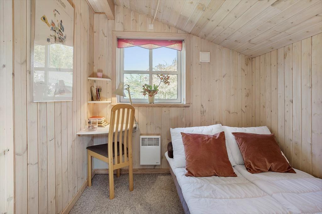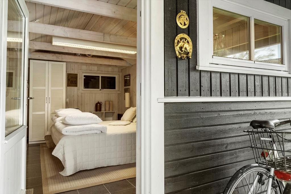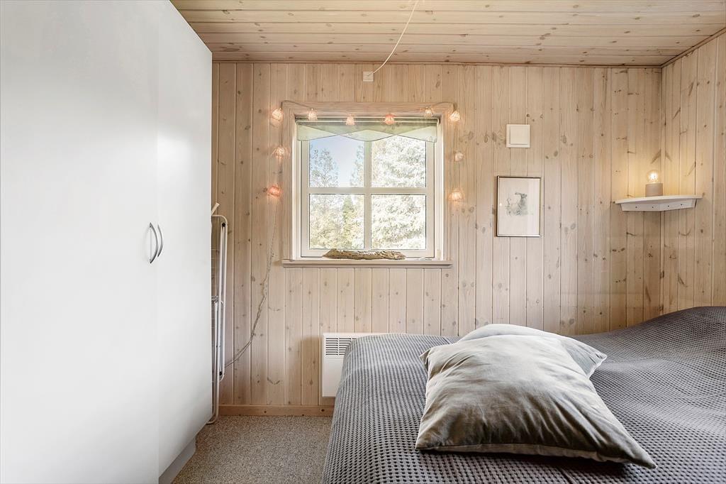Fritidshuset indeholder: Entre, 3 gode soveværelser med dobbeltseng i 2 af værelserne og dobbeltsovesofa i 1 af værelserne. I huset er der 1 badeværelse med wc, bruser, indendørsspa og sauna. Derudover er der et stort lækkert køkken og spiseafdeling i forlængelse af køkkenet, stue med sofa område og brændeovn, samt udgang til den store overdækkede terrasse. Fra stuen er opgang til hemsen, hvor der er to sovemadrasser. Derudover er der et anneks til huset, hvor der er en dobbeltseng. Huset er lyst og lækkert og der er plads til en masse samvær og hygge.
