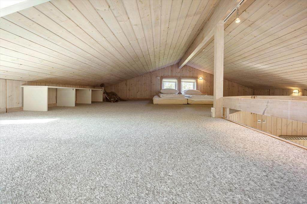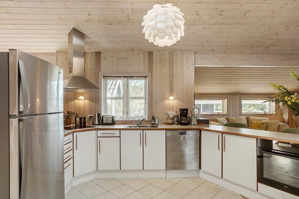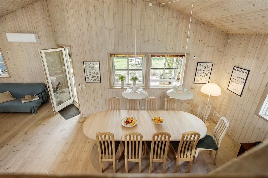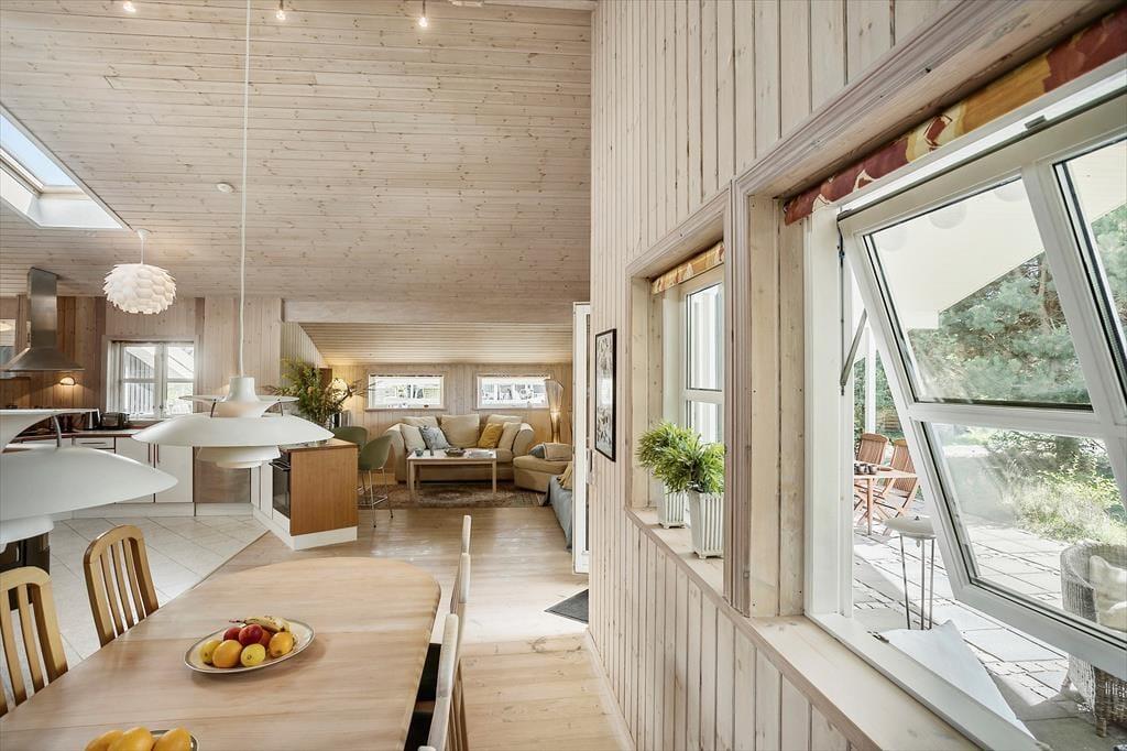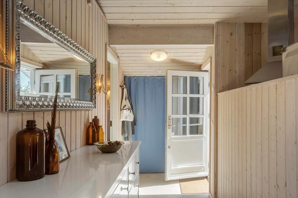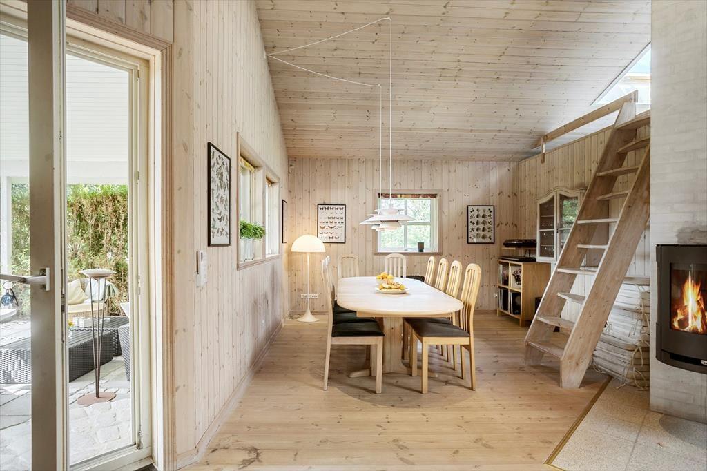 Fritidshuset indeholder: Entre, 3 gode soveværelser med dobbeltseng i 2 af værelserne og dobbeltsovesofa i 1 af værelserne. I huset er der 1 badeværelse med wc, bruser, indendørsspa og sauna. Derudover er der et stort lækkert køkken og spiseafdeling i forlængelse af køkkenet, stue med sofa område og brændeovn, samt udgang til den store overdækkede terrasse. Fra stuen er opgang til hemsen, hvor der er to sovemadrasser. Derudover er der et anneks til huset, hvor der er en dobbeltseng. Huset er lyst og lækkert og der er plads til en masse samvær og hygge.