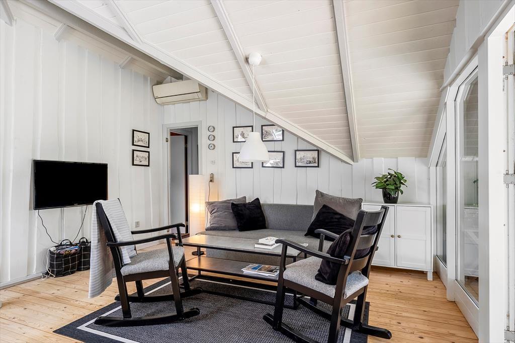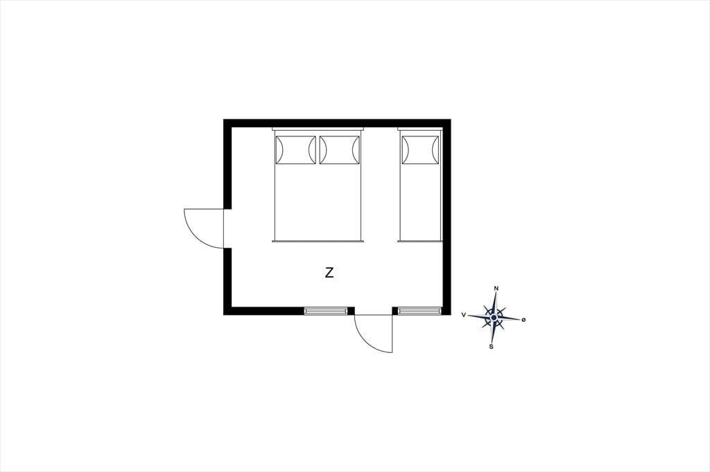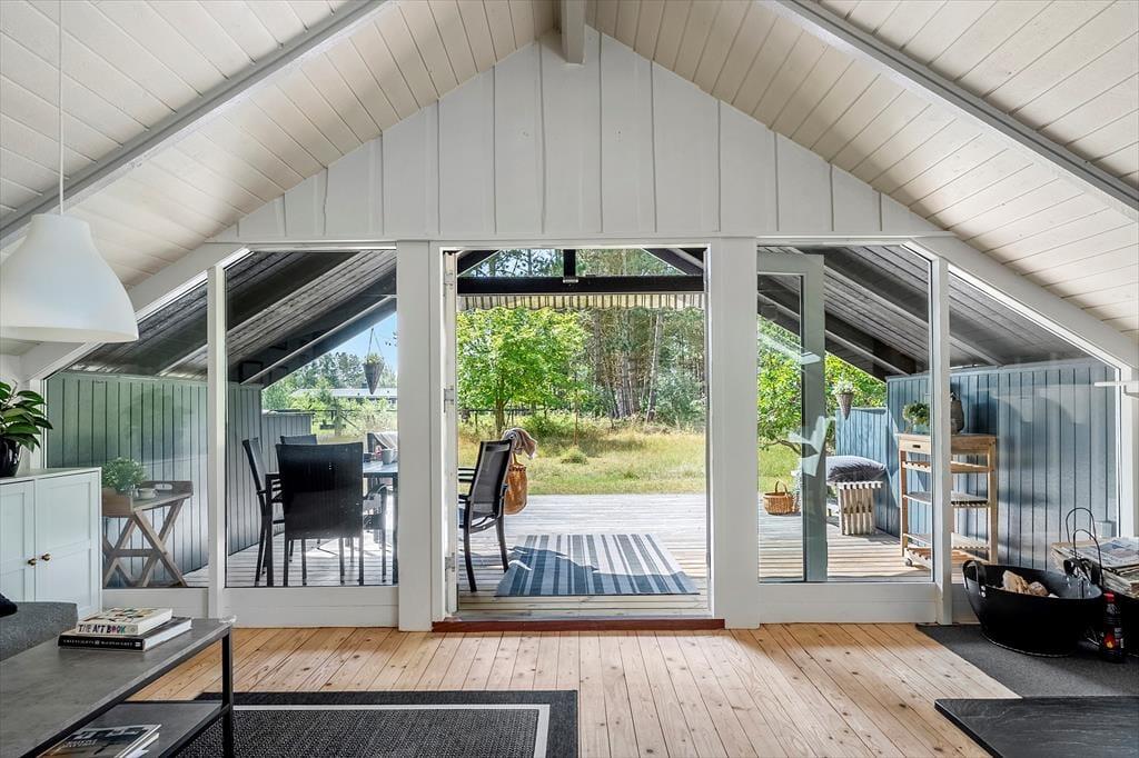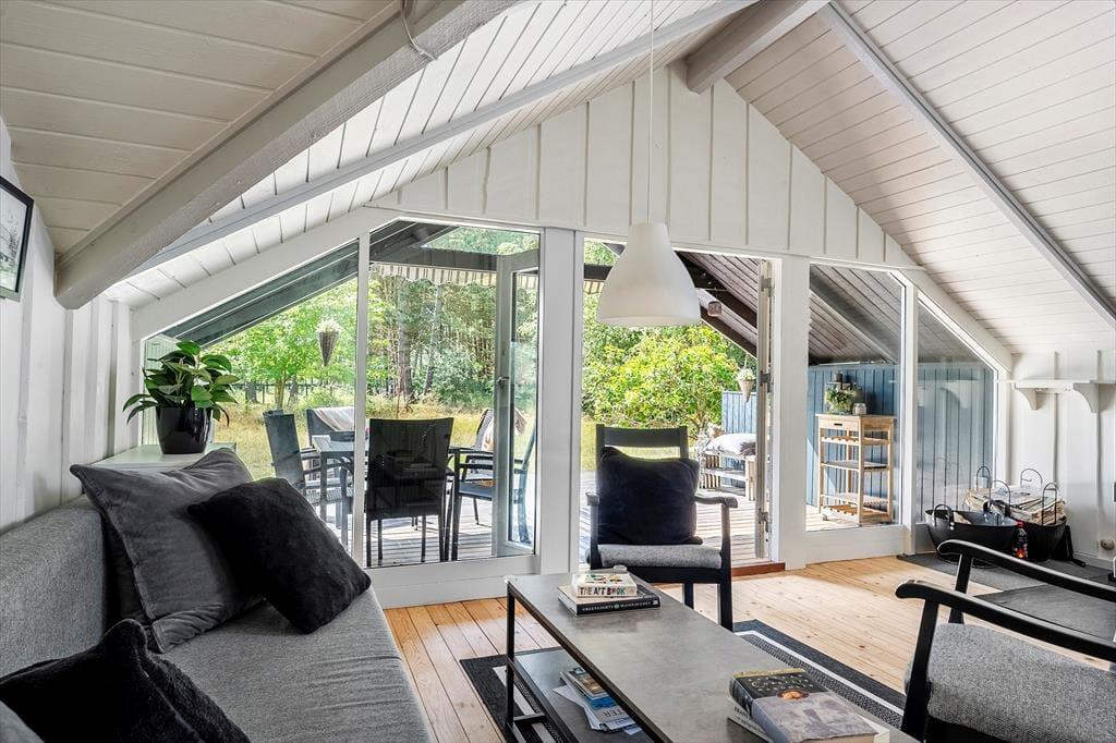 Sommerhuset indeholder: Entre, 1 soveværelse med 2 enkeltmandssenge, derudover er der et anneks hvor der er et soverum med dobbeltseng og 1 enkeltmandsseng. I huset er der 1 badeværelse med wc og bruser. Derudover er der et åbent køkken med spise afdeling og sofaområde og brændeovn, samt udgang til den overdækkede terrasse. Huset er lyst og der er plads til en masse samvær og hygge.
