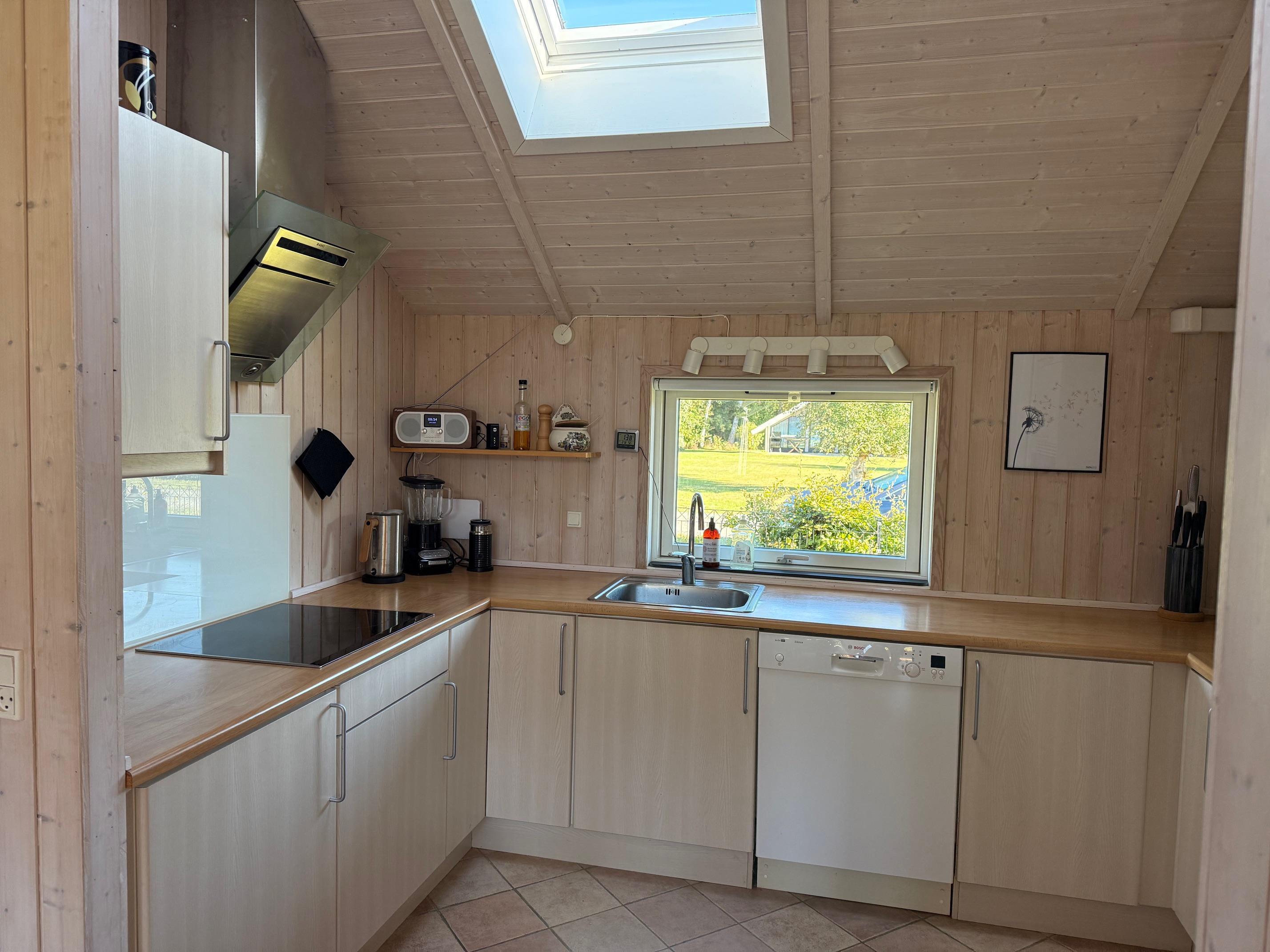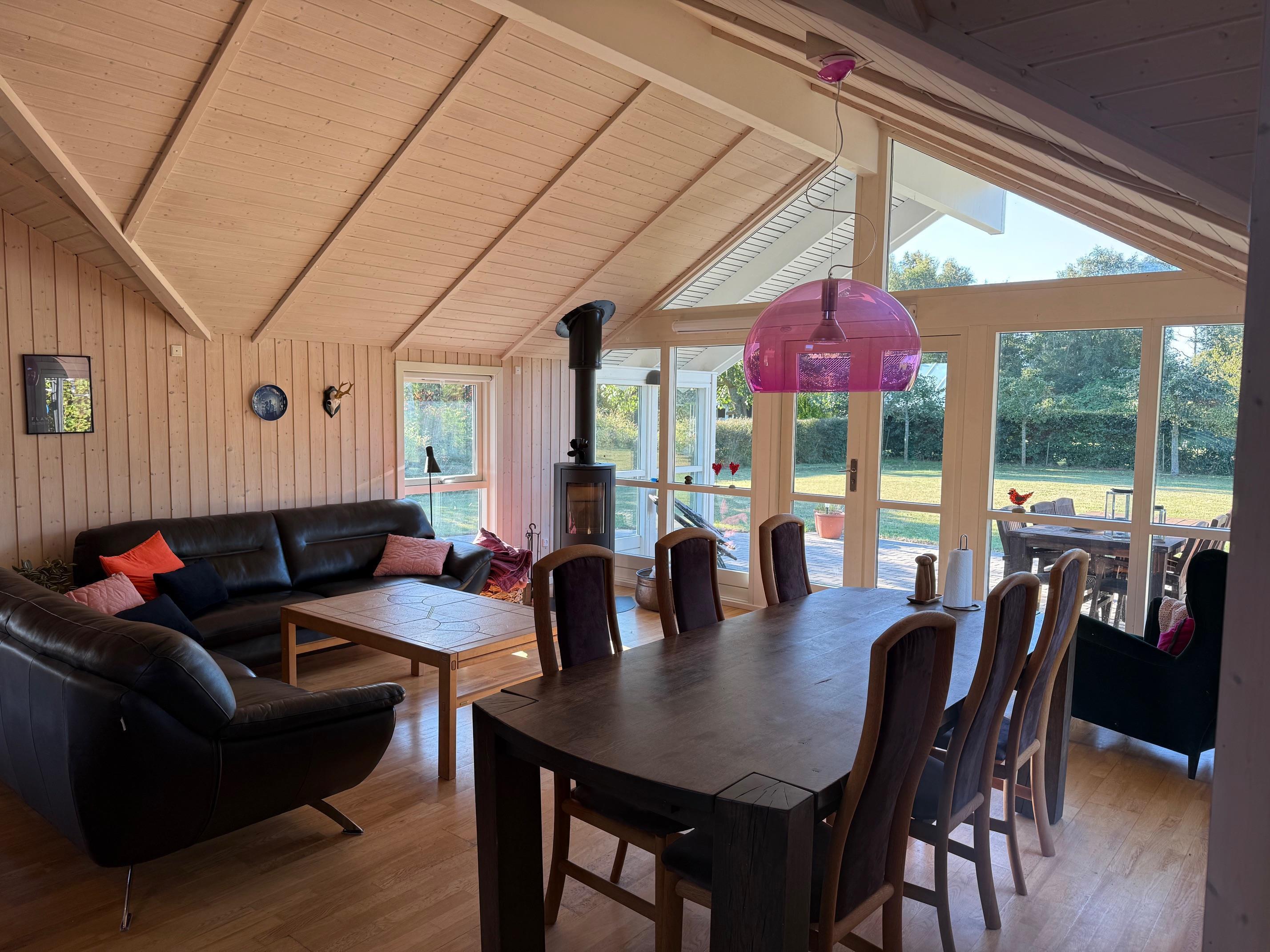 Huset har en hyggelig og velindrettet stue med brændeovn, store vinduespartier og direkte udgang til en solrig terrasse. Stuen er i åben forbindelse med det moderne køkken, som naturligvis er udstyret med både opvaskemaskine, espressomaskine, og mikroovn – her er alt, hvad I behøver til feriens måltider.
