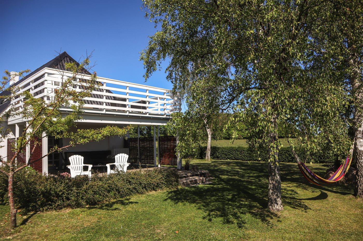 Denne skønne feriebolig ligger på en dejlig grund i hyggelige og naturskønne omgivelser. Havudsigten kan nydes fra såvel hus som grund. Bemærk: Lav loftshøjde i køkkenet.