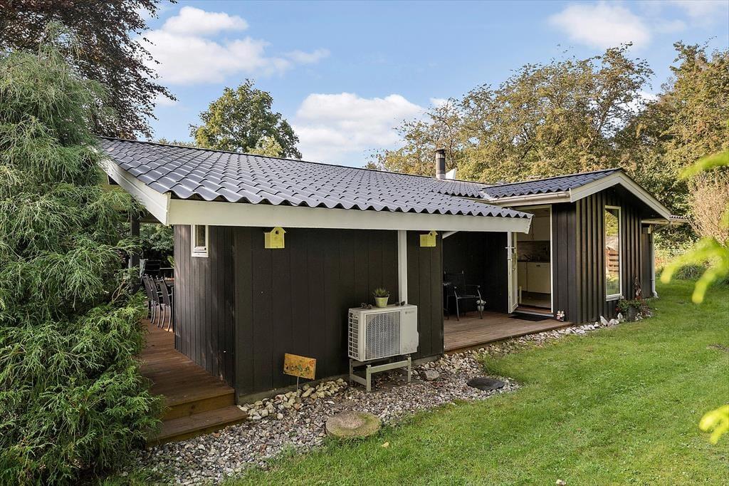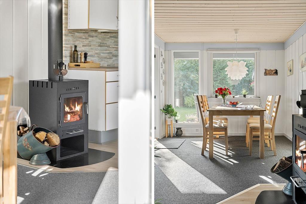 Det 71 m2 store sommerhus er blevet grundigt renoveret i 2019, hvilket det flotte køkken og andre dejlige indretningsdetaljer tydeligt vidner om. Netop køkkenet ligger i åben forbindelse med stuen, der byder på spisebord og sofaafdeling med tv – samt en energibesparende varmepumpe foruden den hyggespredende brændeovn. Et pænt badeværelse med bruser og gulvvarme hører med til planløsningen, og når det er ved at være sengetid, kan I gøre brug af husets to soveværelser, der har sengepladser til fem personer.