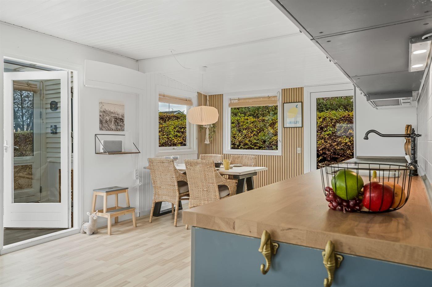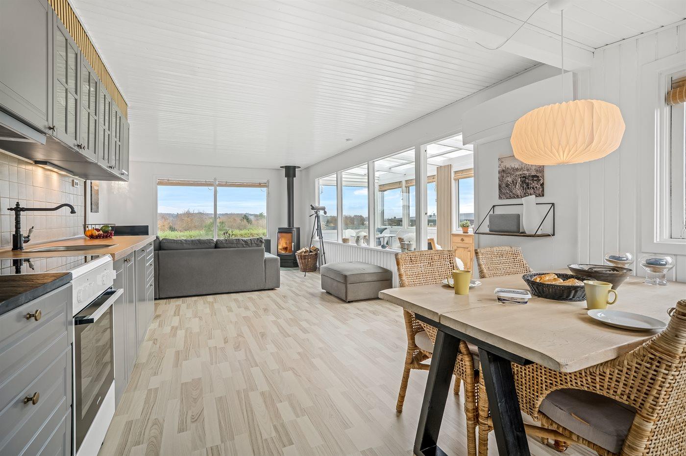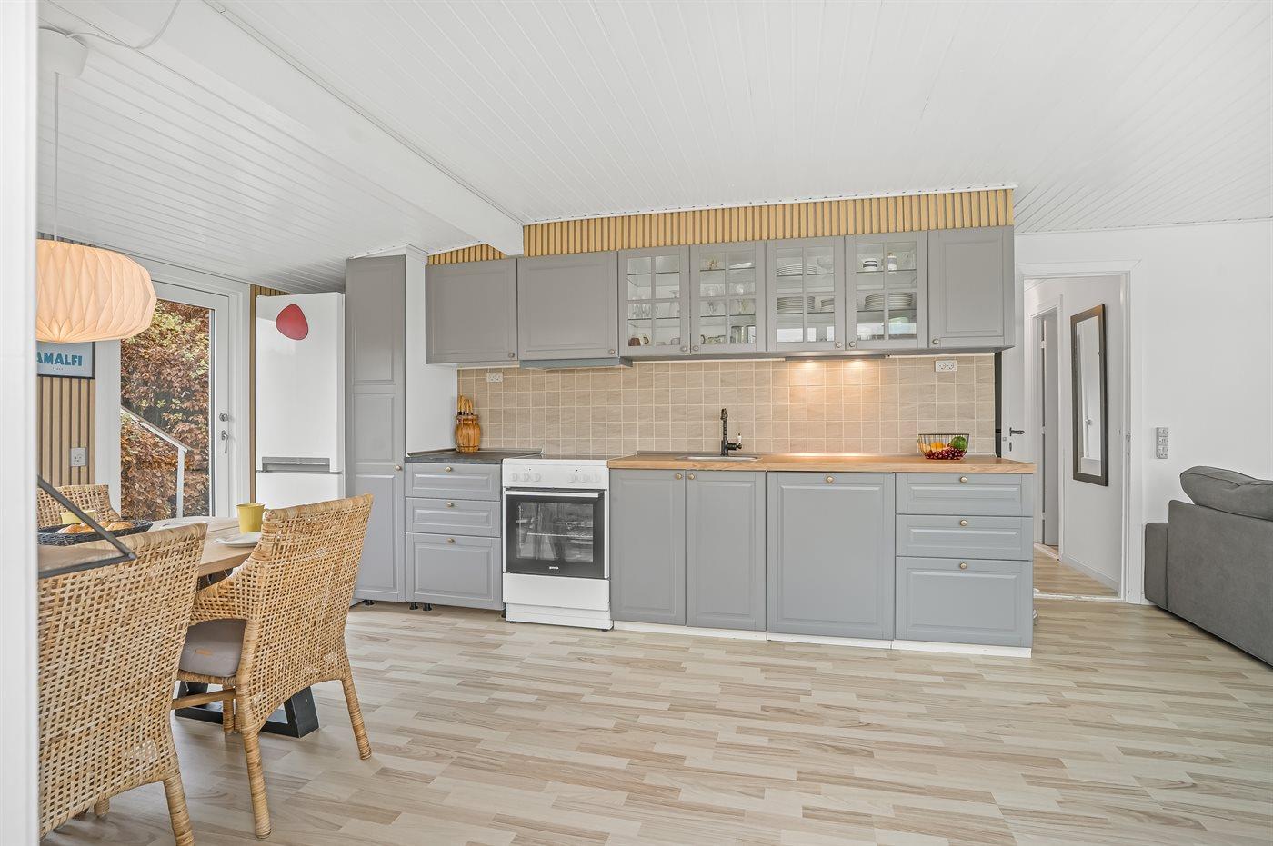 Køkkenet er udstyret med 1 køleskab. Der er 4 elkogeplader, varmluftovn, mikrobølgeovn samt opvaskemaskine.