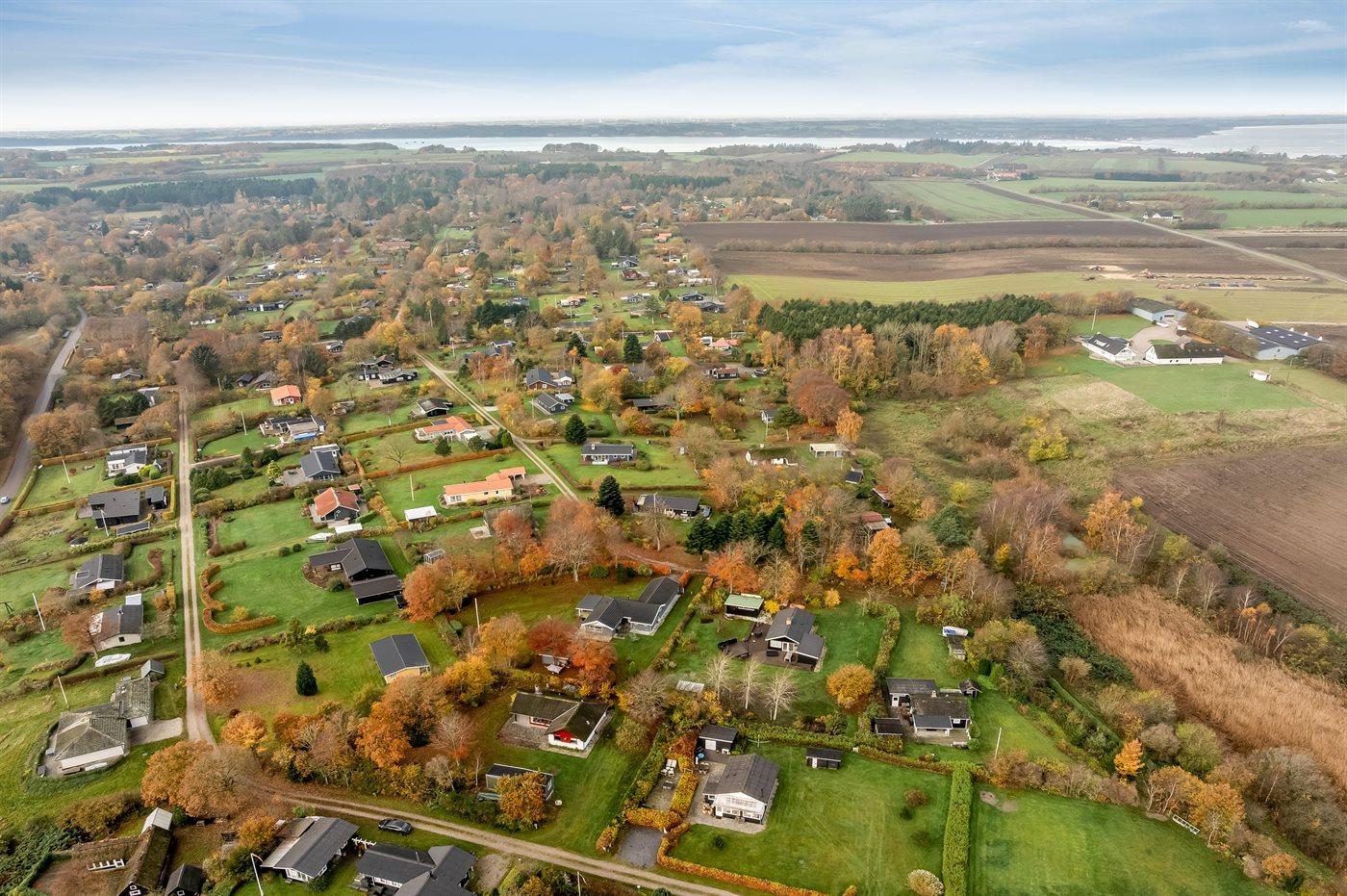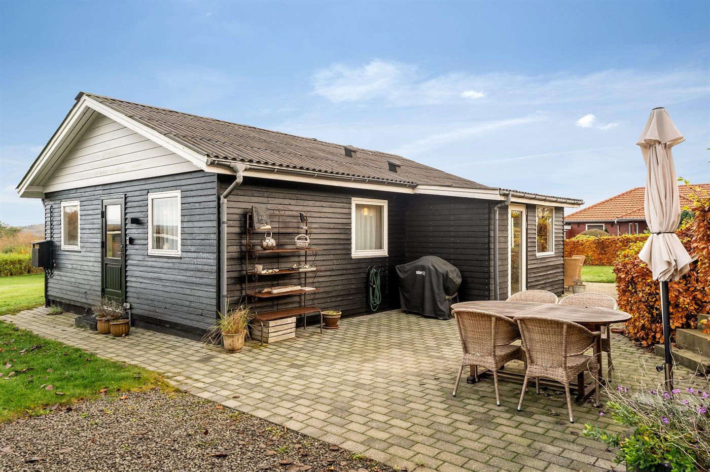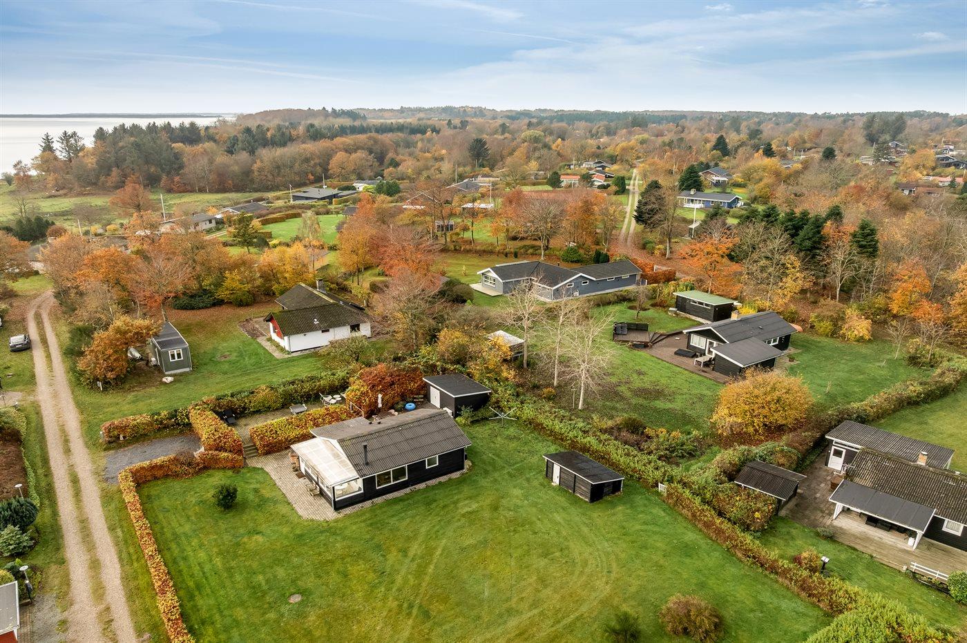 Ferieboligen er beliggende på en 1514 m² stor naturgrund. Grunden er indhegnet. Der er 250 m til fjorden. Nærmeste forretning er beliggende i en afstand af 3900 m. Der er en golfbane i en afstand af 4000 m. Til ferieboligen hører åbent terrasseareal. Grill til rådighed. Parkering ved ferieboligen.
