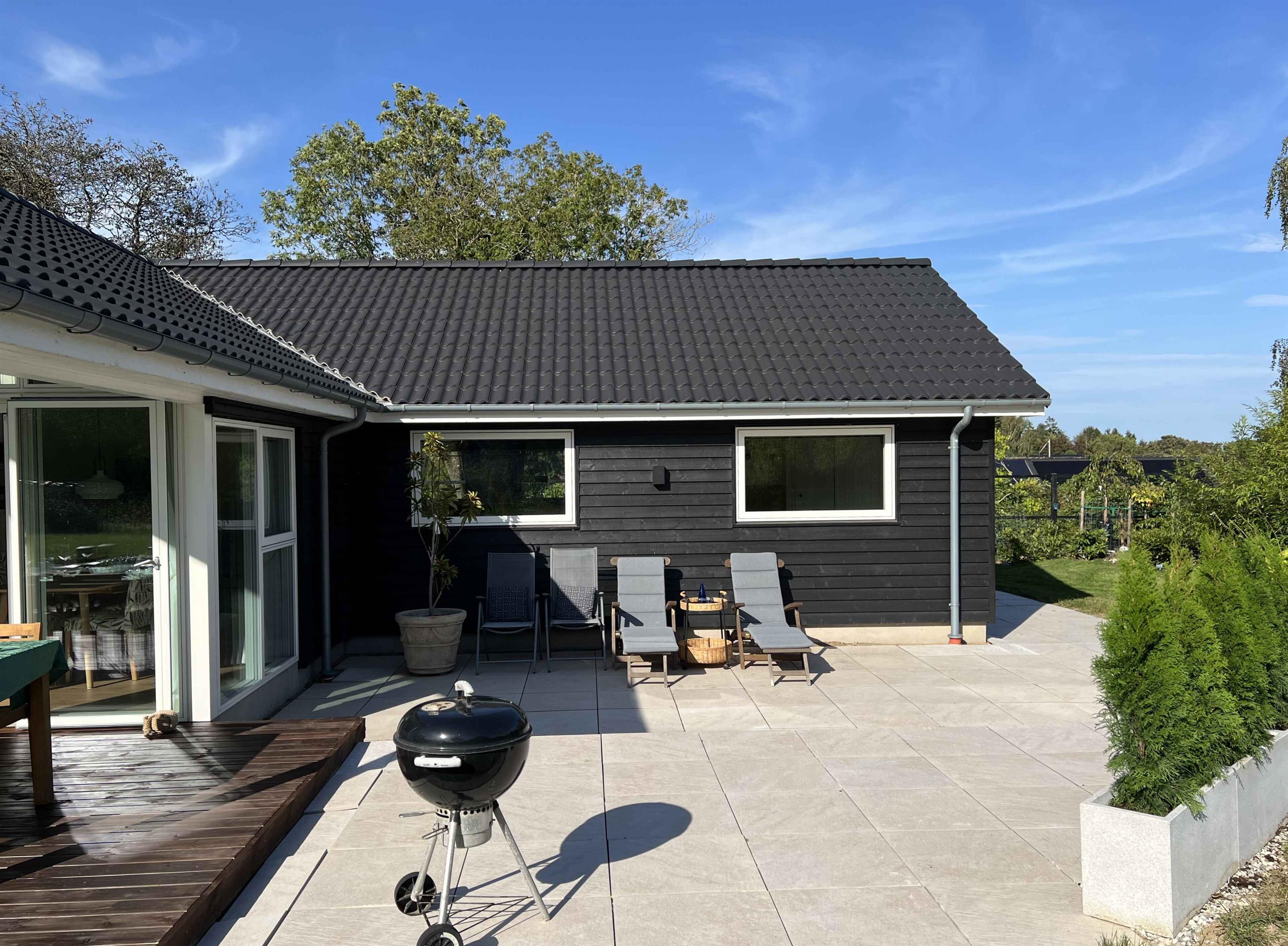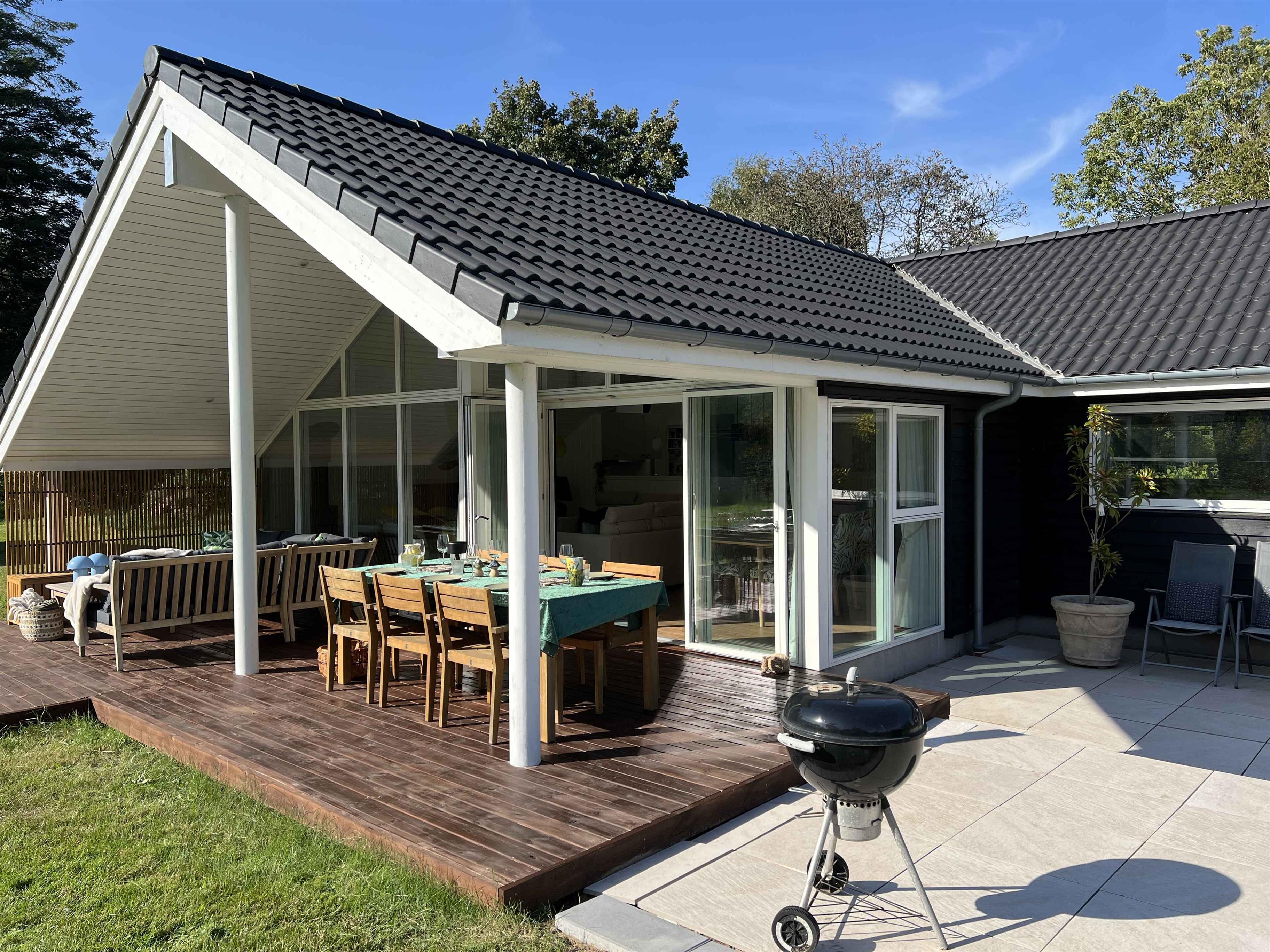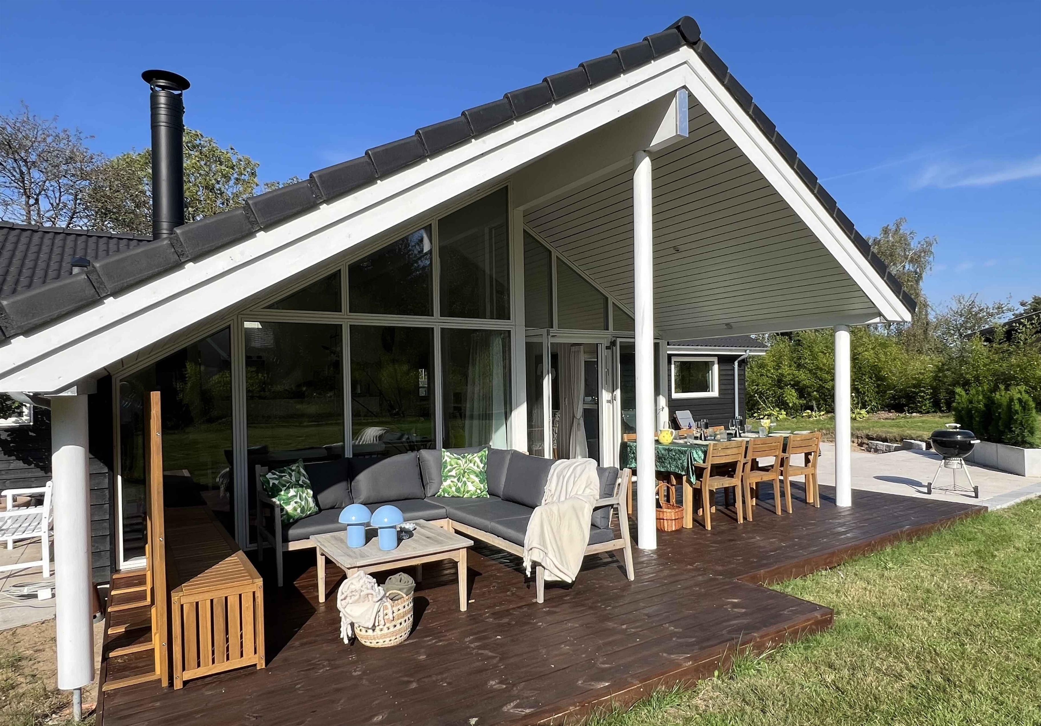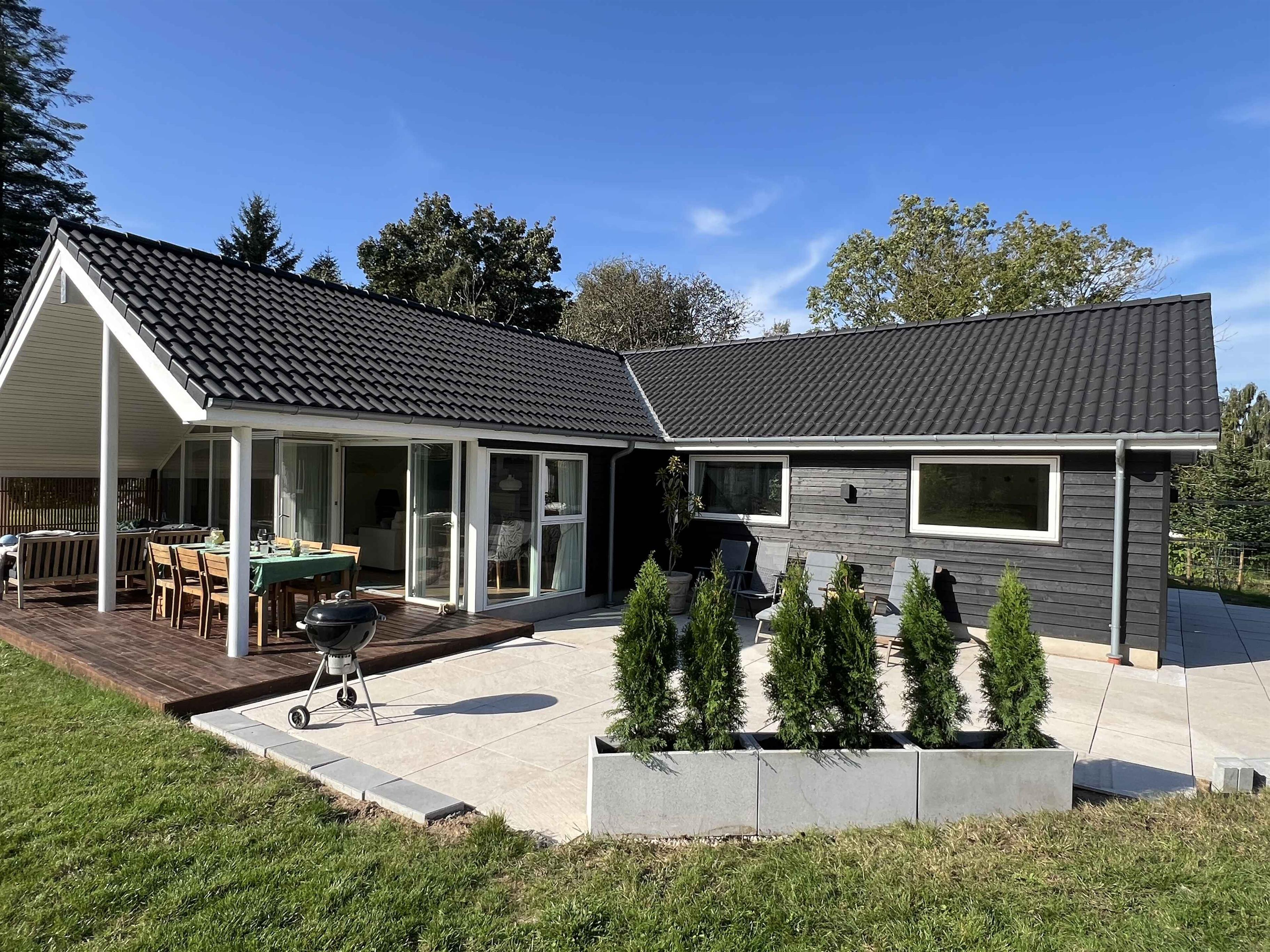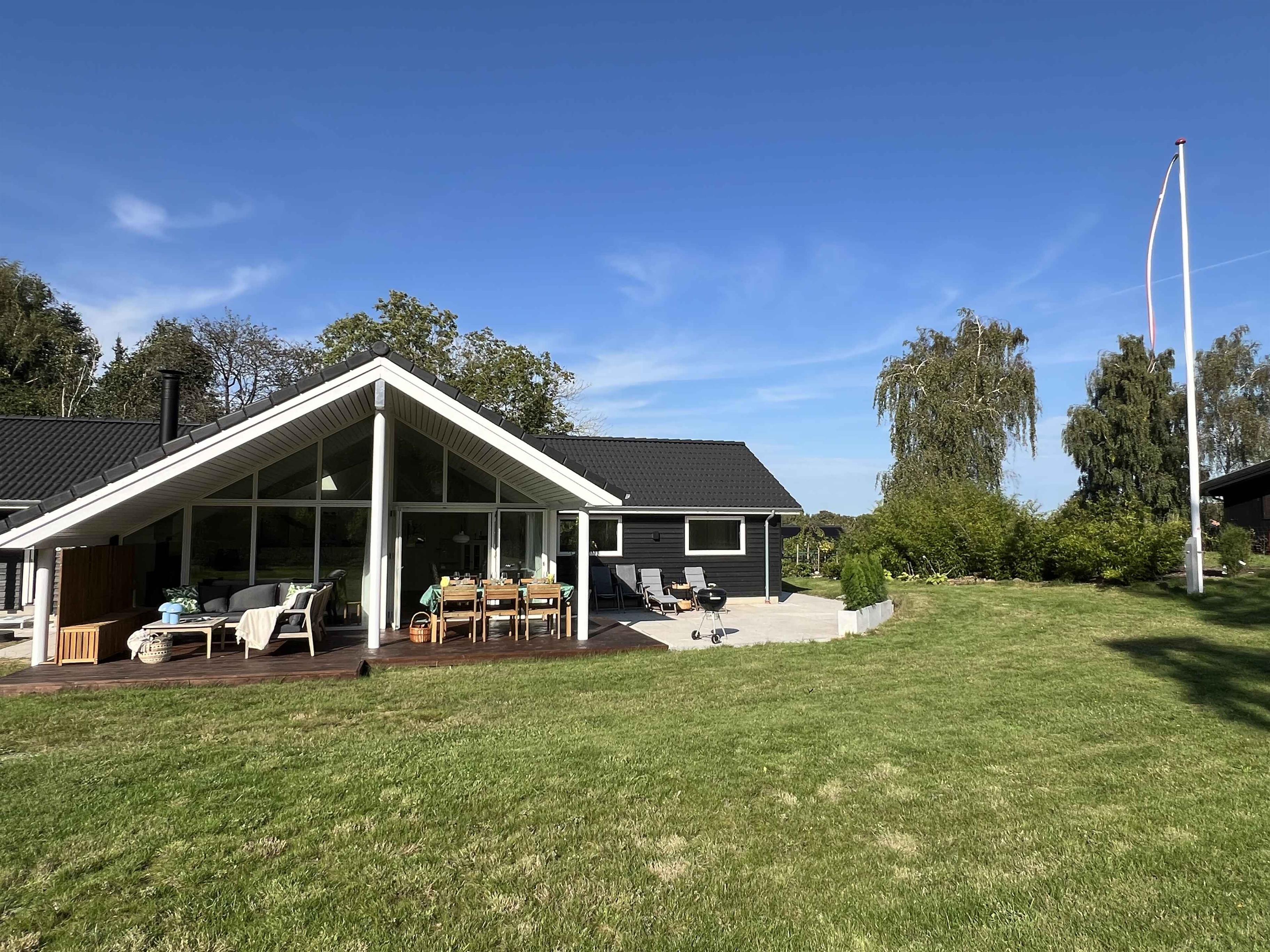 Ecovenligt sommerhus fra 2023 nær bugt & strand, 8 pers. 4 værelser (3 dob./2 enk), 2 badeværelser (sauna/spa/vaskemaskine/tørretumbler), gulvvarme, aktivitetsrum. Solrig grund med terrasse, grill og spil. Veludstyret køkken, hyggekrog, elbil-oplader