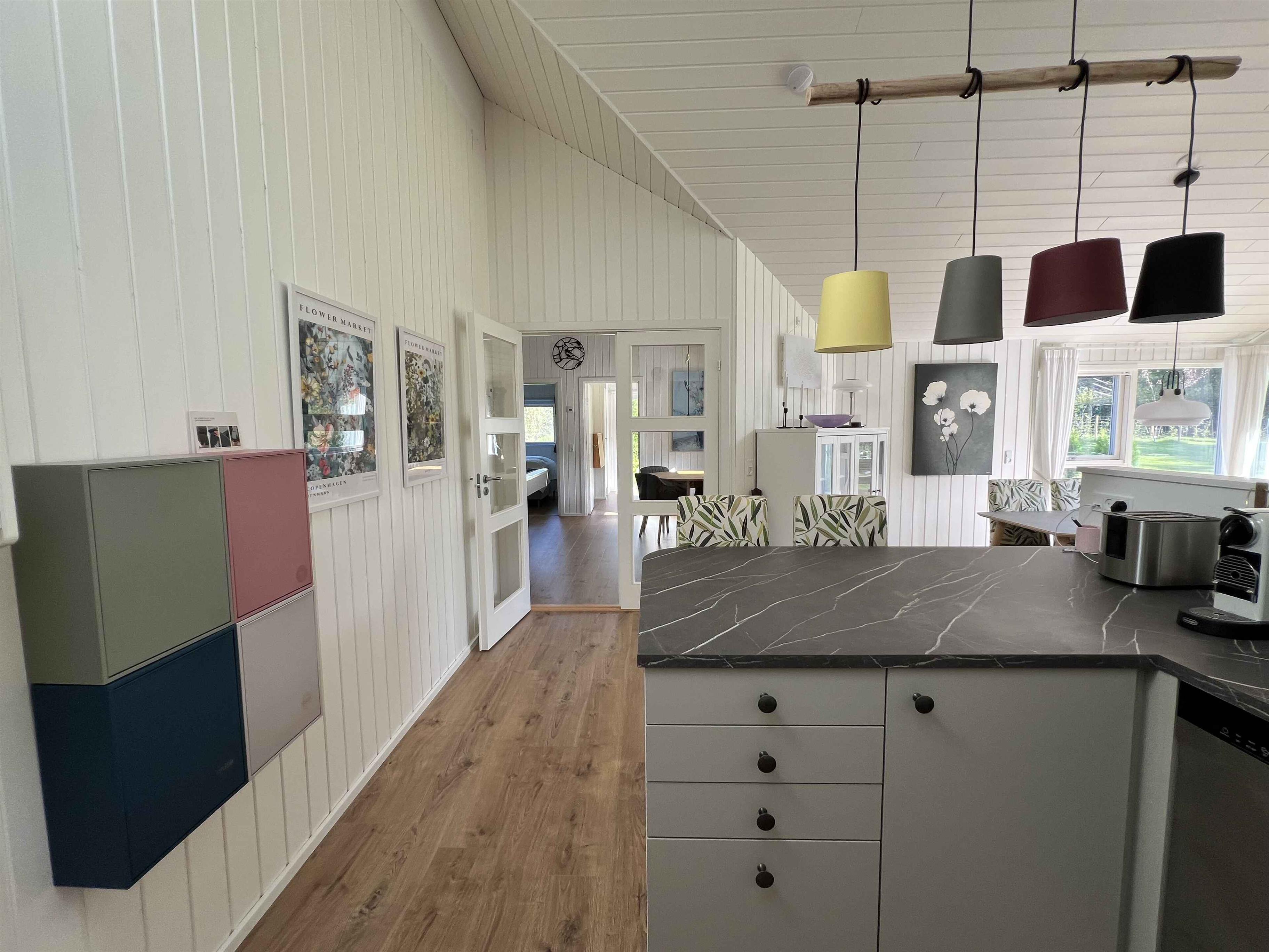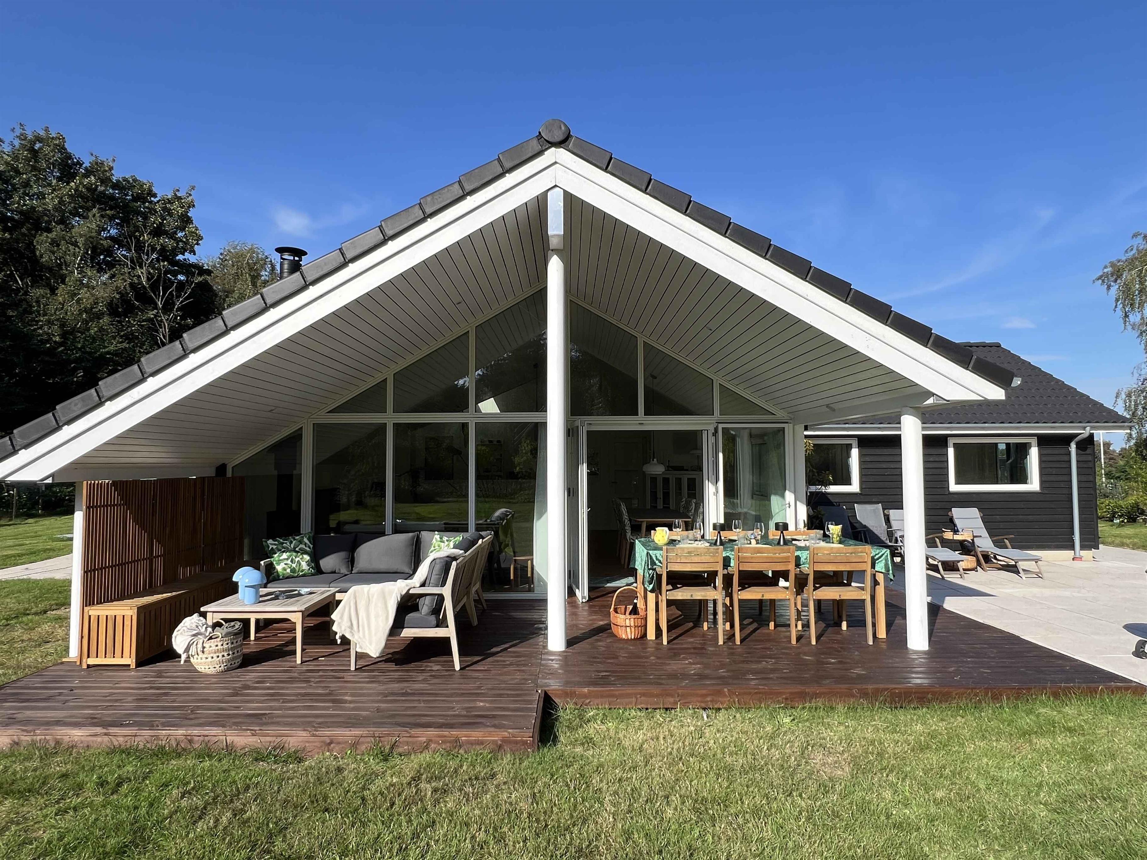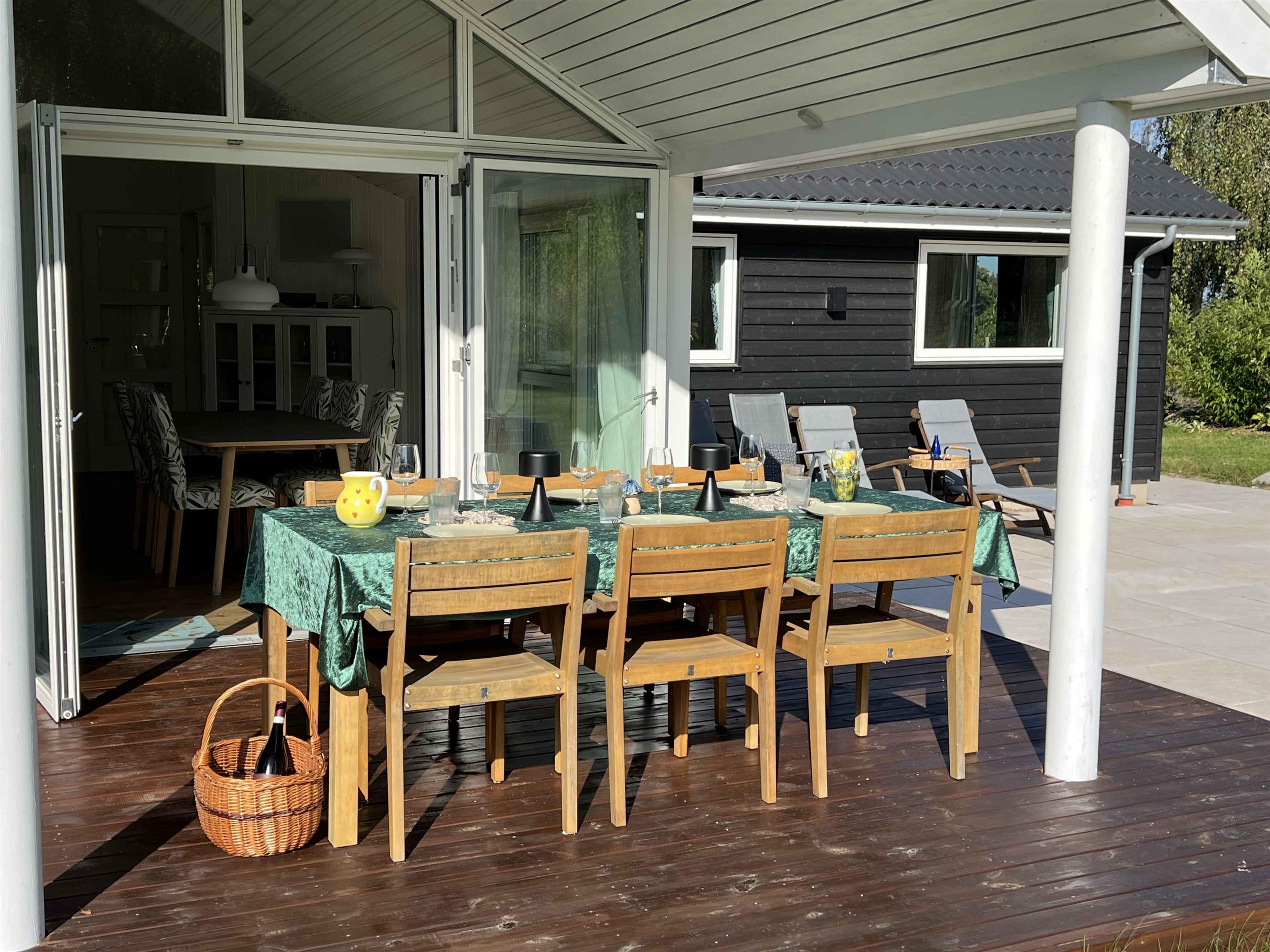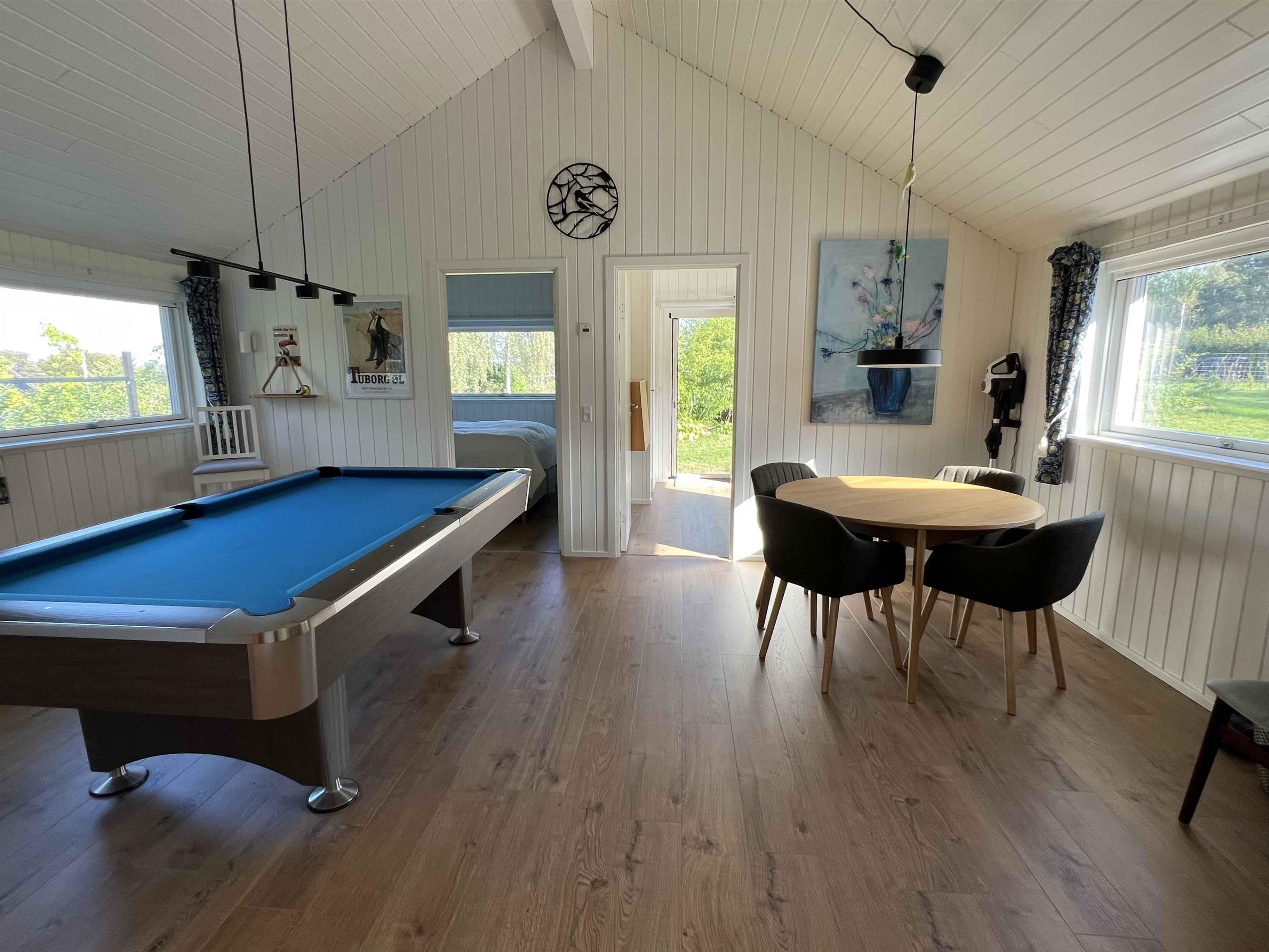 Ecovenligt sommerhus fra 2023 nær bugt & strand, 8 pers. 4 værelser (3 dob./2 enk), 2 badeværelser (sauna/spa/vaskemaskine/tørretumbler), gulvvarme, aktivitetsrum. Solrig grund med terrasse, grill og spil. Veludstyret køkken, hyggekrog, elbil-oplader