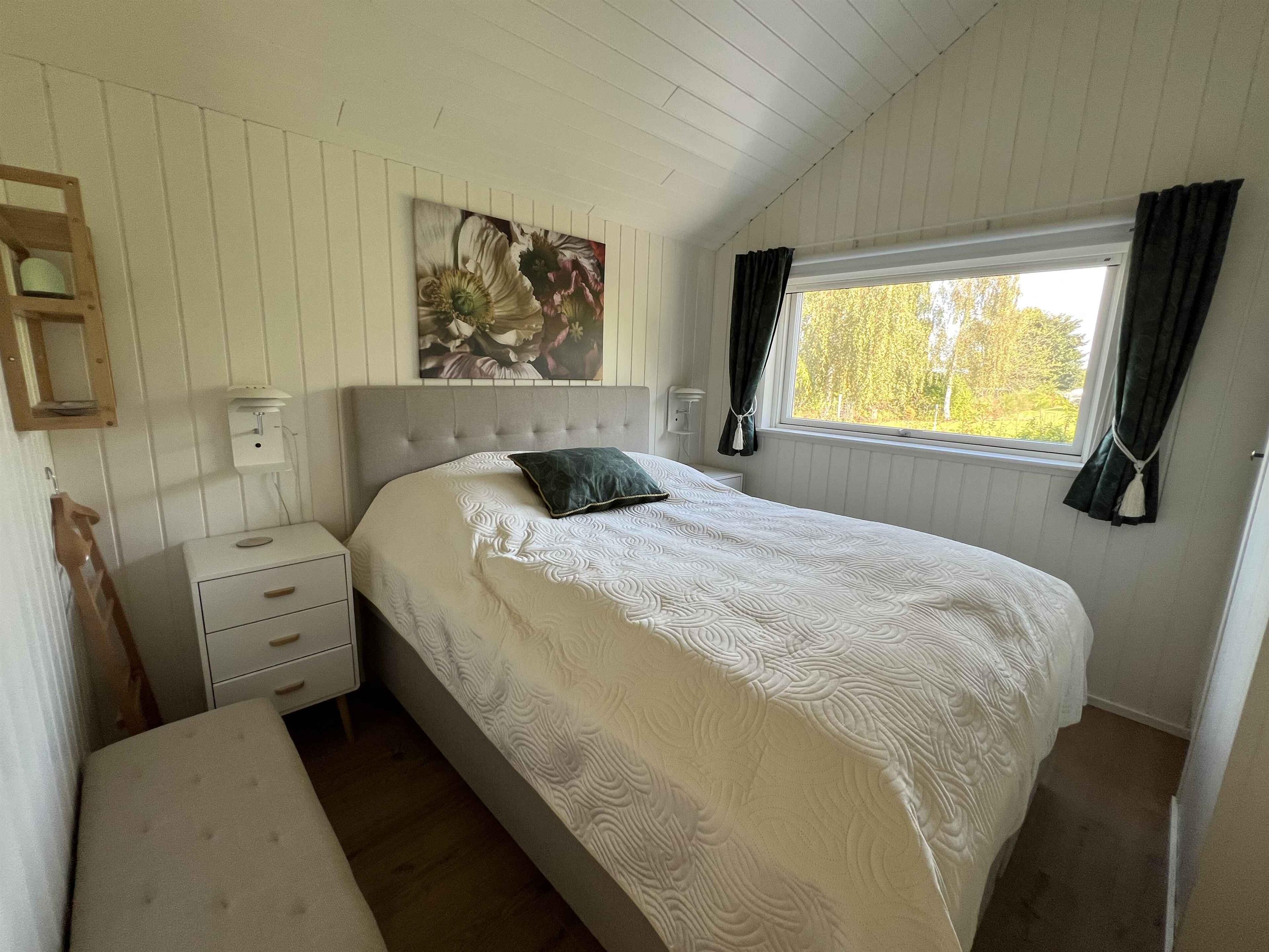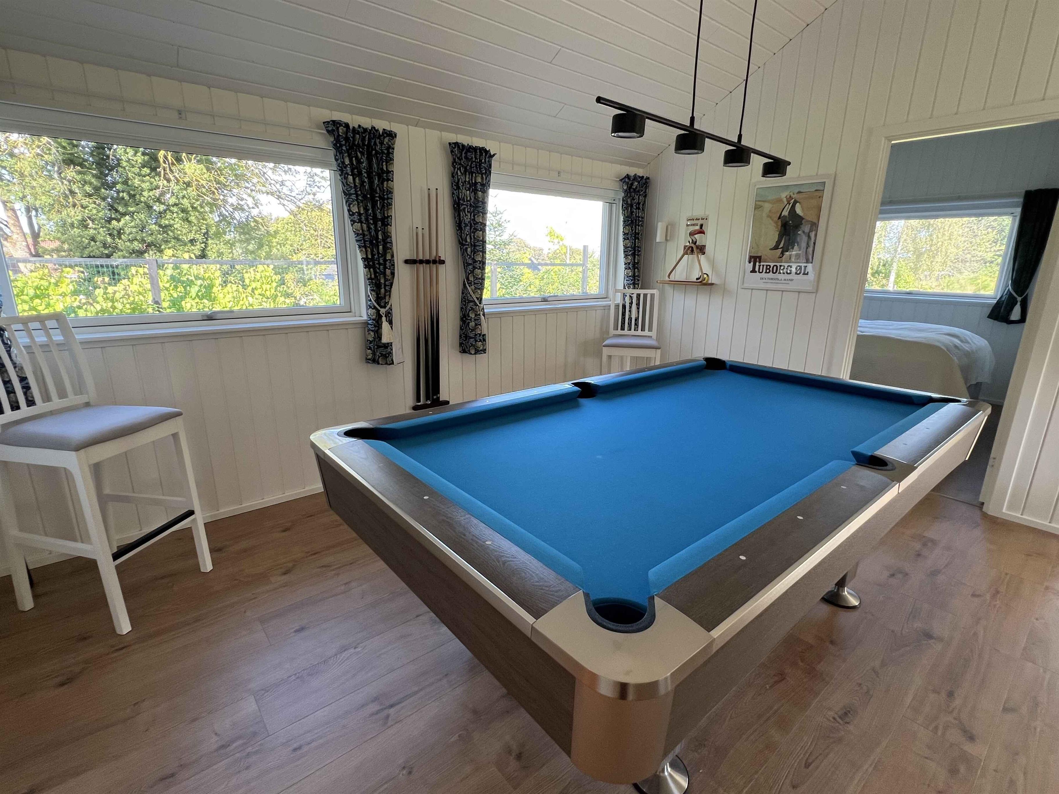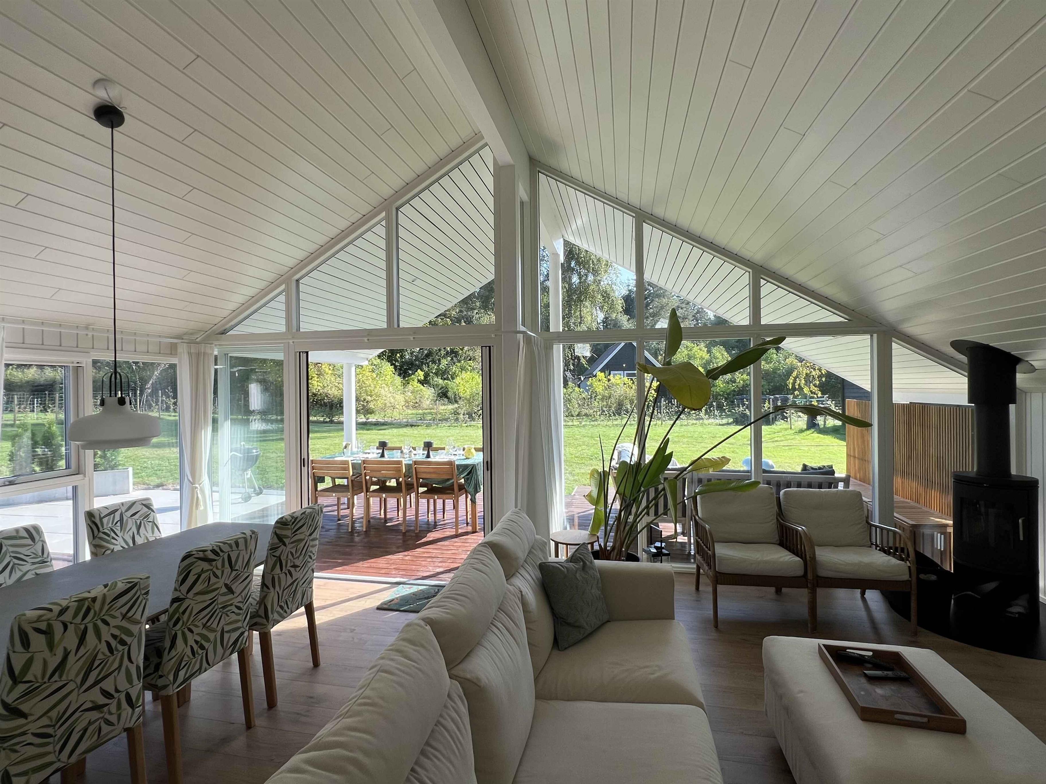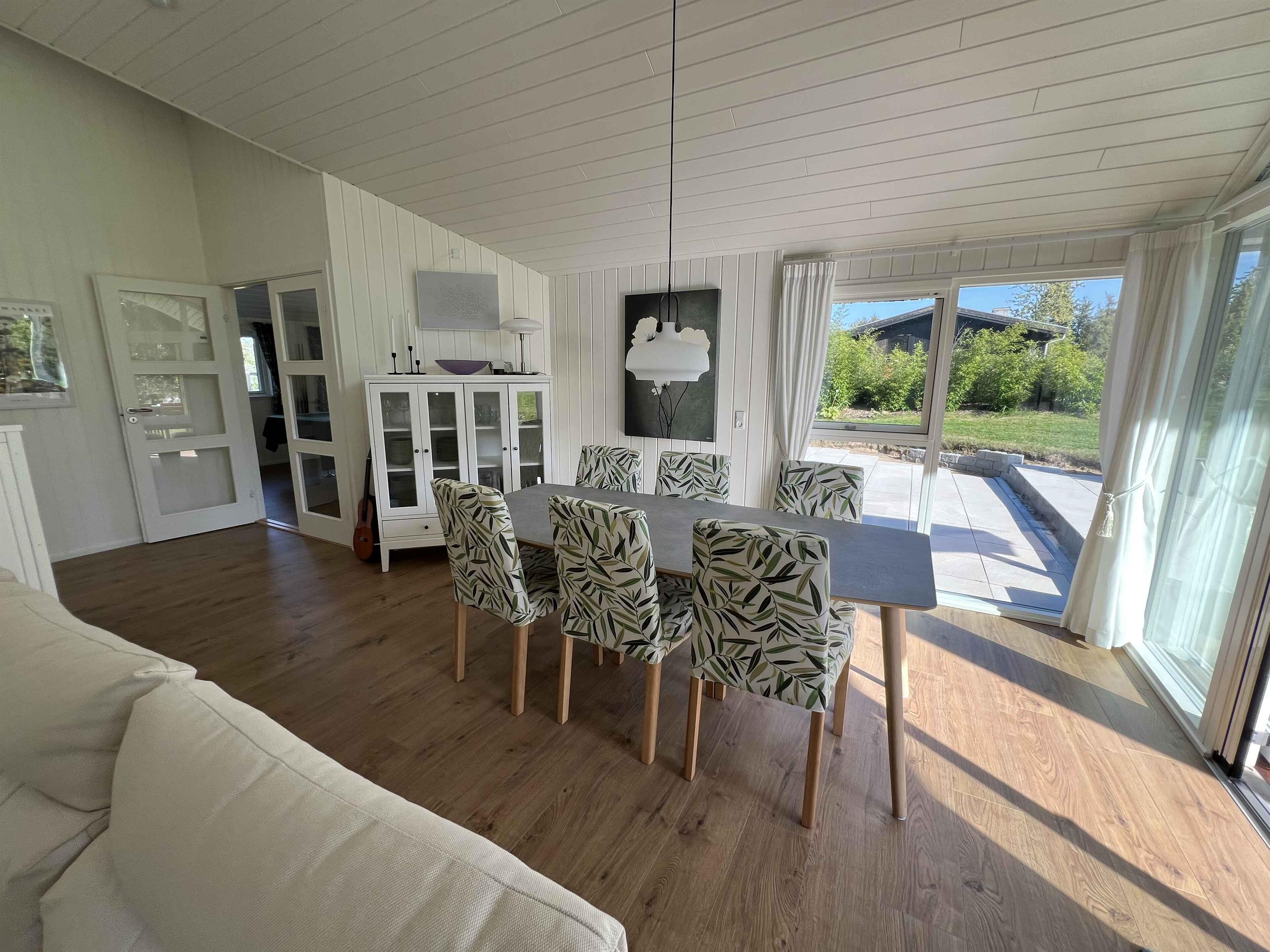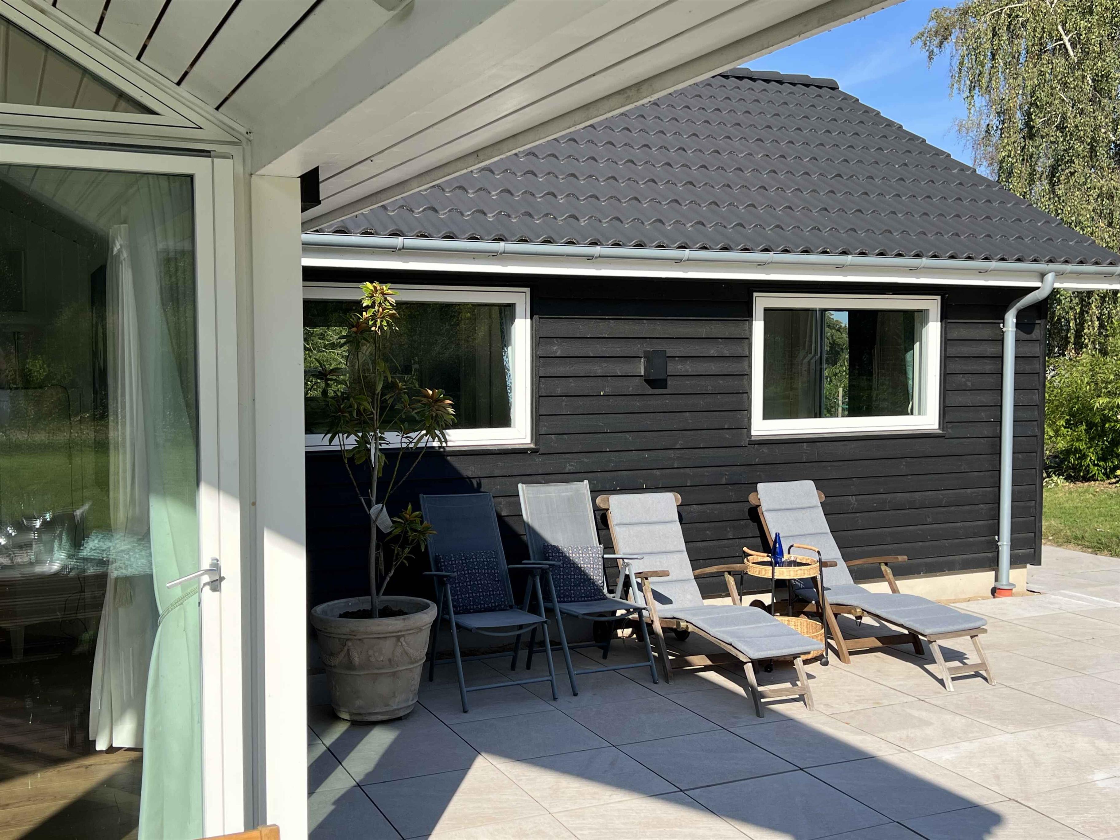 Ecovenligt sommerhus fra 2023 nær bugt & strand, 8 pers. 4 værelser (3 dob./2 enk), 2 badeværelser (sauna/spa/vaskemaskine/tørretumbler), gulvvarme, aktivitetsrum. Solrig grund med terrasse, grill og spil. Veludstyret køkken, hyggekrog, elbil-oplader