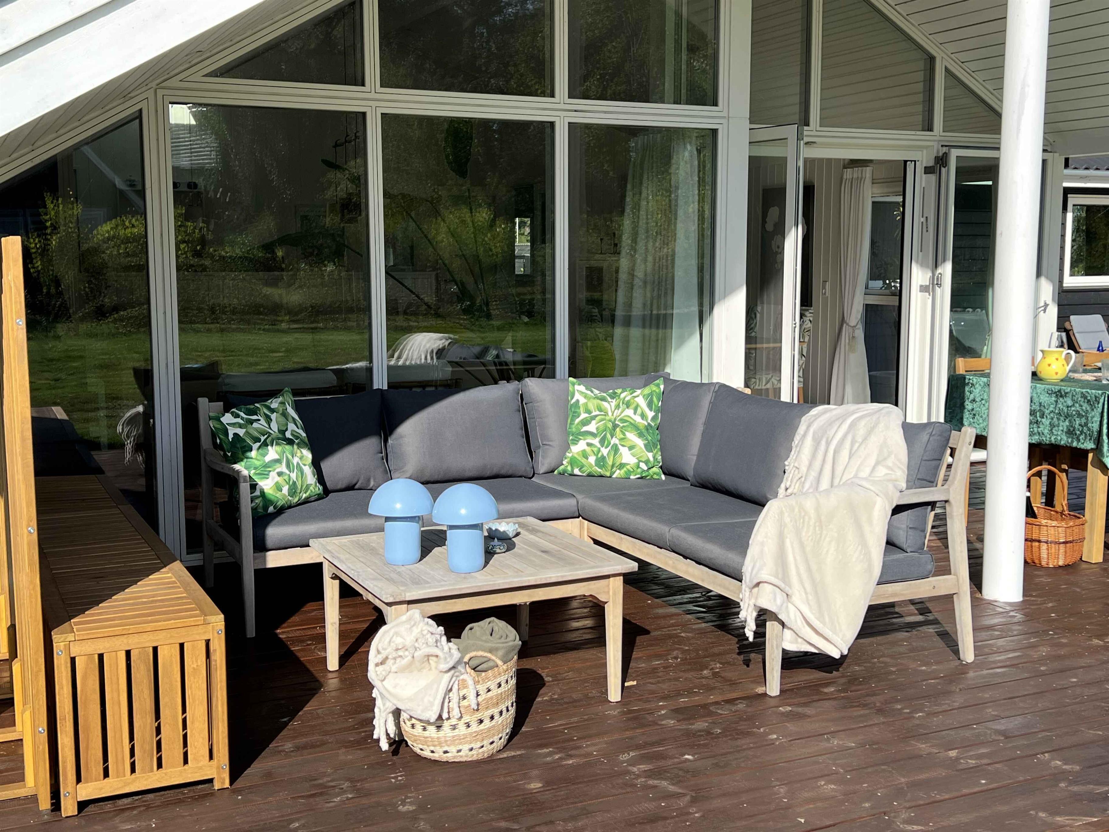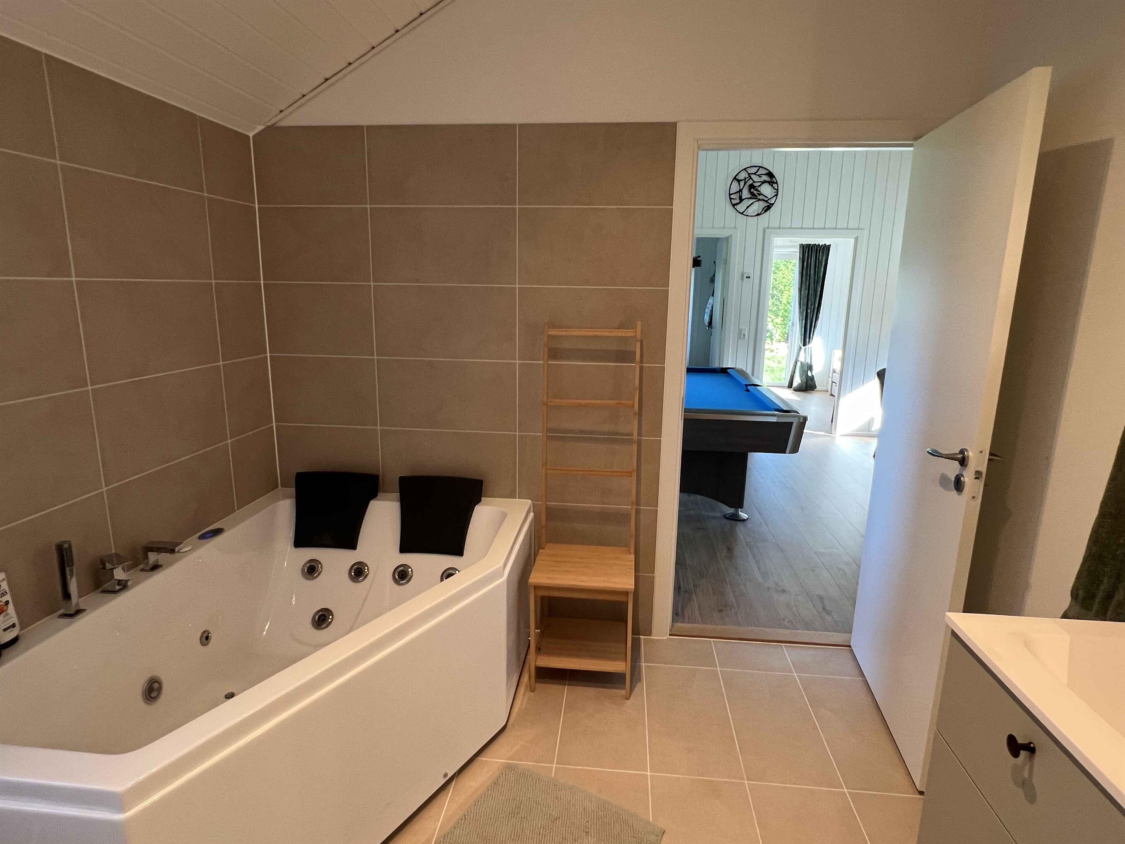Rummeligt og nybygget feriehus med sauna, spa, aktivitetsrum og solrig terrasse nær natur og strand.