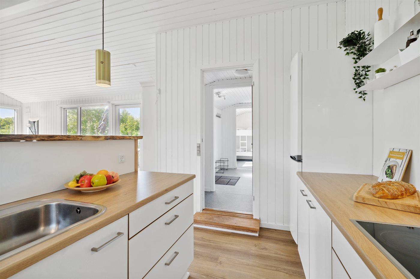 Køkkenet er udstyret med 1 køleskab. Der er 4 keramiske kogeplader, varmluftovn, mikrobølgeovn samt opvaskemaskine.
