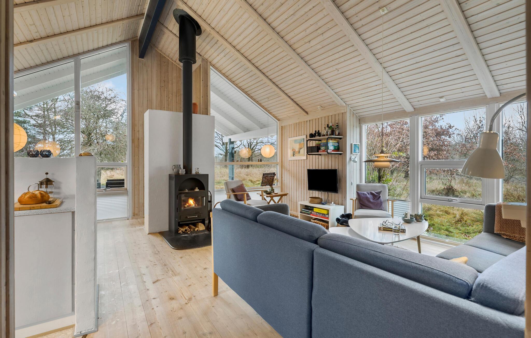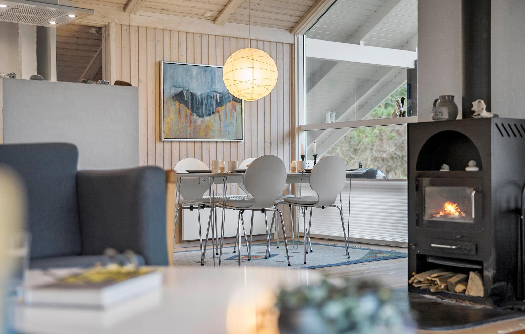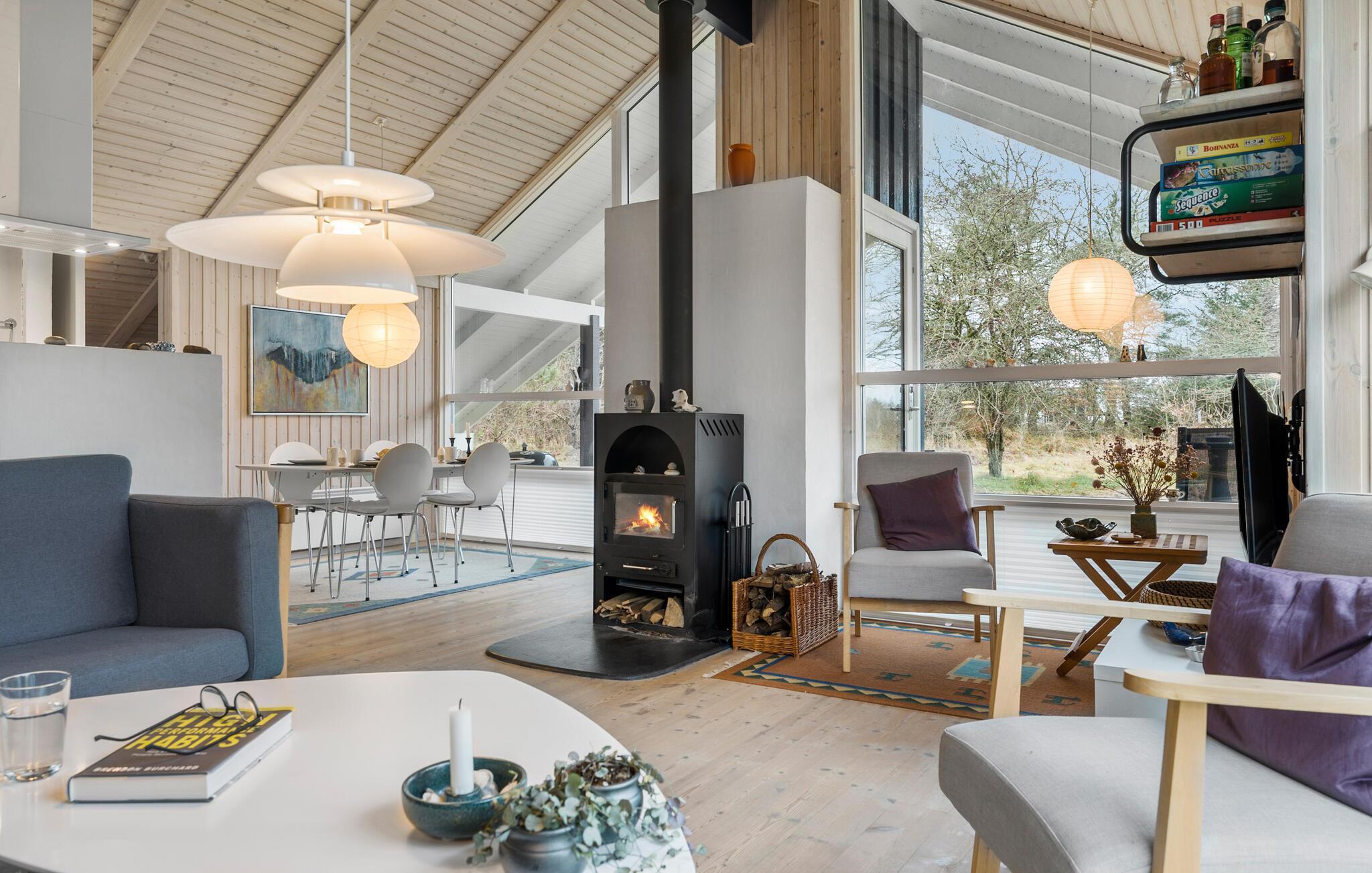 Lad jer fortrylle af charmen ved dette hyggelige sommerhus og hold en dejlig ferie på Lynderup Strand ved Hjarbæk Fjord. Så snart I træder ind i huset, vil I blive imponeret over den lyse og moderne indretning. Den åbne opholdsstue med højt til loftet i træ og store vinduespartier skaber en indbydende atmosfære. Find jer godt til rette i de komfortable sofaer foran pejsen og nyd den hyggelige varme på kølige aftener. Køkkenet har alt hvad I skal bruge til at tilberede lækre måltider, mens spisepladsen giver plads til samvær.