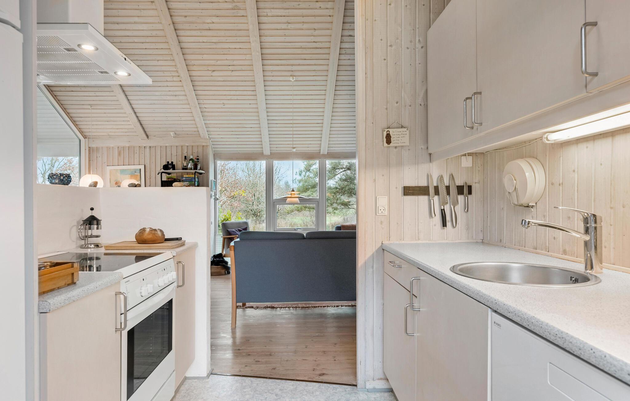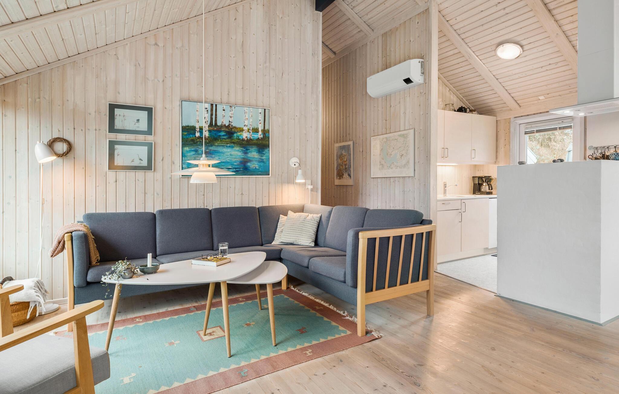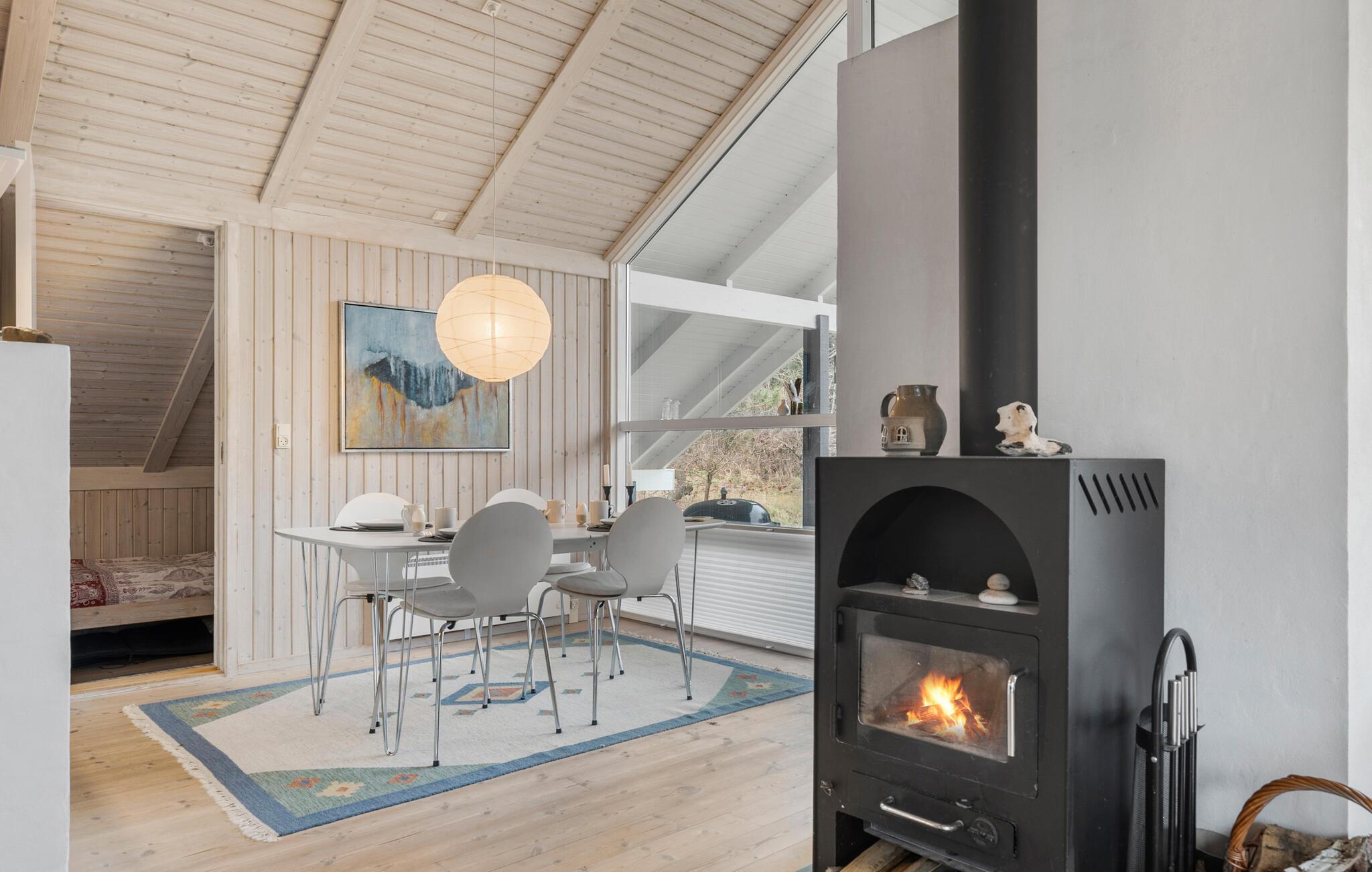 Lad jer fortrylle af charmen ved dette hyggelige sommerhus og hold en dejlig ferie på Lynderup Strand ved Hjarbæk Fjord. Så snart I træder ind i huset, vil I blive imponeret over den lyse og moderne indretning. Den åbne opholdsstue med højt til loftet i træ og store vinduespartier skaber en indbydende atmosfære. Find jer godt til rette i de komfortable sofaer foran pejsen og nyd den hyggelige varme på kølige aftener. Køkkenet har alt hvad I skal bruge til at tilberede lækre måltider, mens spisepladsen giver plads til samvær.