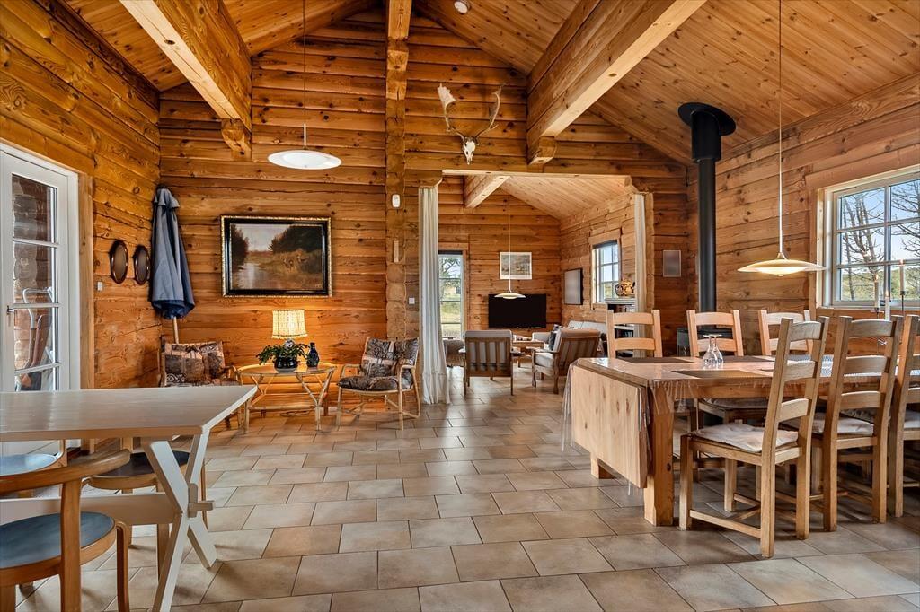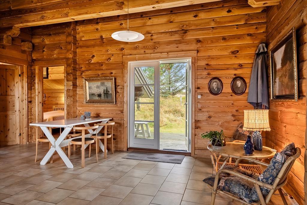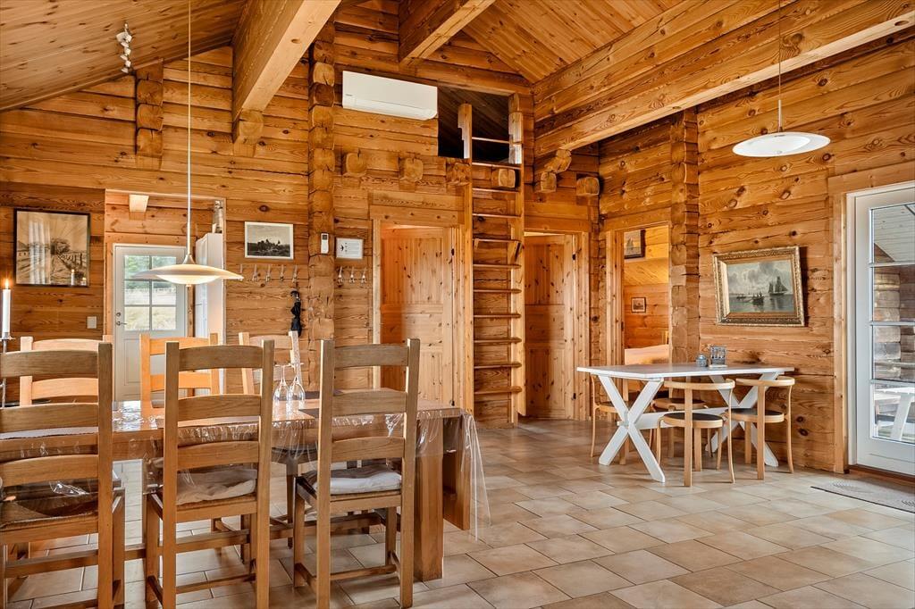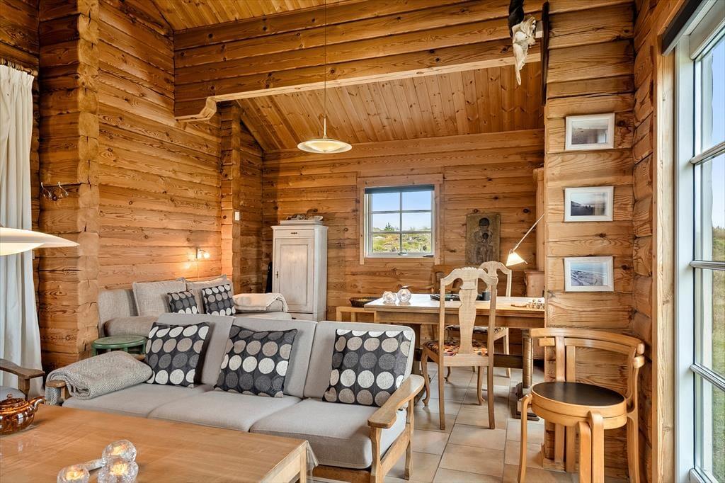 Når du træder indenfor i dette hyggelige bjælkehus, bliver du mødt af en skøn rummelighed, der fremhæves af de synlige bjælker og den imponerende kip. Denne unikke indretning skaber en fantastisk rumfornemmelse og en autentisk, naturlig atmosfære, hvor du straks føler dig hjemme. Husets praktiske og rummelige spisestue og opholdsstue giver mulighed for både hyggelige måltider og afslapning i en stilfuld, men samtidig uformel atmosfære. Husets sauna er med til at sikre, at man i høj grad kan slappe af og regenerere i sin ferie. Den energivenlige opvarmning, der kombinerer luft-til-luft varmepumpe, gulvvarme og en hyggelig brændeovn, sikrer, at du har det dejligt lunt året rundt – ideelt til de kølige dage, hvor du kan sidde og nyde varmen fra ilden og den rolige stemning, der fylder huset.