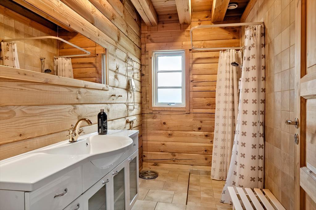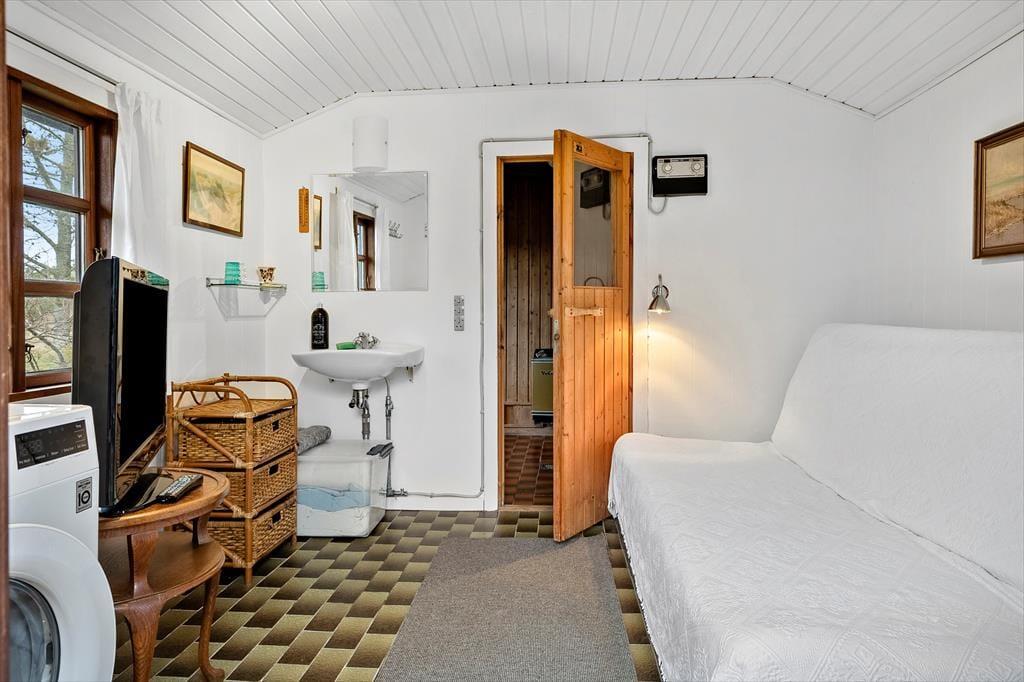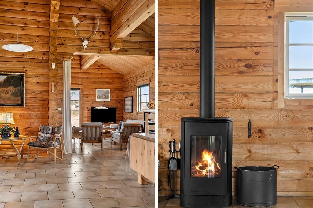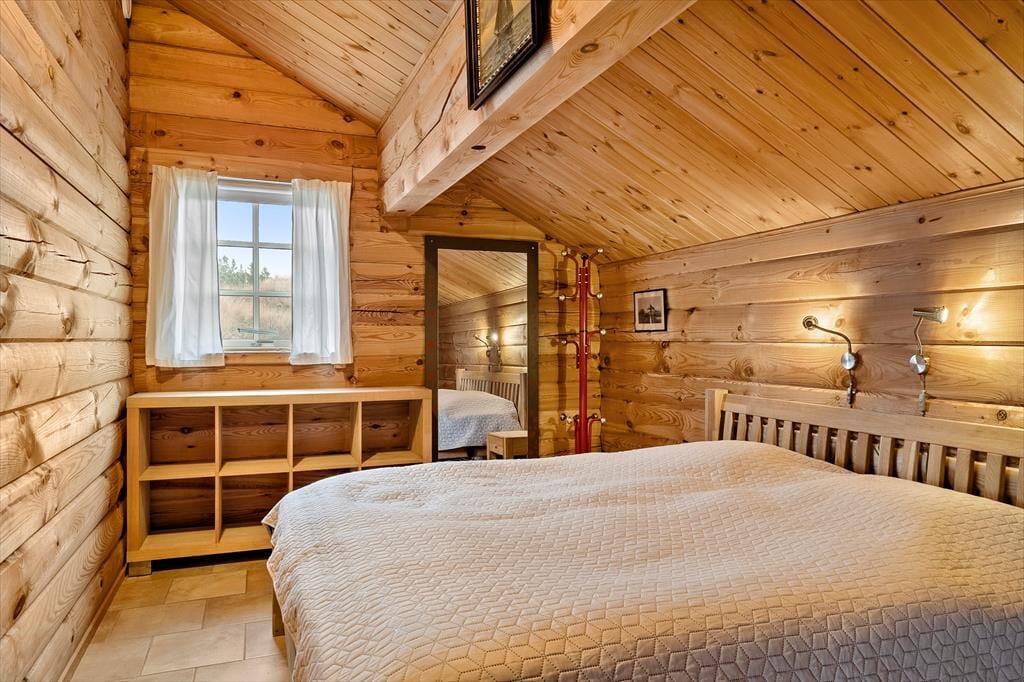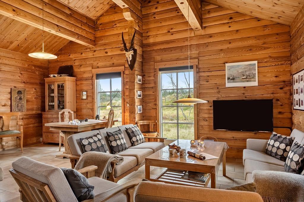 Når du træder indenfor i dette hyggelige bjælkehus, bliver du mødt af en skøn rummelighed, der fremhæves af de synlige bjælker og den imponerende kip. Denne unikke indretning skaber en fantastisk rumfornemmelse og en autentisk, naturlig atmosfære, hvor du straks føler dig hjemme. Husets praktiske og rummelige spisestue og opholdsstue giver mulighed for både hyggelige måltider og afslapning i en stilfuld, men samtidig uformel atmosfære. Husets sauna er med til at sikre, at man i høj grad kan slappe af og regenerere i sin ferie. Den energivenlige opvarmning, der kombinerer luft-til-luft varmepumpe, gulvvarme og en hyggelig brændeovn, sikrer, at du har det dejligt lunt året rundt – ideelt til de kølige dage, hvor du kan sidde og nyde varmen fra ilden og den rolige stemning, der fylder huset.