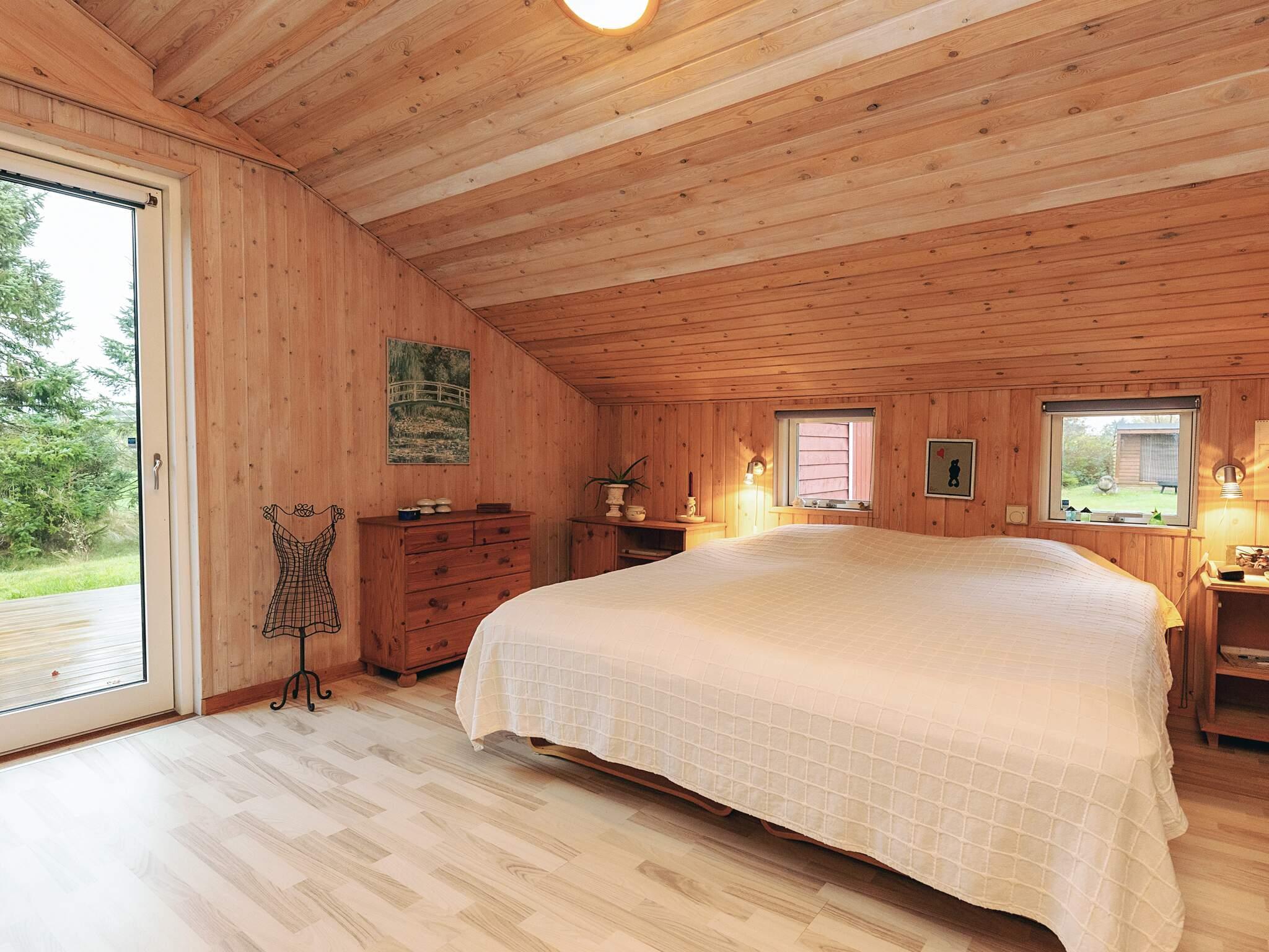 Sommerhuset har to rummelige soveværelser, hvoraf det ene har direkte udgang til en østvendt terrasse, hvor I kan nyde morgenkaffen i de første solstråler. Der er også en ny sovesofa i stuen, der kan rumme to personer. Derudover er der lyst badeværelse med bruseniche.