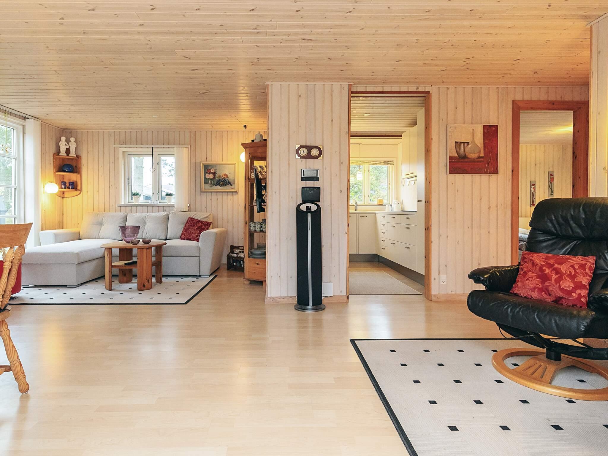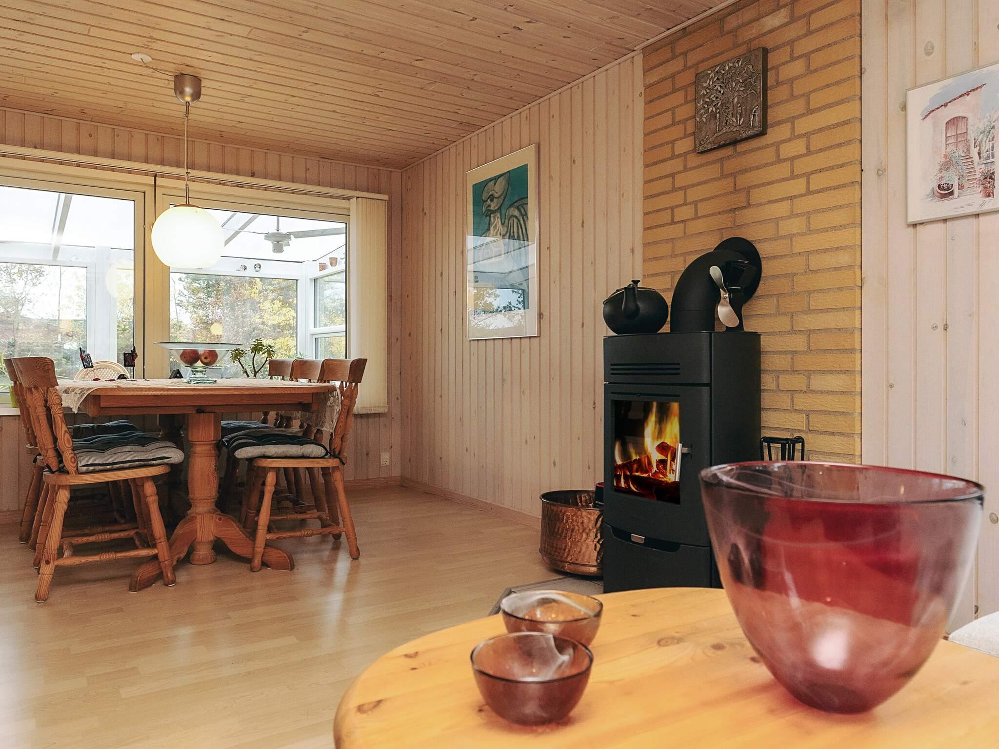 Indenfor finder du en hyggelig stue med plads til både sofahjørne og spiseplads. Stuen er et centralt samlingssted med en brændeovn, der skaber varme og stemning. Herfra er der åben forbindelse til et lyst køkken, indrettet i lyse farver og med god plads til madlavning.