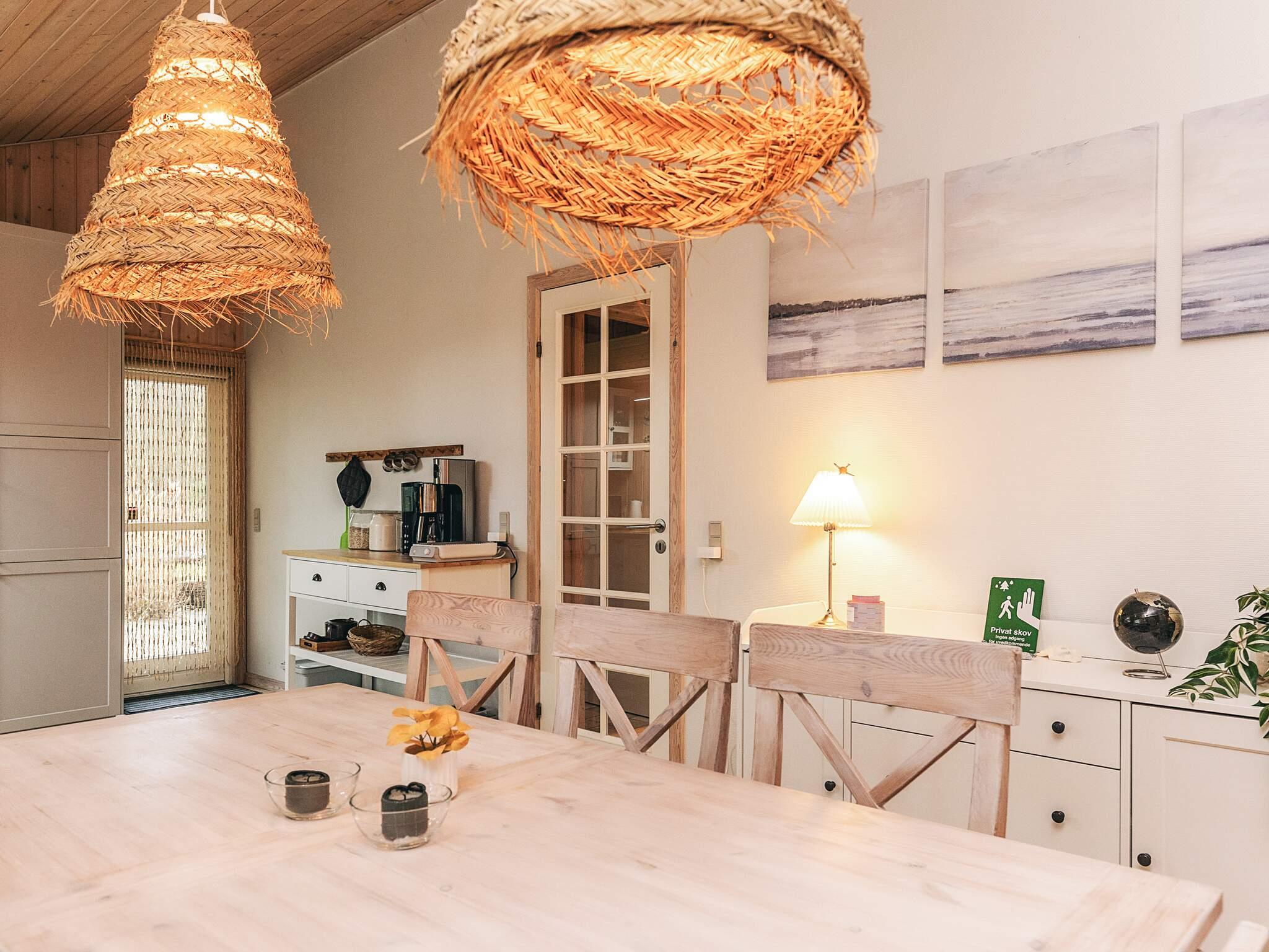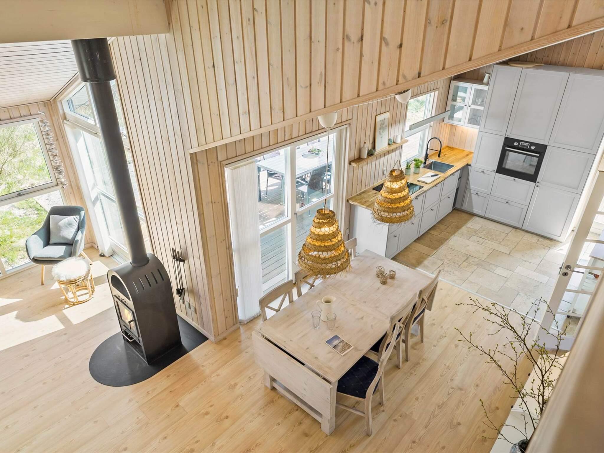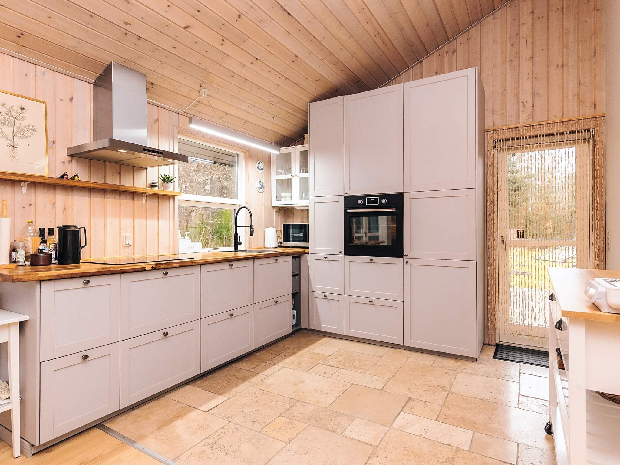 Sommerhuset er nyistandsat og har fået et flot nyt køkken i klassisk sommerhusstil. Det åbne køkken/alrum og stue er husets hjerte og har højt til loftet og store vinduespartier, der lader lyset strømme ind.