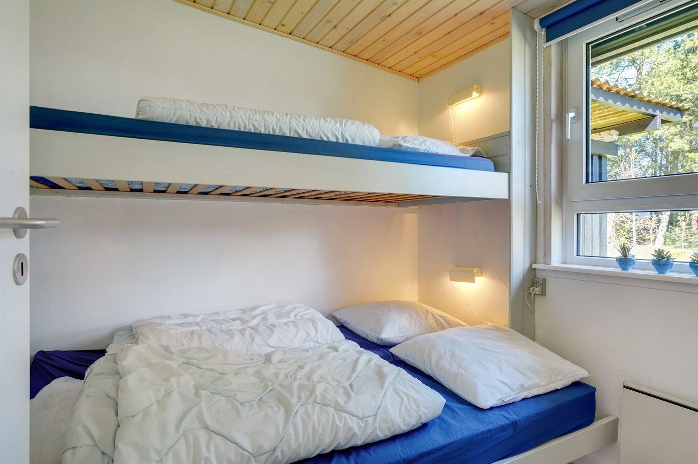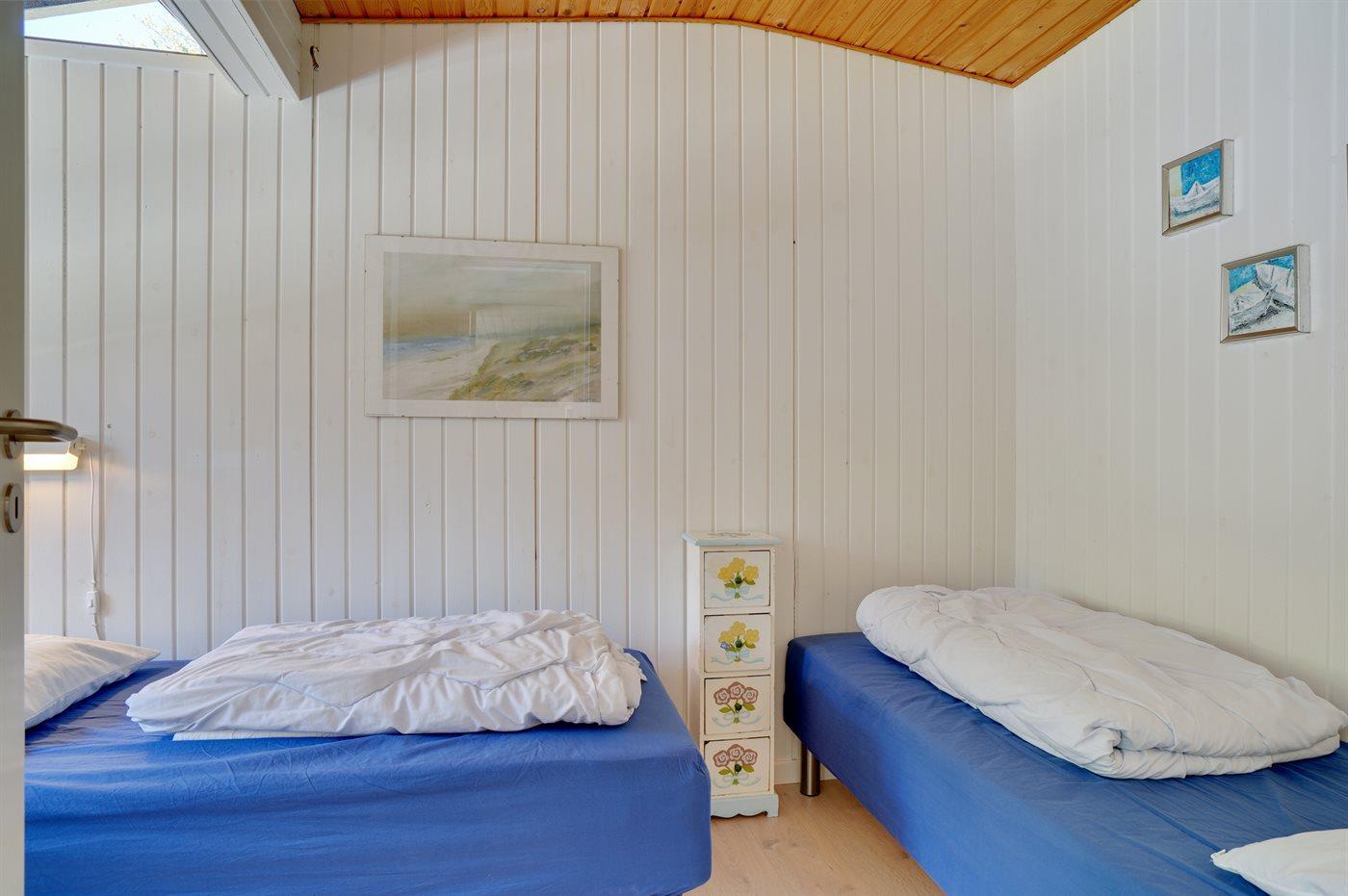 Der er i alt 4 soveværelser. Sovepladserne fordeler sig på: 6 sovepladser i dobbeltsenge. 2 sovepladser i enkeltsenge. Derudover er der 1 stk. barneseng.