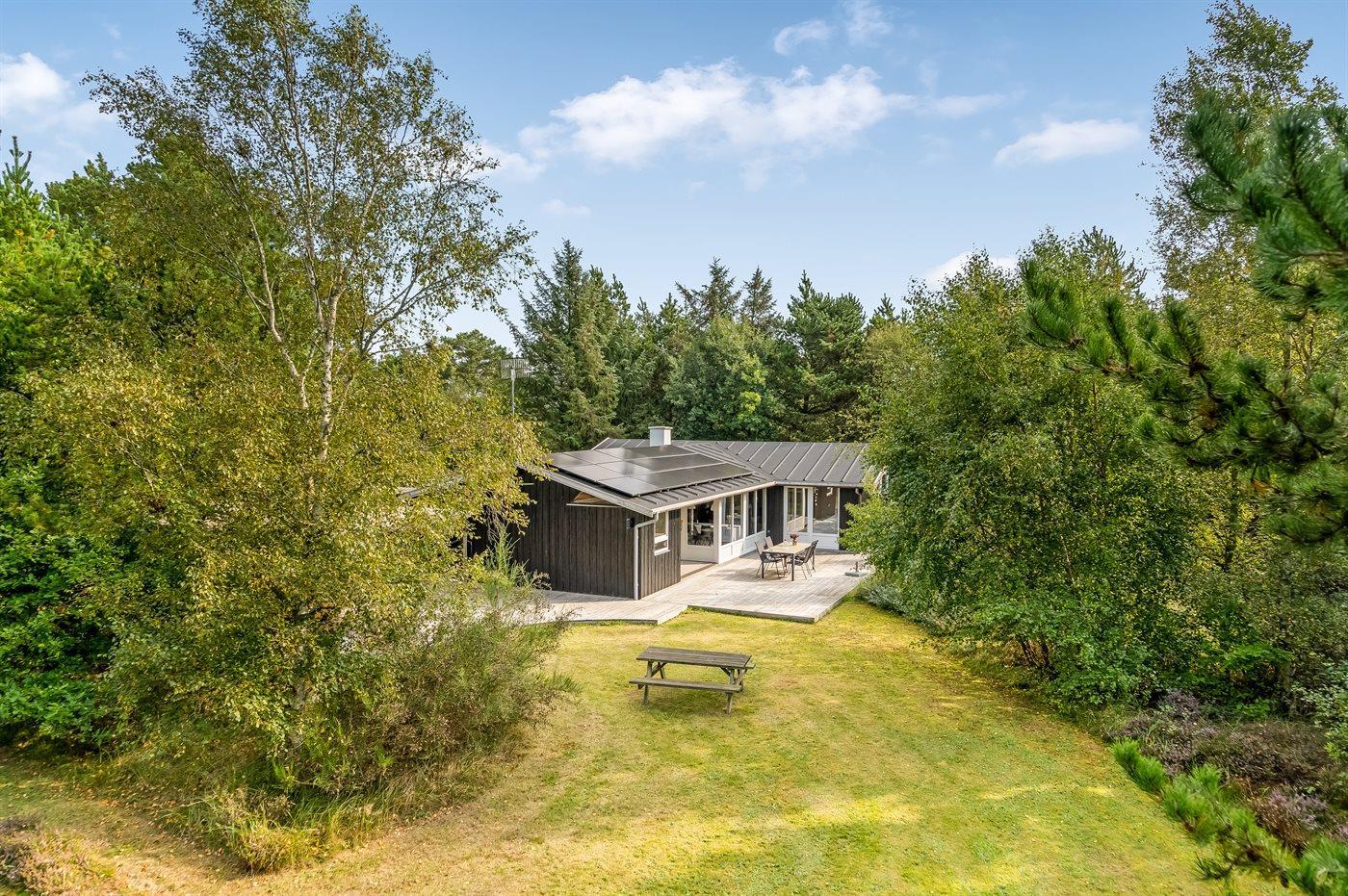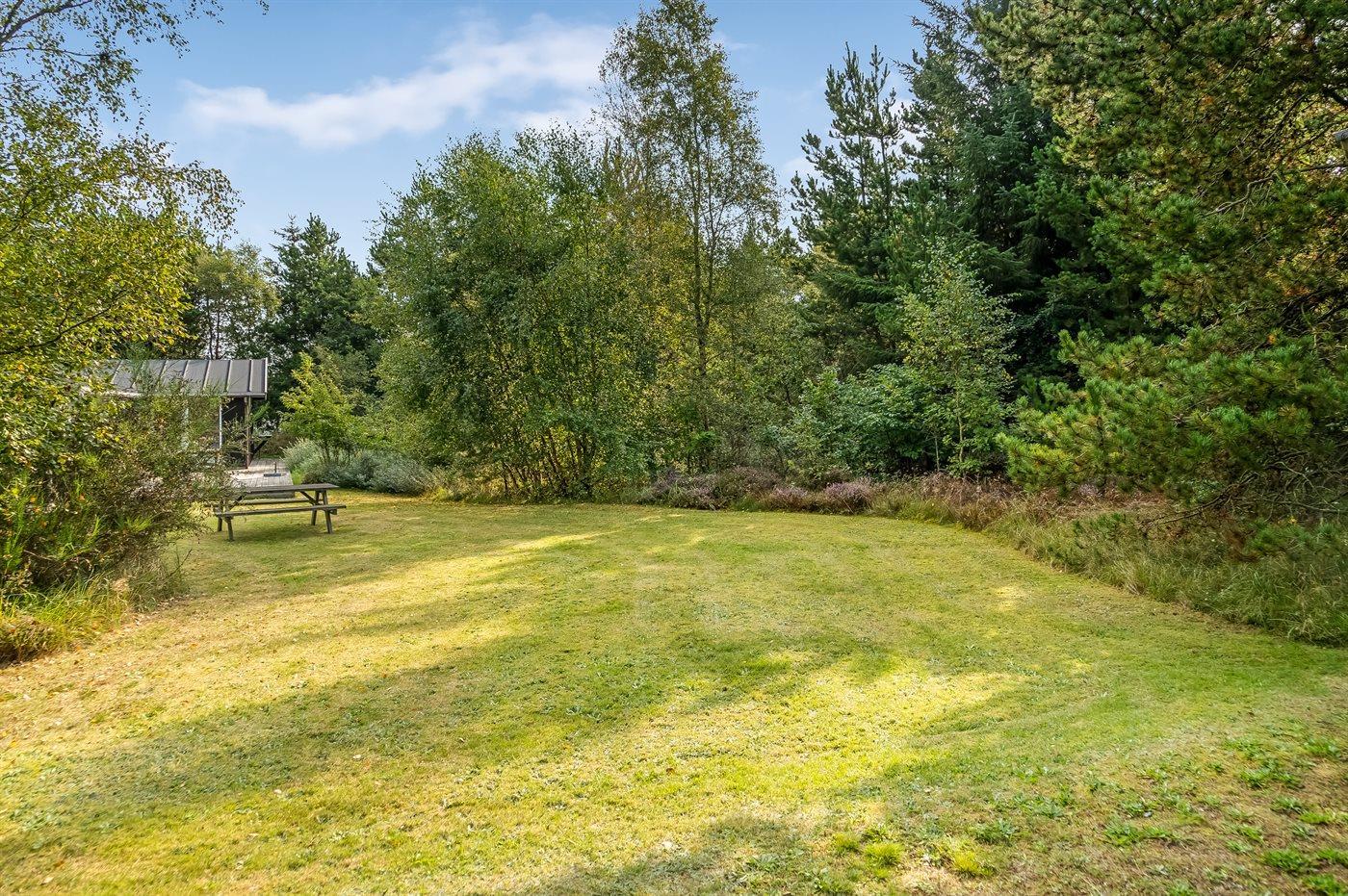 Hyggeligt sommerhus på stor naturgrund tæt ved børnevenlig sandstrand med spa og sauna.