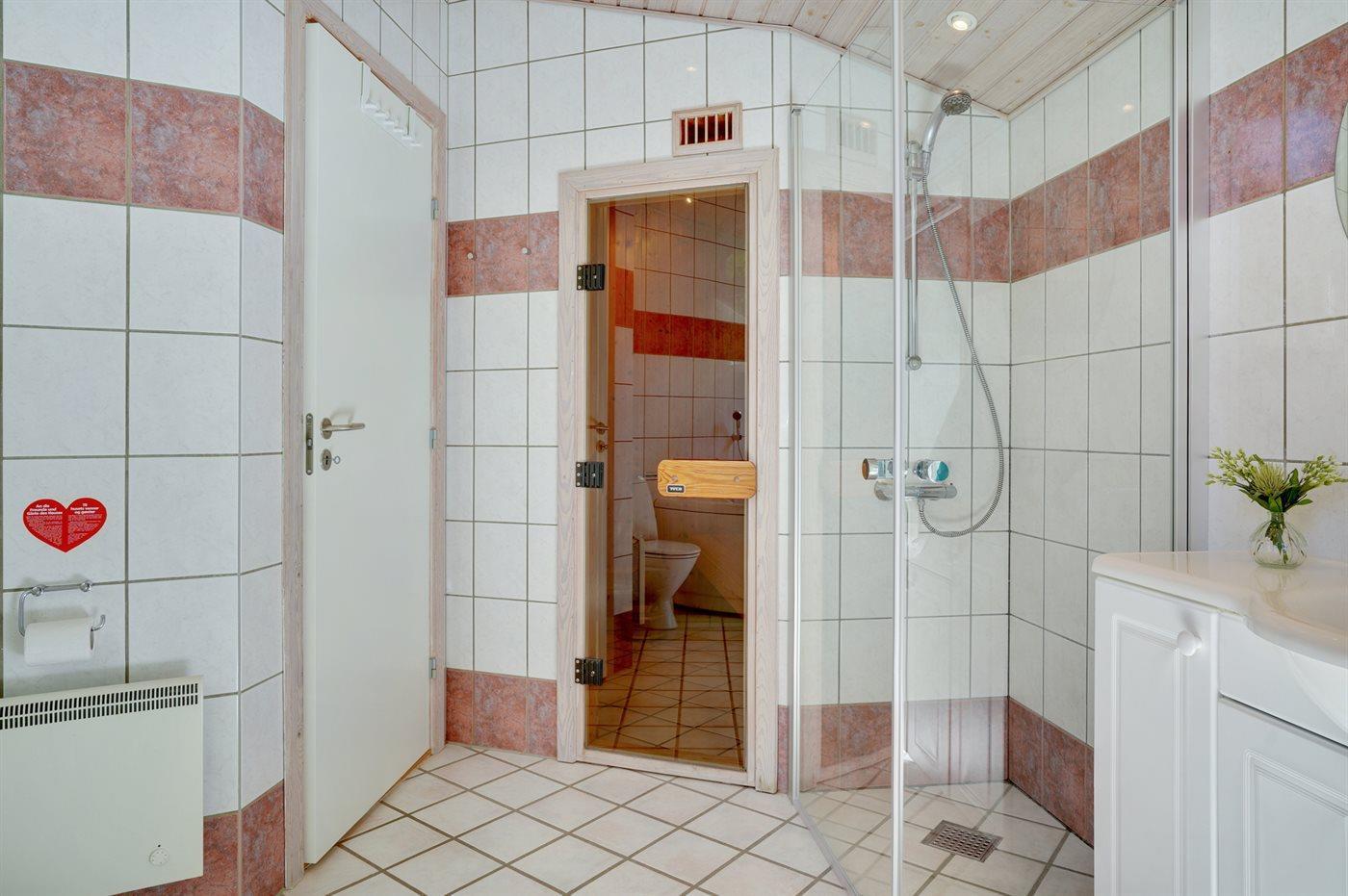 Der er 2 badeværelser med bruseniche og 2 toiletter. Der er gulvvarme på 2 badeværelser. I saunaen er der mulighed for afslapning.