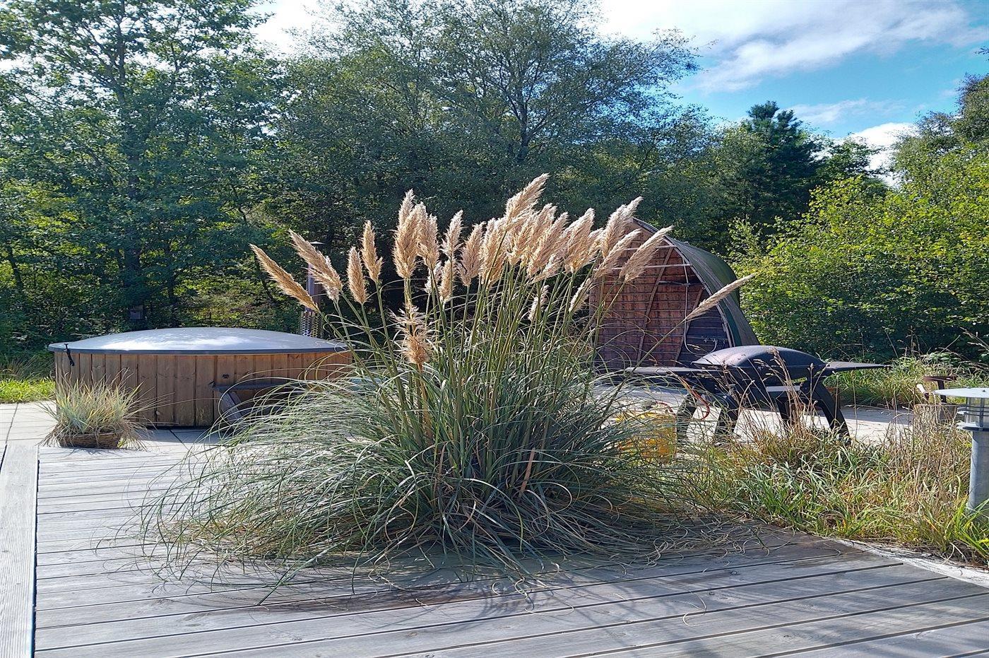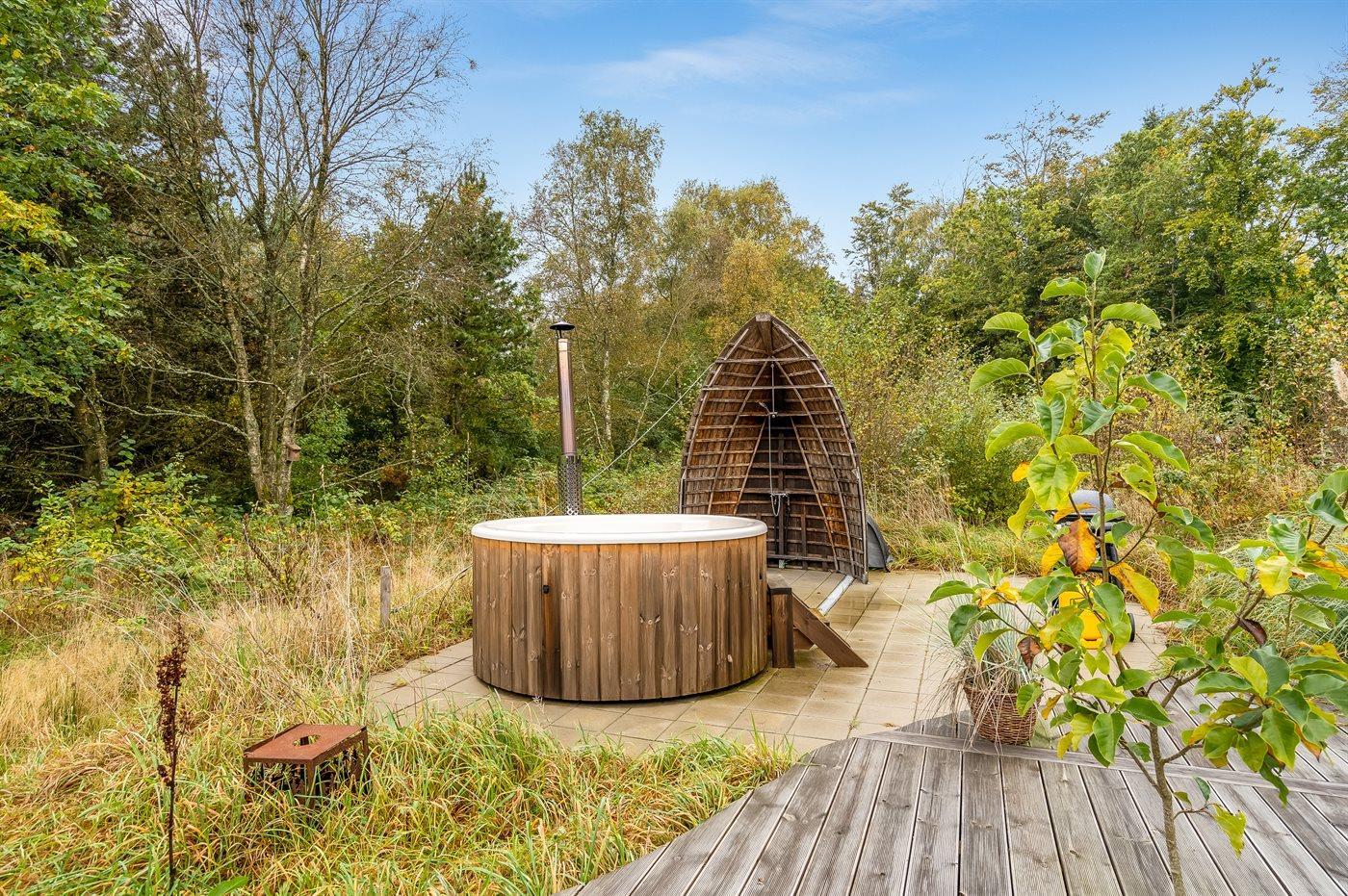 Udendørs findes der en imponerende og delvist overdækket terrasse, der går hele vejen rundt om huset. Her findes der solvogne, som er perfekte til afslappende timer og der findes ydermere et vildmarkskar, hvor I kan nyde varme bade under åben himmel.
