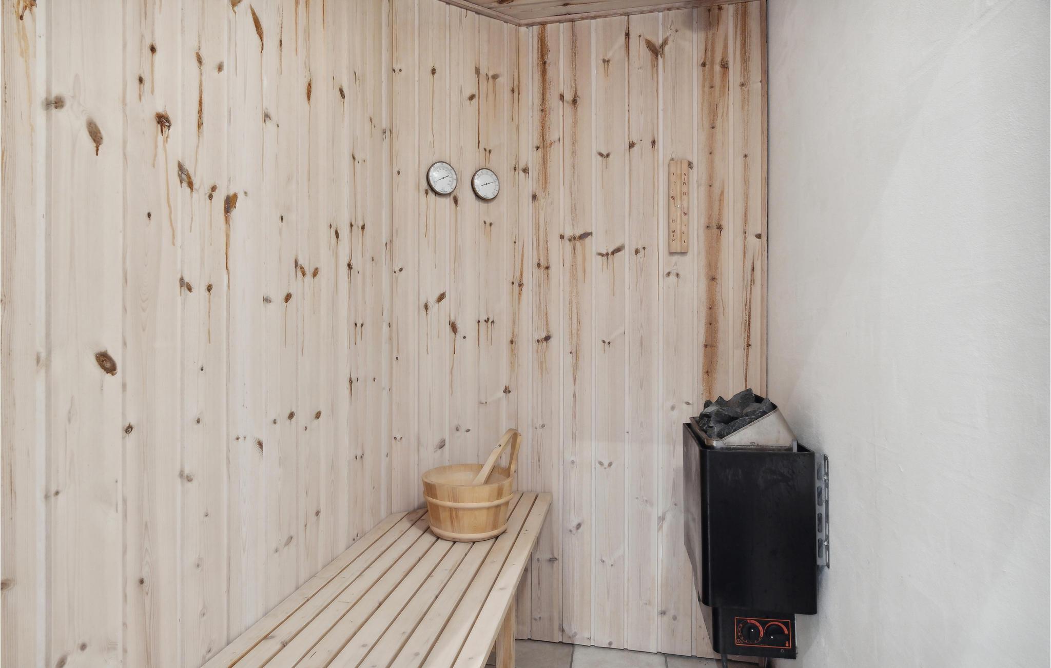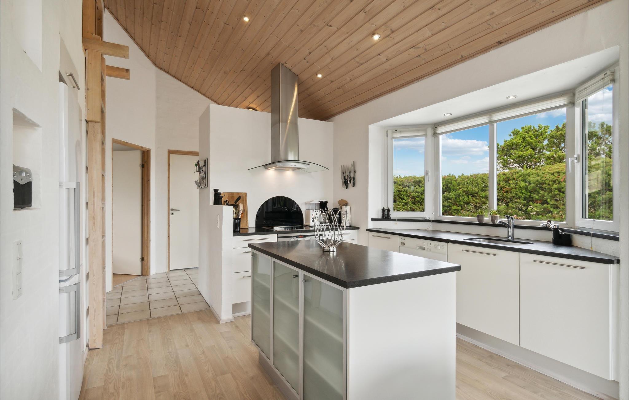 Med en attraktiv beliggenhed, kun få skridt fra klitterne og sandstranden, finder I dette fantastiske feriehus. Det er smagfuldt indrettet og danner de ideelle rammer for en ubekymret ferie med fred, komfort og velvære. Tilbered jeres yndlingsretter sammen i det store køkken, mens I nyder udsigten over omgivelserne. I den store, lyse stue vil I tilbringe mange hyggelige timer med dem, I holder af, hvad enten I spiller brætspil eller læser den udvalgte feriebog. Efter en dag i den friske luft kan I finde hyggelig varme i saunaen og få masseret musklerne i boblebadet. Den rummelige træterrasse går næsten rundt om hele huset og giver ideelle muligheder for at slappe af og solbade i løbet af dagen. De små kan lege på naturgrunden, og der er også et shelter, hvis man vil overnatte udenfor med kig til stjernerne.