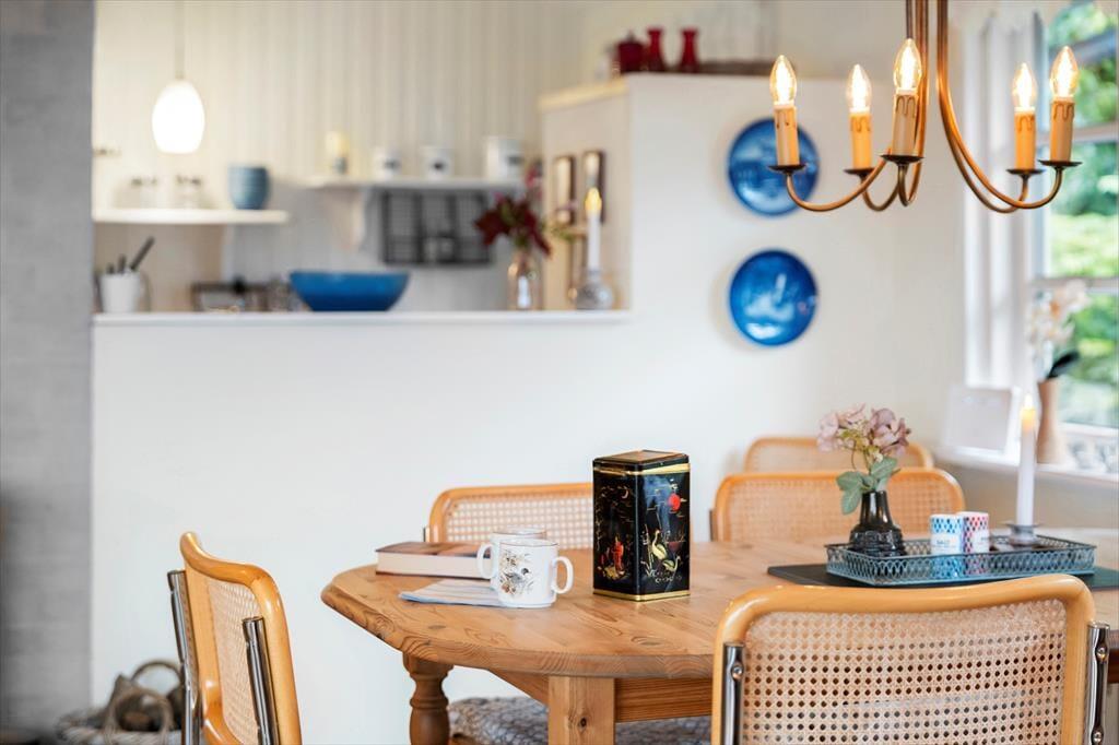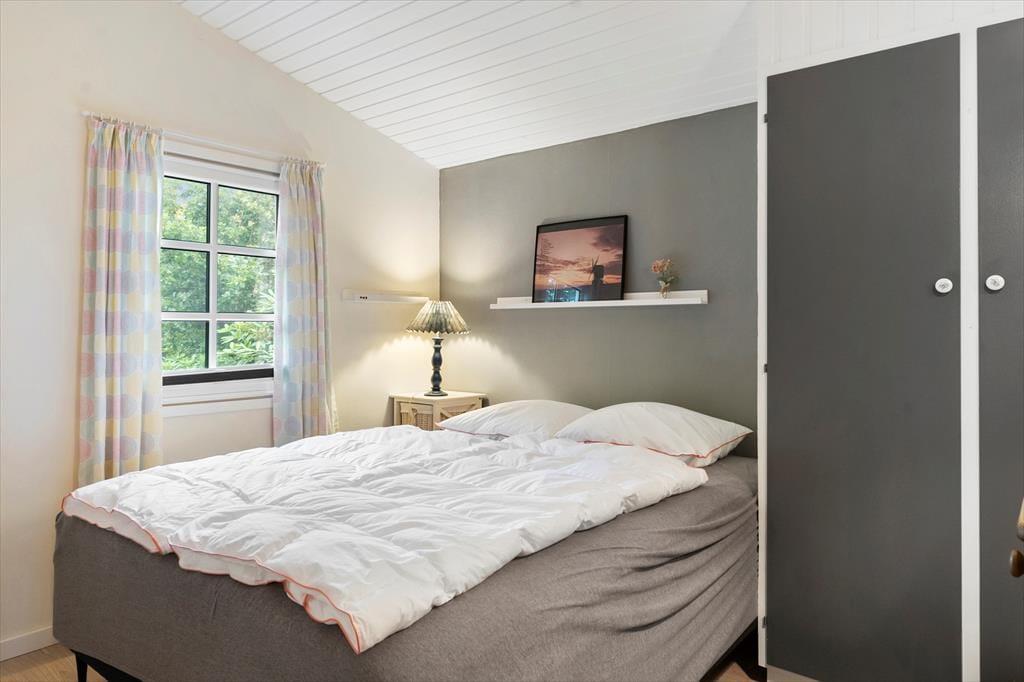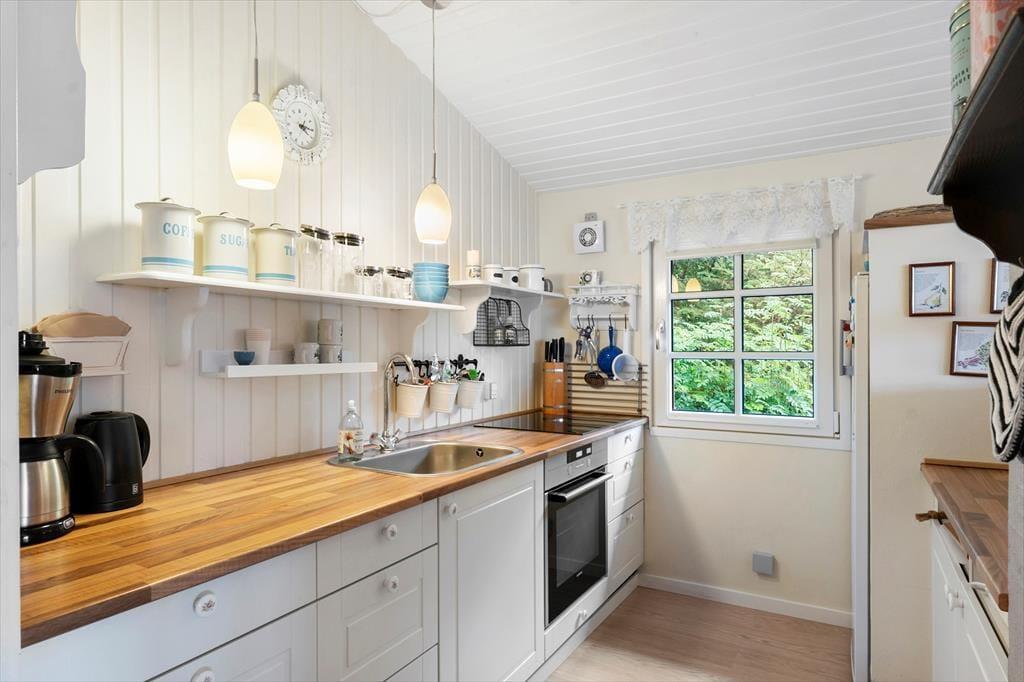 Det røde træsommerhus har en velgennemtænkt planløsning på 50 m2, og rummene fremstår pæne og velholdte med mange moderne detaljer. For eksempel er der wi-fi og fladskærms-tv med Chromecast inden døre – men hvis du vil surfe på internettet eller streame serier, er du dog nødt til at kunne fjerne blikket fra de betagende fjordomgivelser, der breder sig lige udenfor vinduerne. Udsigten til vandet og den kønne kyststrækning kan nydes fra både opholdsstuen og den tilstødende udestue, og et meget smukkere bagtæppe om ferielivet er svært at finde. Stuens brændeovn er med til at skrue op for hyggestemningen på kølige dage, mens køkkenet står klar, uanset om du vil skære vandmelon og lave is kaffe eller diske op med noget mere nærende. Soveværelser er der to af, så huset kan passende rumme en familie på fire.